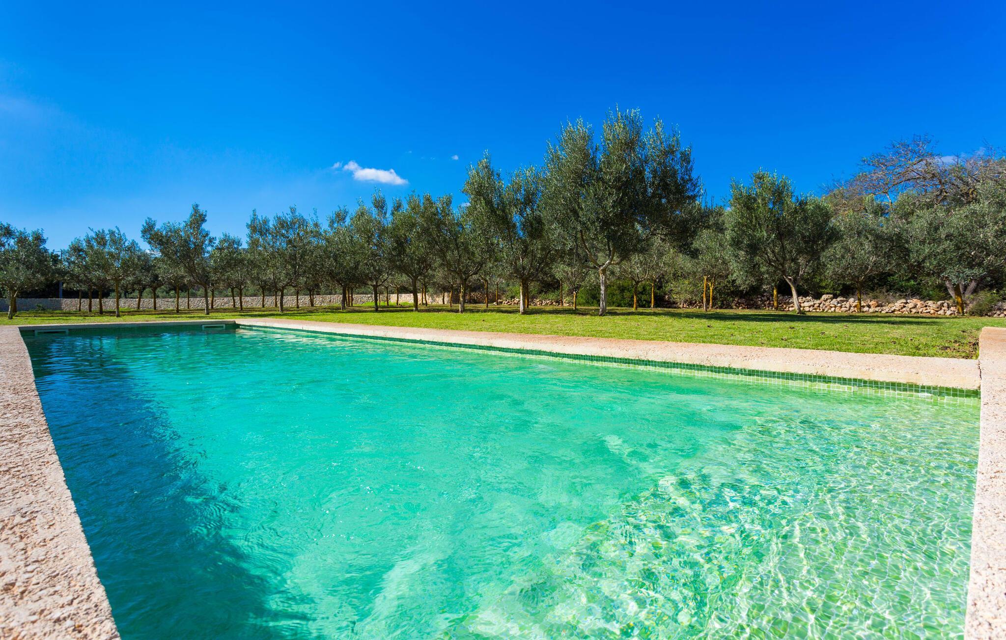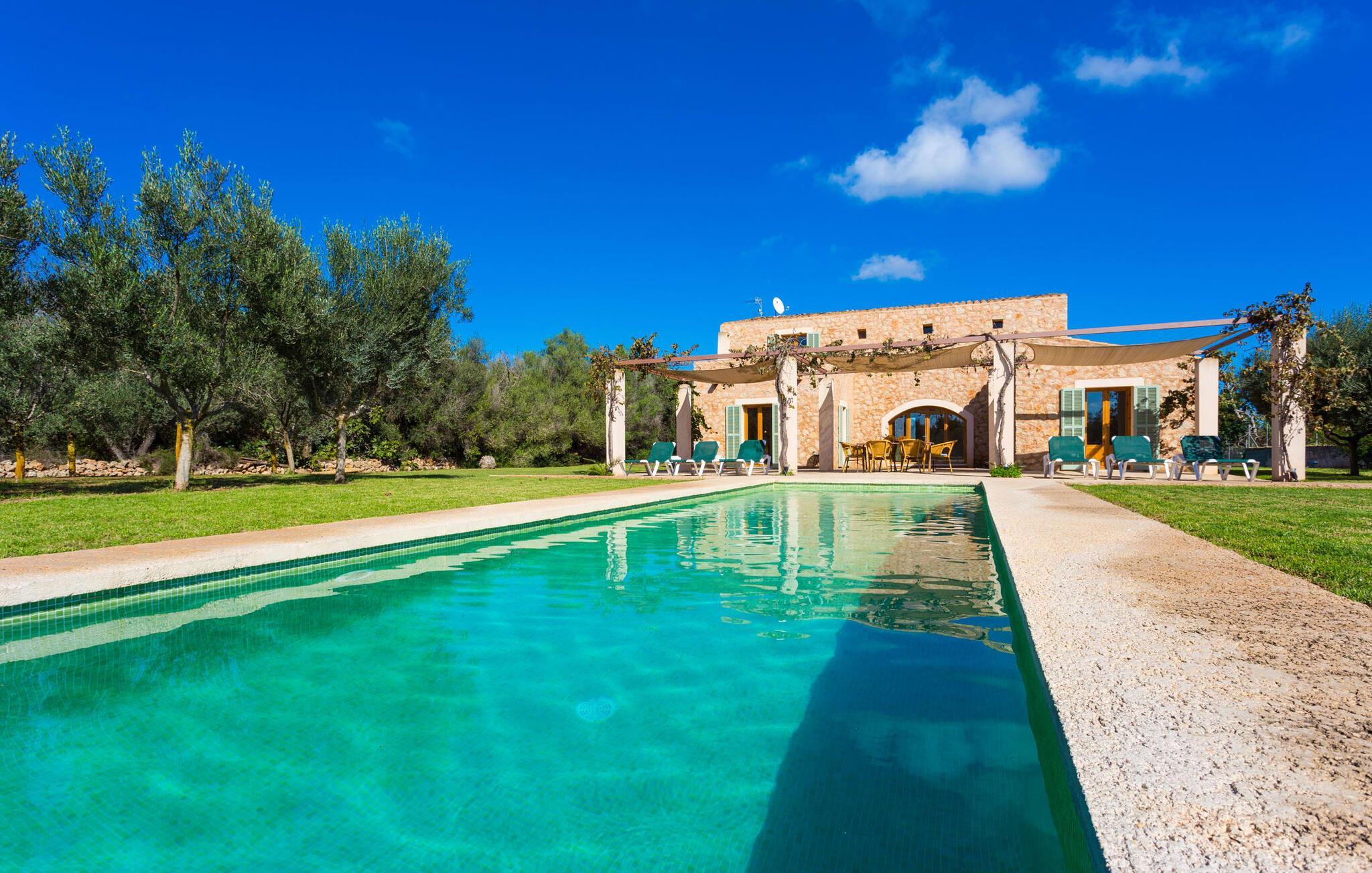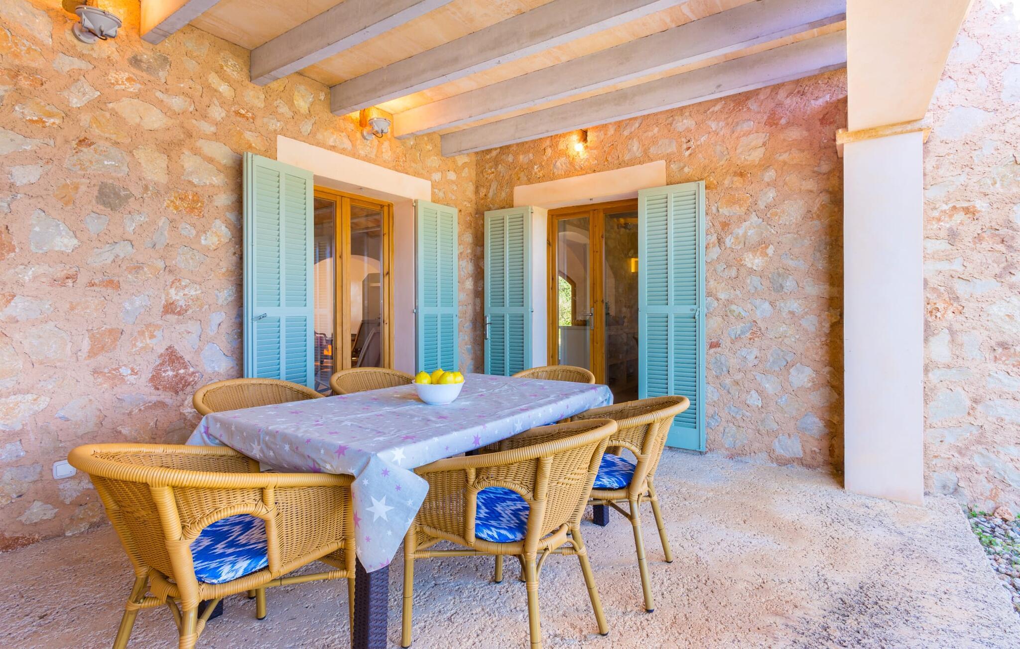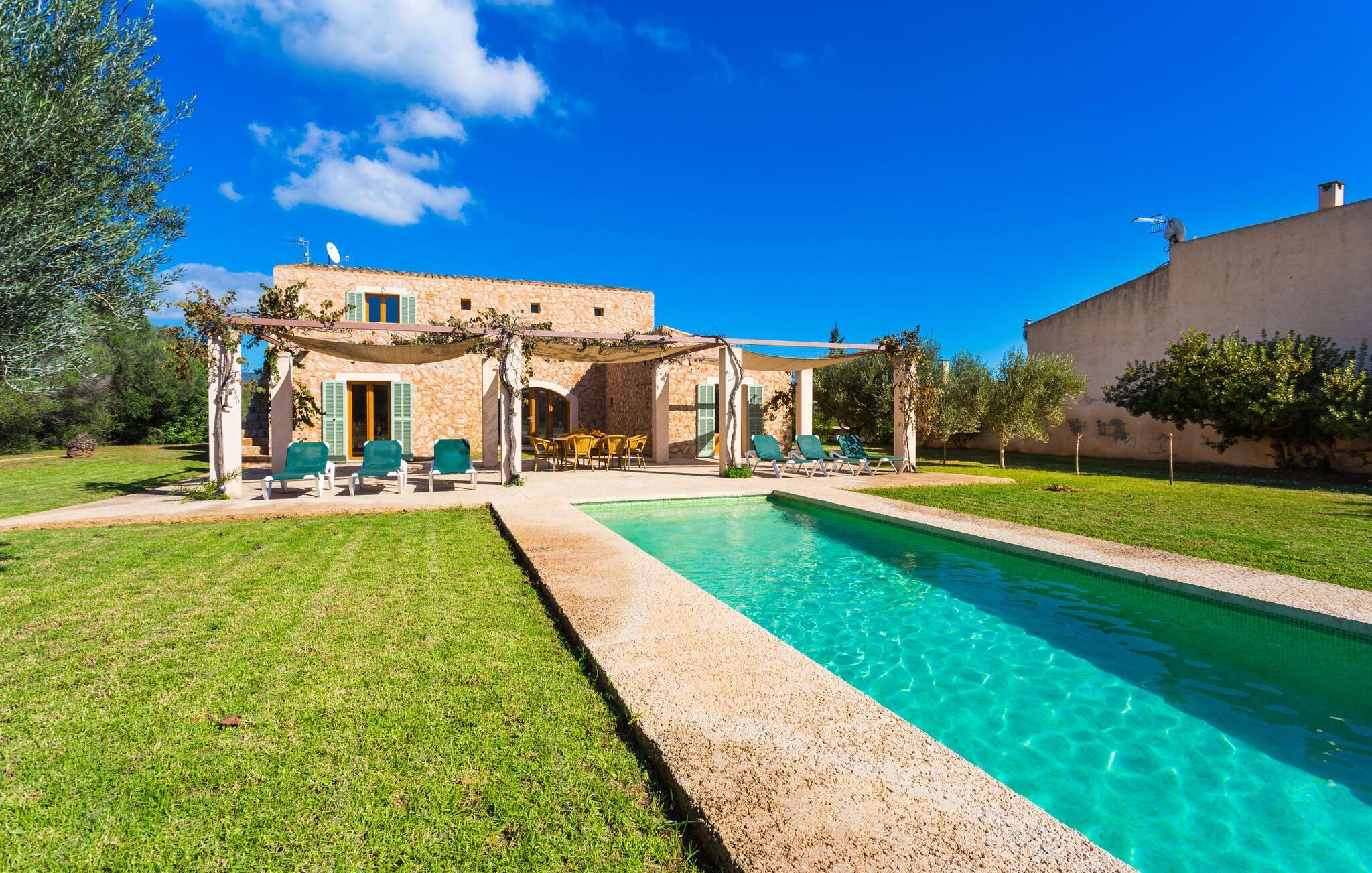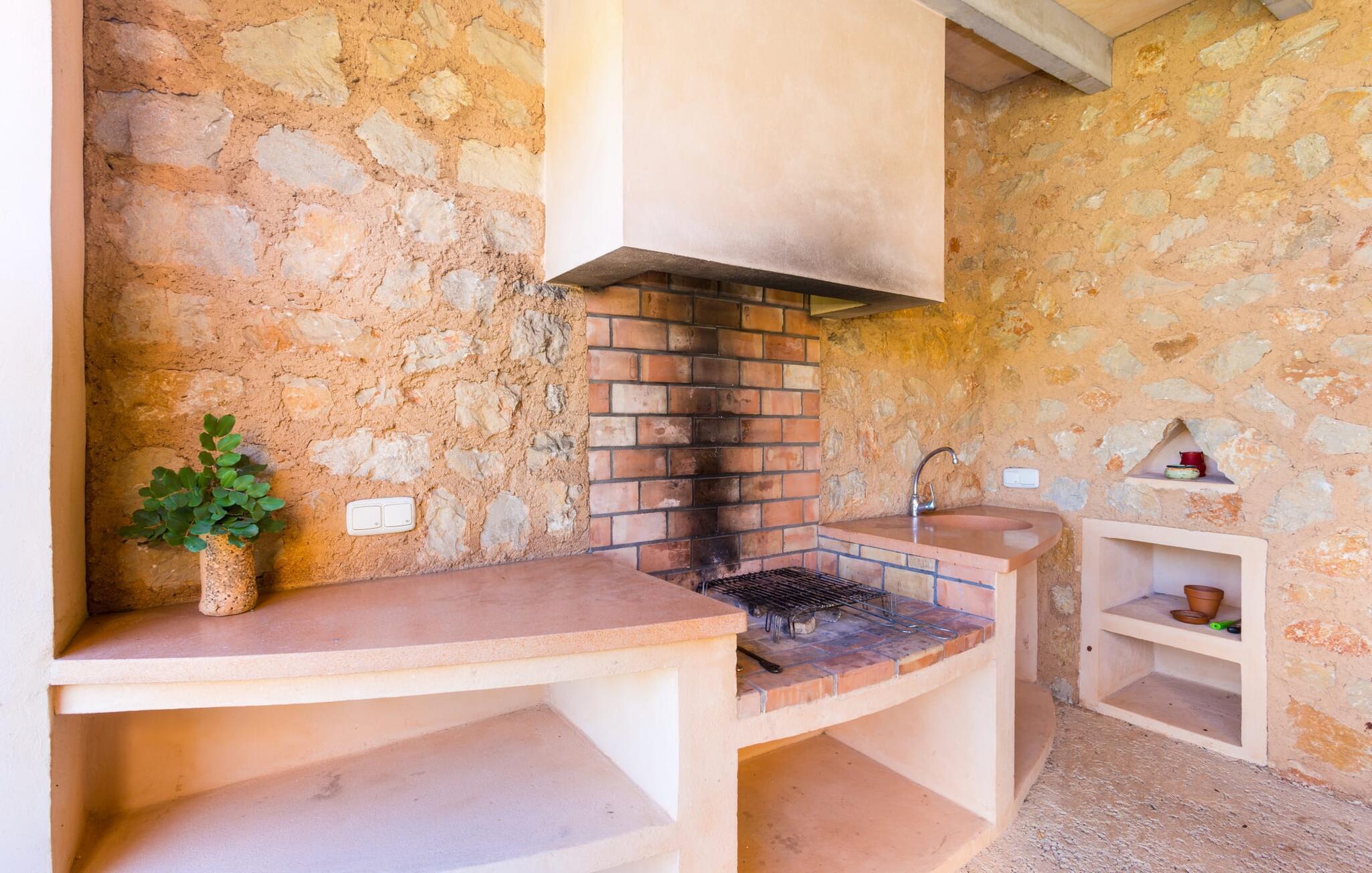 Malerisch eingebettet in die grüne Landschaft der Küstengemeinde Son Servera bietet diese moderne Villa den idealen Zufluchtsort für Urlauber, die Ruhe und Entspannung in ländlicher Umgebung suchen, aber auch über Nebenstraßen zu den schönen Badeorten der Insel fahren möchten Ostküste mit ihrem vielfältigen Angebot an Aktivitäten. Das äußerst gut erhaltene Anwesen ist von Olivenbäumen gesäumt, die die mediterrane Atmosphäre der Natursteinfinca unterstreichen. Die schöne, offene Fläche eignet sich auch als Liegewiese, auf der Sie die Sonnenstrahlen einfangen können, sowie als toller Ort zum Toben für Kinder. Das große Highlight des Außenbereichs ist natürlich der türkisfarben schimmernde Pool, der perfekt auf der großen Sonnenterrasse liegt (10 m lang, über breite Treppenstufen erreichbar, maximale Tiefe zwischen 0,60 m und 1,60 m). Hier können Sie den Alltag weit hinter sich lassen, ein paar erfrischende Bahnen ziehen und sich anschließend auf einer der Sonnenliegen am Pool in der mallorquinischen Sonne ausgiebig entspannen. Um nach der Zeit am Pool noch etwas Urlaubslektüre zu lesen oder einen kleinen Snack zu sich zu nehmen, können Sie es sich auf der Terrasse unter den mit Weinranken behangenen Markisen so richtig gemütlich machen. Seitlich des Hauses gibt es eine weitere halboffene Terrasse inklusive Esstisch und einem fantastischen Blick auf die sanfte Hügellandschaft in der Ferne. Neben der Küche und mit einem großen Grill ist dies ein schöner Ort, perfekt für gemeinsame Mahlzeiten im Freien.