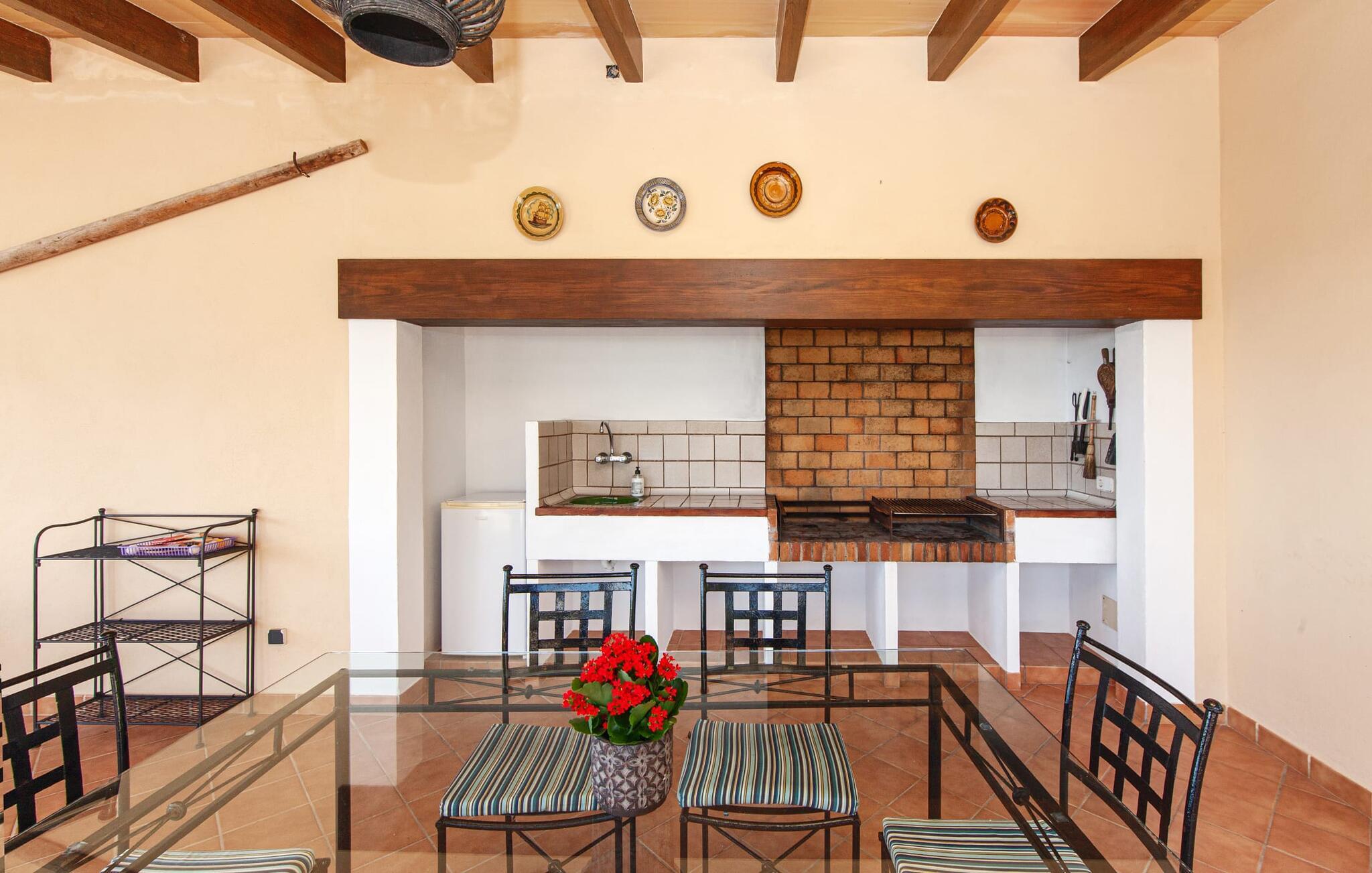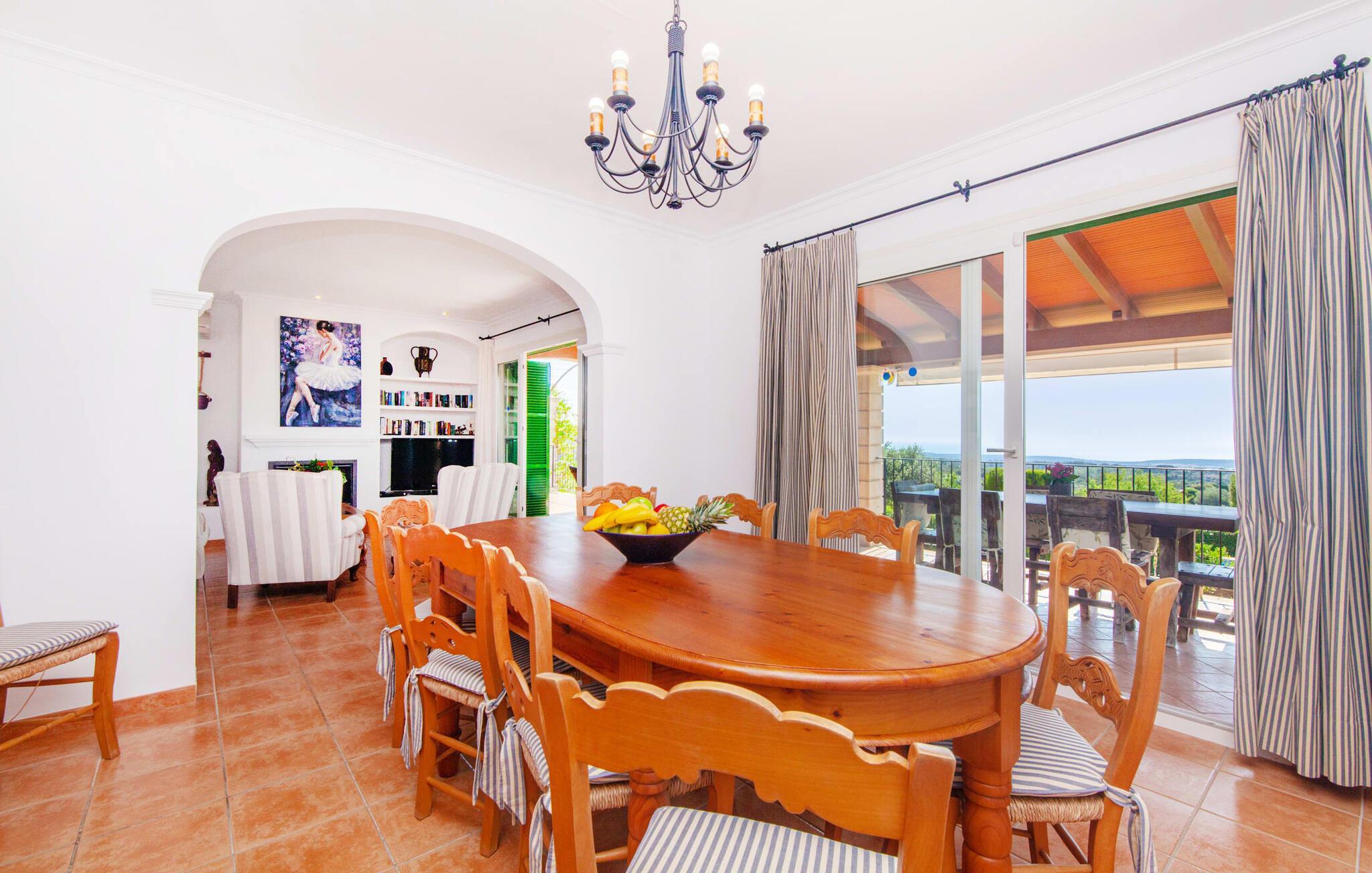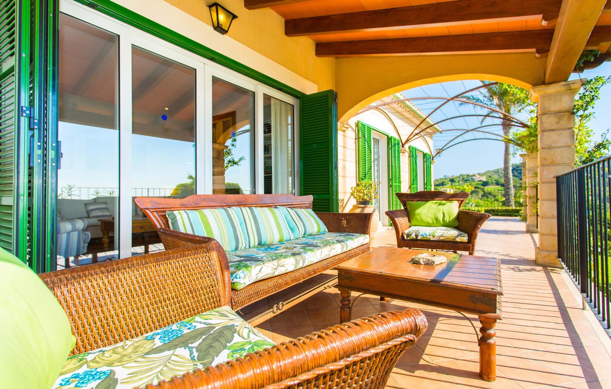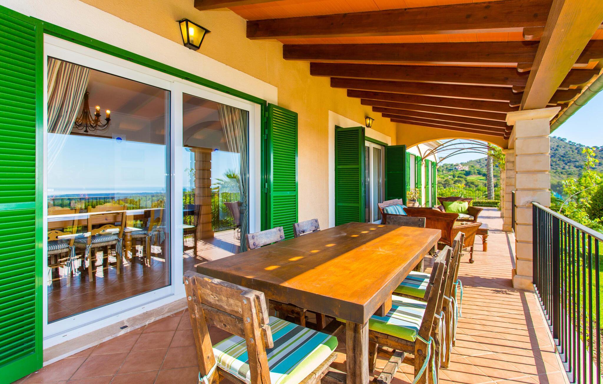 Dank der Höhenlage über der umliegenden Landschaft bietet die Villa „Ses Mamellas“ einen herrlichen Panoramablick auf das Meer, den Sie von der breiten Veranda vor dem Haus mit einem kühlen Getränk in der Hand genießen können. Mit bequemen Gartenmöbeln und viel Schatten ist es ein großartiger Ort zum Sitzen und Entspannen oder für gemeinsame Mahlzeiten. In der Nähe des Pools gibt es eine weitere überdachte Terrasse mit einer Außenküche, einem Grill und einem Essbereich, der sich perfekt für lebhafte Abende am Grill eignet. Dieser überdachte Bereich verfügt auch über eine Tischtennisplatte, wenn Sie Lust haben, außerhalb des Pools Sport zu treiben. Von hier und von den bequemen Liegestühlen am Pool aus hat man einen atemberaubenden Blick bis hin zum Meer. Das weitläufige und abgeschiedene Anwesen umfasst einen liebevoll gepflegten Garten mit Palmen und Blumen aller Art, der Naturliebhabern Freude bereitet. Sie können Autos auf der Einfahrt parken, die an sonnigen Tagen viel Schatten spendet.