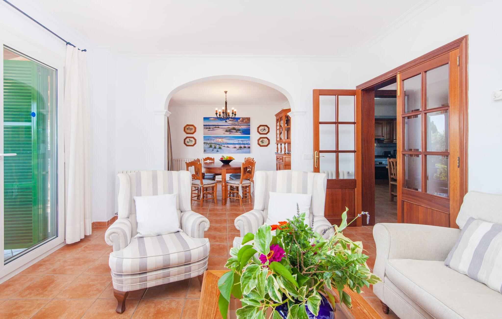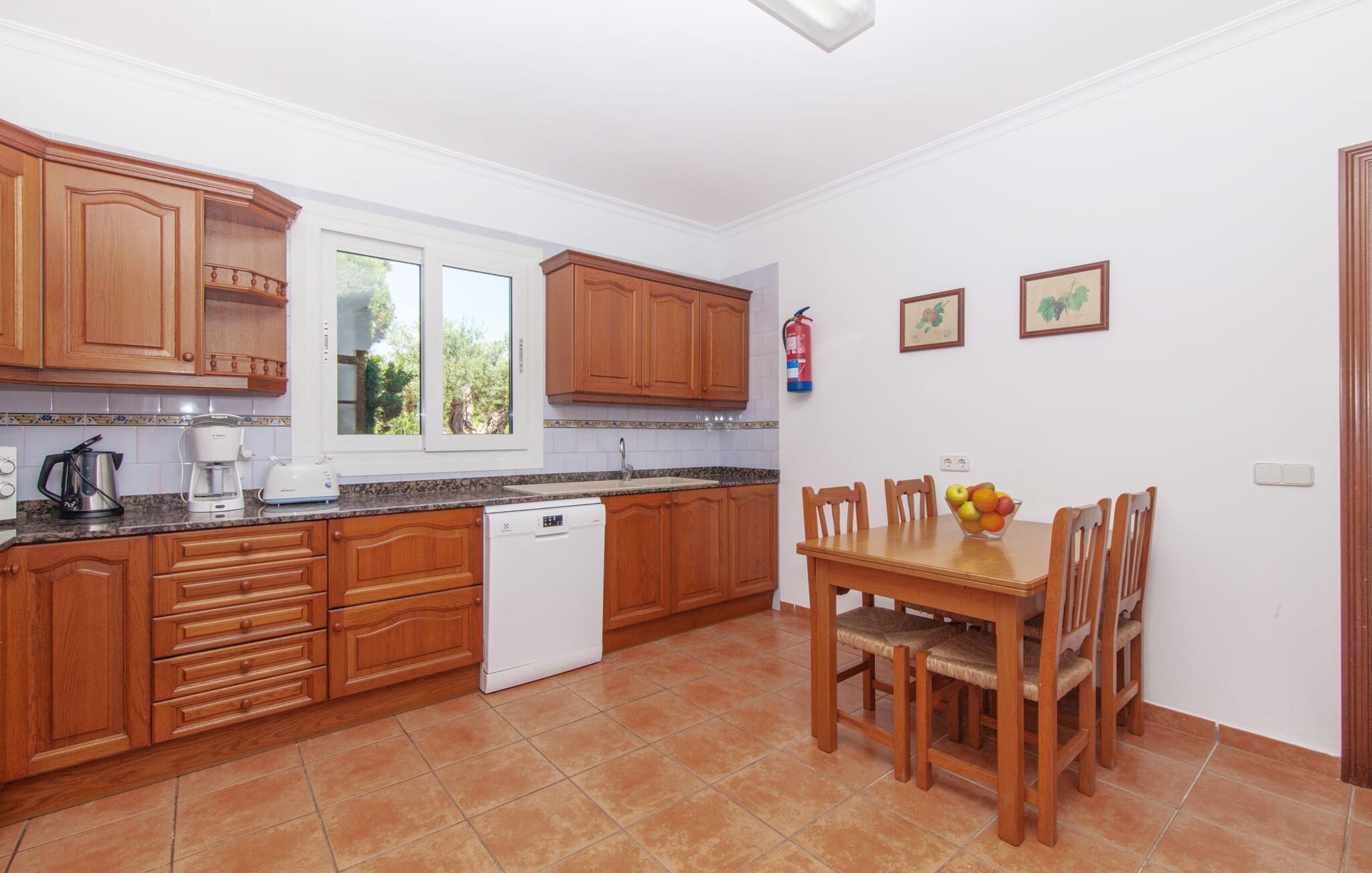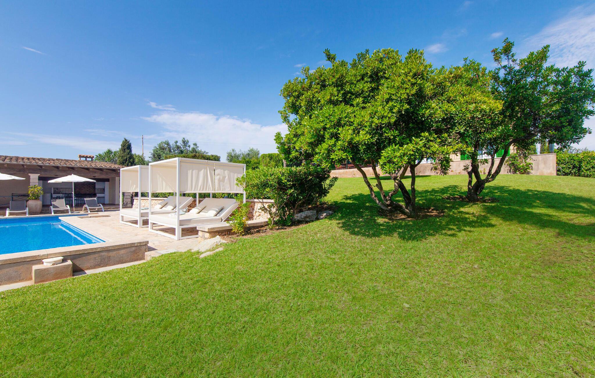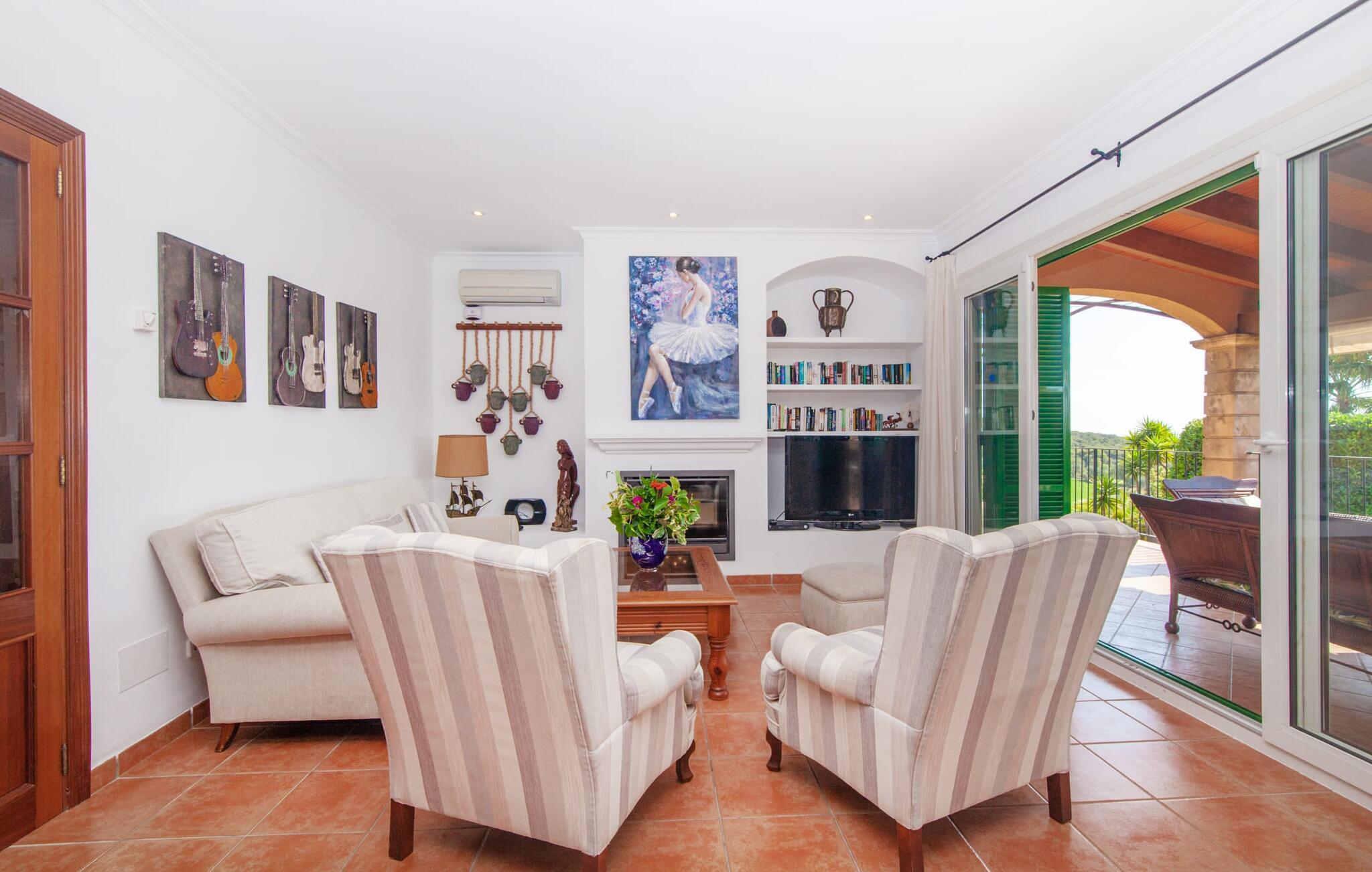 Dank der Höhenlage über der umliegenden Landschaft bietet die Villa „Ses Mamellas“ einen herrlichen Panoramablick auf das Meer, den Sie von der breiten Veranda vor dem Haus mit einem kühlen Getränk in der Hand genießen können. Mit bequemen Gartenmöbeln und viel Schatten ist es ein großartiger Ort zum Sitzen und Entspannen oder für gemeinsame Mahlzeiten. In der Nähe des Pools gibt es eine weitere überdachte Terrasse mit einer Außenküche, einem Grill und einem Essbereich, der sich perfekt für lebhafte Abende am Grill eignet. Dieser überdachte Bereich verfügt auch über eine Tischtennisplatte, wenn Sie Lust haben, außerhalb des Pools Sport zu treiben. Von hier und von den bequemen Liegestühlen am Pool aus hat man einen atemberaubenden Blick bis hin zum Meer. Das weitläufige und abgeschiedene Anwesen umfasst einen liebevoll gepflegten Garten mit Palmen und Blumen aller Art, der Naturliebhabern Freude bereitet. Sie können Autos auf der Einfahrt parken, die an sonnigen Tagen viel Schatten spendet.