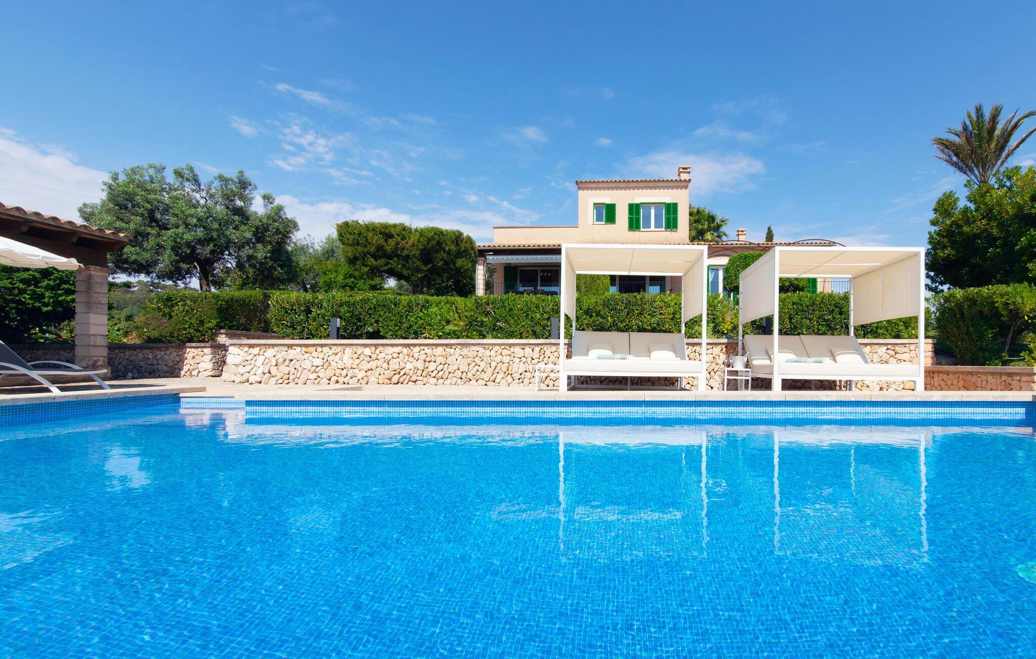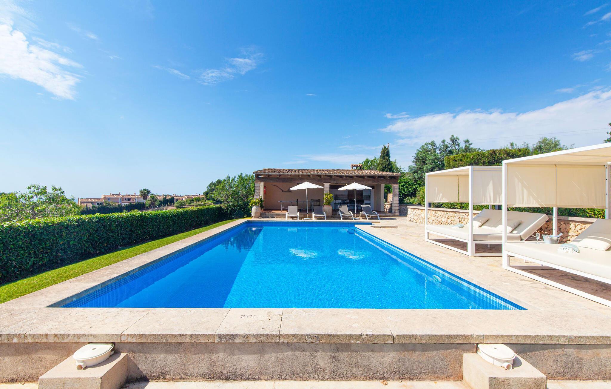 Diese charmante Villa im südöstlichen Teil der Insel bietet einen herrlichen Panoramablick. Das abgelegene Anwesen auf einem Hügel ist mit seinem gepflegten Garten voller Palmen, Blumen und üppigem Grün sehr einladend. Die Villa liegt ganz in der Nähe des Golfplatzes von Vall d'Or und der drei wunderschönen Strände Cala Marçal, Platja de s'Arenal und Cala Brafi. Bis zum beschaulichen Städtchen Portocolom sind es mit dem Auto nur etwa fünf Minuten.