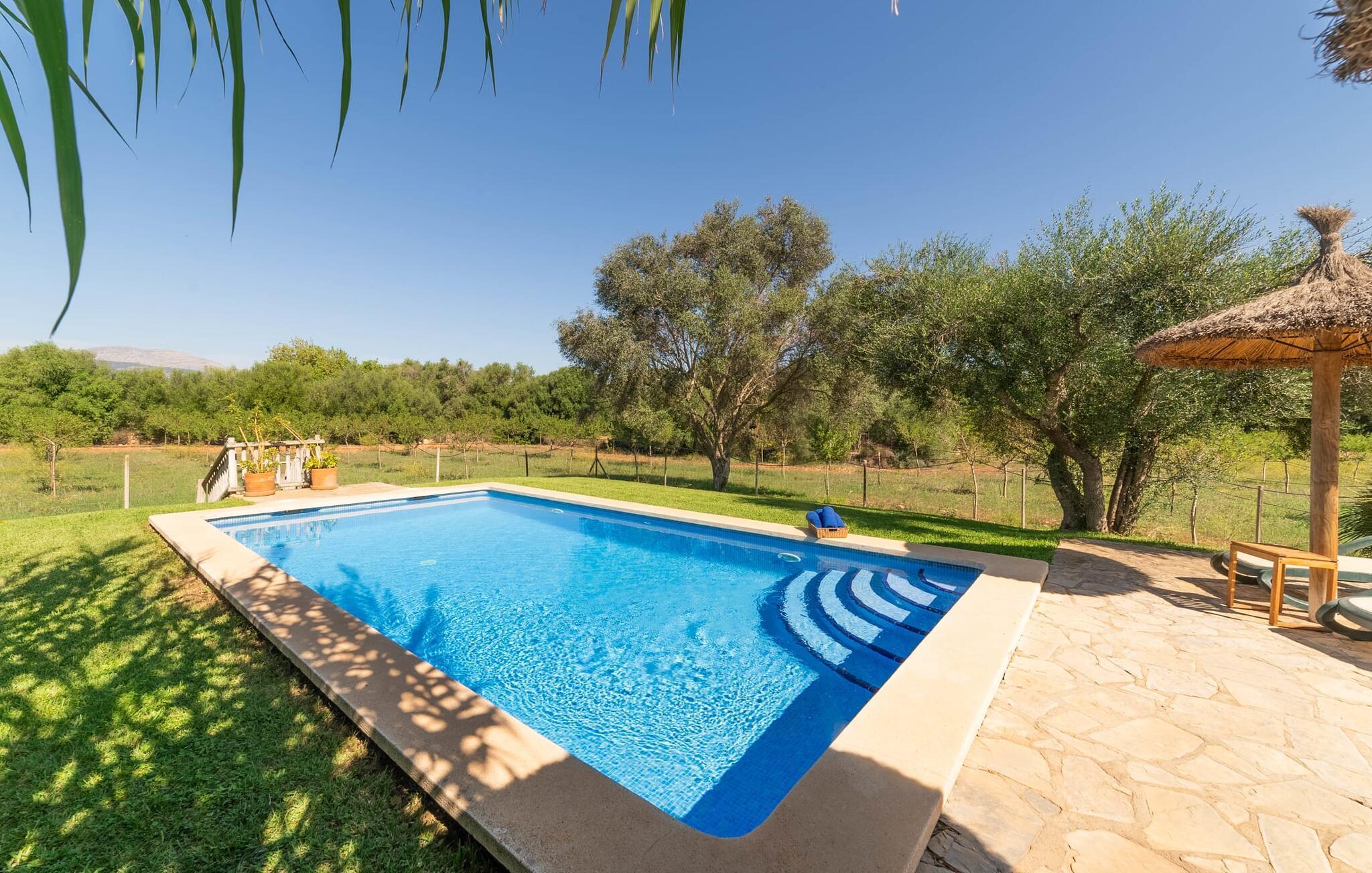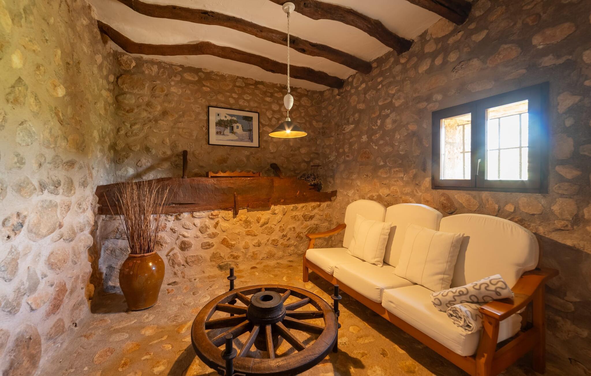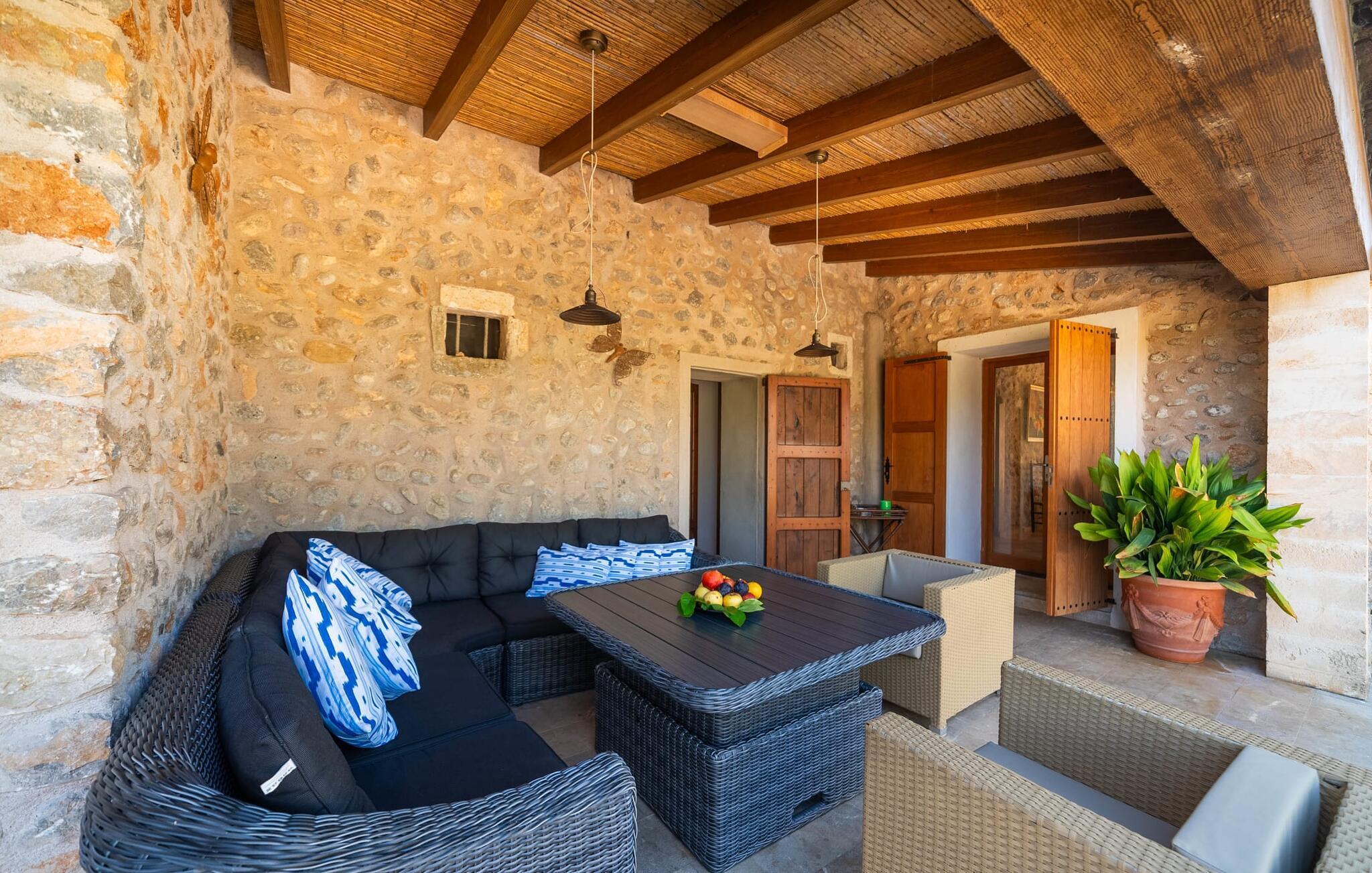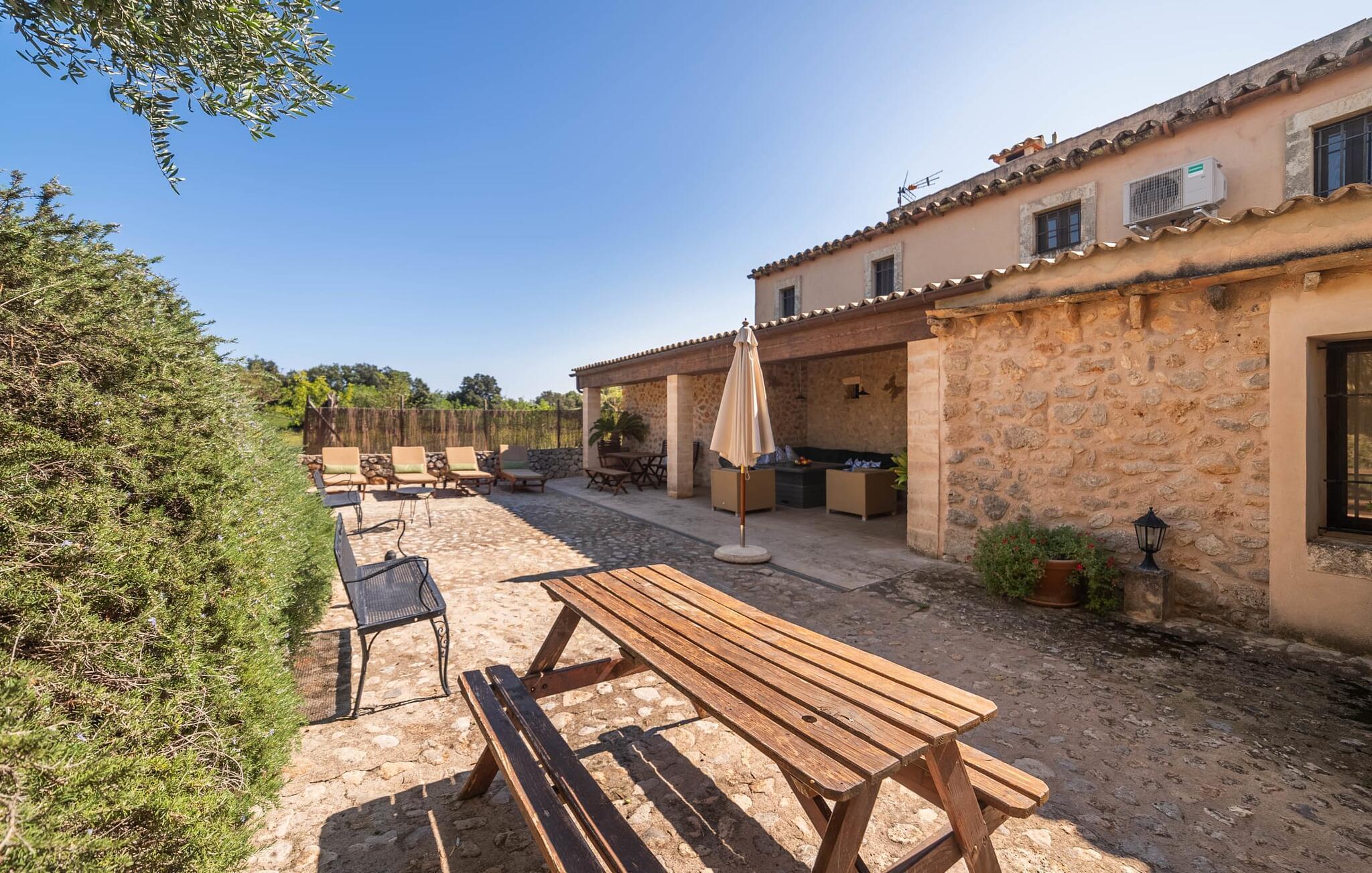 Abseits einer kleinen Straße auf einem wunderbar idyllischen Grundstück finden Sie die wunderschön restaurierte Villa „Ses Planes“. Hier können Sie einen rundum erholsamen Urlaub in herrlich ruhiger Alleinlage fernab vom Trubel erleben. In diesem Winkel der Erde wohnen Sie völlig abgeschieden und ohne direkte Nachbarn. Bei der Restaurierung des 600 Jahre alten Anwesens blieben die Eigentümer dem mallorquinischen Stil treu und konnten das ursprüngliche Flair bewahren, ohne auf moderne Annehmlichkeiten verzichten zu müssen. Umgeben von Oliven-, Zitronen- und Mandelbäumen gibt es außerhalb der Villa eine Vielzahl schöner Orte zu entdecken. Die Sitzecke wirkt sehr gemütlich und wirkt durch das satte Grün ansprechend rustikal-romantisch. Direkt neben dem Haus, mit Blick auf den Pool, können Sie Stunden unter dem Reetdach verbringen, wo Sitze aus Holz Ihnen einen bezaubernden Platz bieten. Aber das ist noch nicht alles, was Sie hier erwartet: Nehmen Sie Platz unter einem der Sonnenschirme oder genießen Sie das mediterrane Licht auf einer der anderen eingerichteten Sitzecken. Edle Stühle und Bänke sowie bequeme Liegen stehen Ihnen in diesem hofähnlichen Bereich für Ihre ganz persönlichen Momente zur Verfügung. Wer Lust auf etwas Action hat, kann an der überdachten Tischtennisplatte eine Runde Tischtennis spielen. Keine Frage: Sie müssen Zeit am Pool verbringen. Besonders an heißen mallorquinischen Tagen werden Sie das kühle Nass zu schätzen wissen und vielleicht die Zeit zwischen Liege und Wasser verbringen. Der mit blauen Mosaiksteinen gestaltete 8-m-Pool ist bequem über eine Ecktreppe zu erreichen und variiert in seiner Tiefe zwischen 1,10 und 1,80 m. Die umlaufende Natursteinterrasse und die schönen Strohschirme verleihen diesem Bereich ein authentisches und ursprüngliches Ambiente. Vor dem Haus ist ausreichend Platz für mehrere Mietwagen.