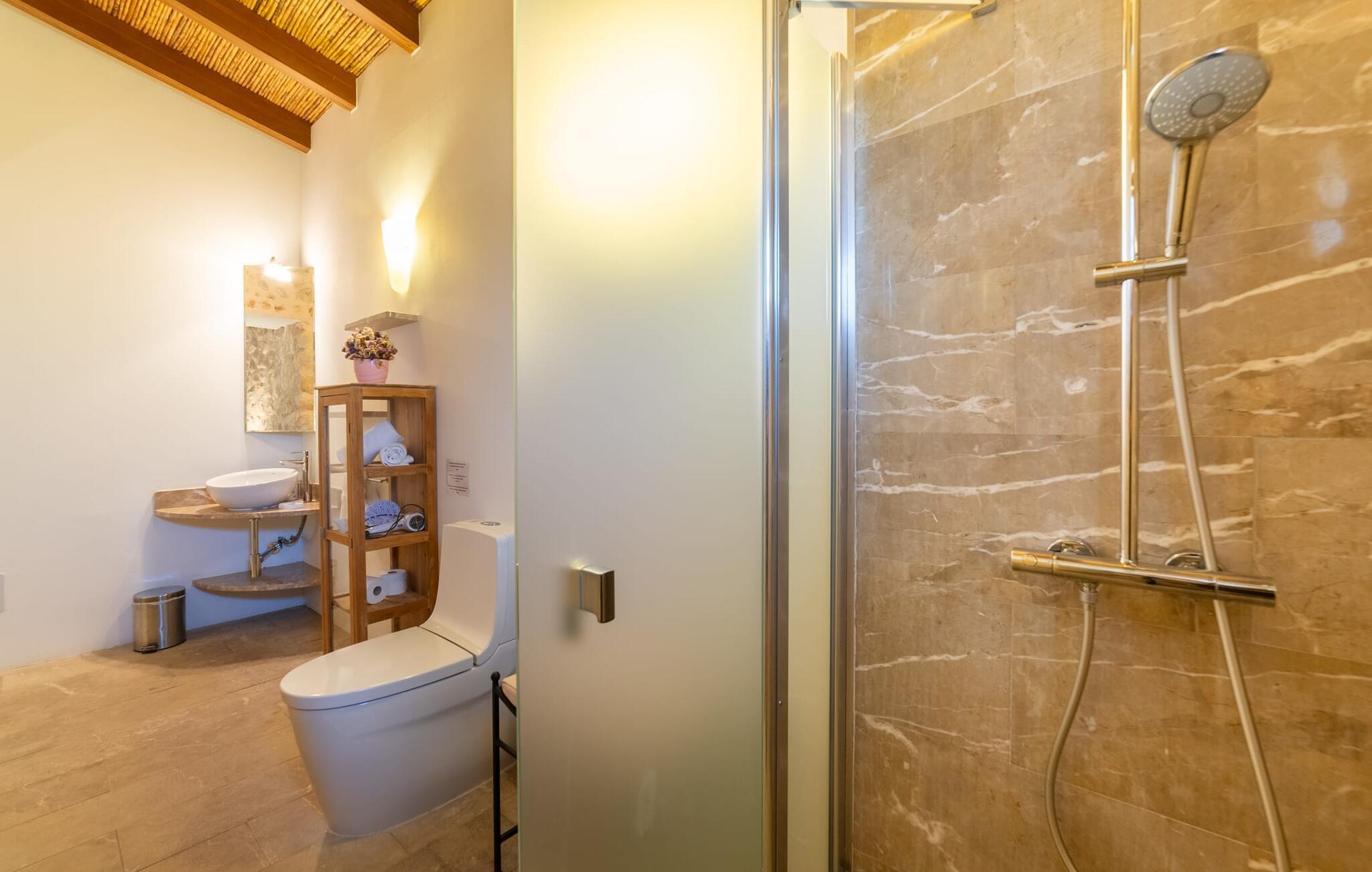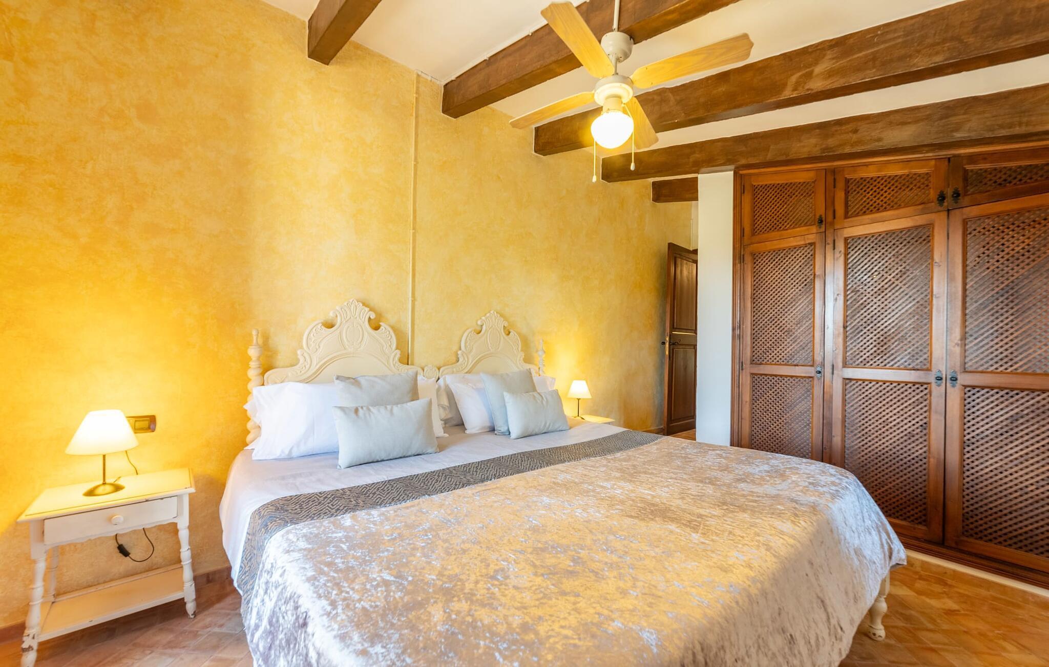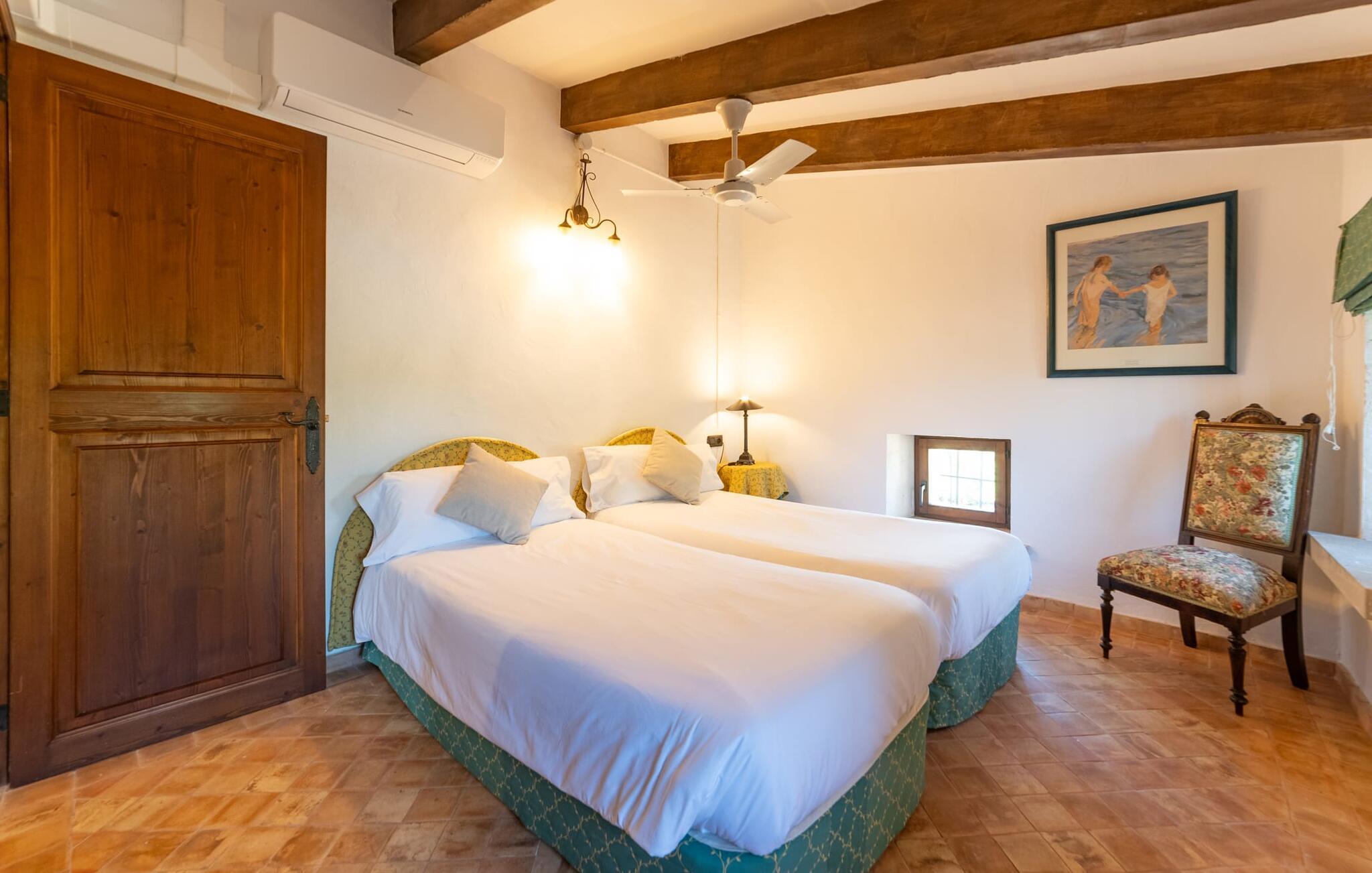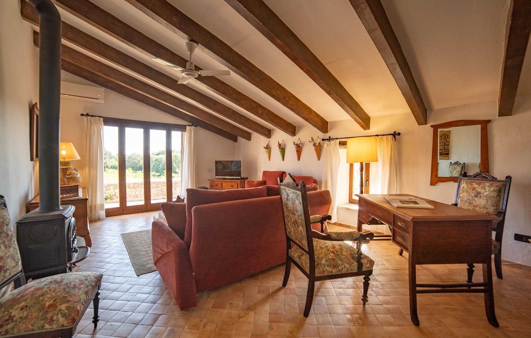 Abseits einer kleinen Straße auf einem wunderbar idyllischen Grundstück finden Sie die wunderschön restaurierte Villa „Ses Planes“. Hier können Sie einen rundum erholsamen Urlaub in herrlich ruhiger Alleinlage fernab vom Trubel erleben. In diesem Winkel der Erde wohnen Sie völlig abgeschieden und ohne direkte Nachbarn. Bei der Restaurierung des 600 Jahre alten Anwesens blieben die Eigentümer dem mallorquinischen Stil treu und konnten das ursprüngliche Flair bewahren, ohne auf moderne Annehmlichkeiten verzichten zu müssen. Umgeben von Oliven-, Zitronen- und Mandelbäumen gibt es außerhalb der Villa eine Vielzahl schöner Orte zu entdecken. Die Sitzecke wirkt sehr gemütlich und wirkt durch das satte Grün ansprechend rustikal-romantisch. Direkt neben dem Haus, mit Blick auf den Pool, können Sie Stunden unter dem Reetdach verbringen, wo Sitze aus Holz Ihnen einen bezaubernden Platz bieten. Aber das ist noch nicht alles, was Sie hier erwartet: Nehmen Sie Platz unter einem der Sonnenschirme oder genießen Sie das mediterrane Licht auf einer der anderen eingerichteten Sitzecken. Edle Stühle und Bänke sowie bequeme Liegen stehen Ihnen in diesem hofähnlichen Bereich für Ihre ganz persönlichen Momente zur Verfügung. Wer Lust auf etwas Action hat, kann an der überdachten Tischtennisplatte eine Runde Tischtennis spielen. Keine Frage: Sie müssen Zeit am Pool verbringen. Besonders an heißen mallorquinischen Tagen werden Sie das kühle Nass zu schätzen wissen und vielleicht die Zeit zwischen Liege und Wasser verbringen. Der mit blauen Mosaiksteinen gestaltete 8-m-Pool ist bequem über eine Ecktreppe zu erreichen und variiert in seiner Tiefe zwischen 1,10 und 1,80 m. Die umlaufende Natursteinterrasse und die schönen Strohschirme verleihen diesem Bereich ein authentisches und ursprüngliches Ambiente. Vor dem Haus ist ausreichend Platz für mehrere Mietwagen.