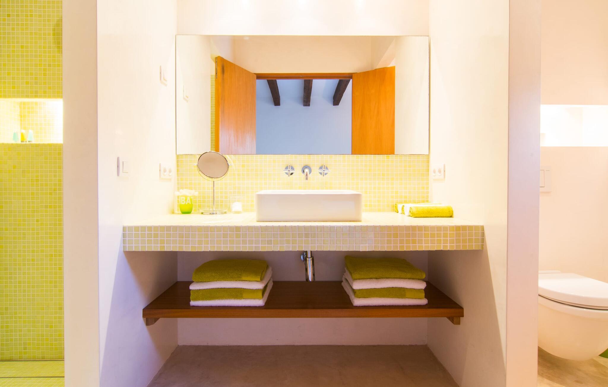Hinter der Schiebefensterfront verbirgt sich ein Esszimmer mit einem tollen, übergroßen, rustikalen Holztisch, an dem sogar bis zu zehn Personen Platz finden. Von diesem Raum aus gelangen Sie sowohl zur Küche als auch zum Wohnzimmer, einem großen, hellen Raum mit einem gemütlichen Kamin. Wie alle Räume glänzt es mit seinen weißen Wänden und einem hellen, speziell vorbereiteten Betonboden. Eine große Sofalandschaft, nur wenige Möbelstücke mit tollem Retro-Charakter, aber umso wirkungsvoller platziert, sowie moderne Kunst setzen diesen Raum in Szene und schaffen es gleichzeitig, ihn wohnlich zu machen. Die Küche sieht aus, als wäre sie einem Einrichtungsmagazin entsprungen – eine echte Traumküche, nicht nur für Hobbykocher. Ein echter Hingucker ist die Mittelinsel aus Edelstahl mit integrierten Sitzgelegenheiten. Die Küchenschränke sind aus hochwertigem Echtholz gefertigt, wodurch ein sehr wirkungsvoller, hochmoderner Mix entsteht. Selbstverständlich finden Sie hier jeden technischen Komfort, den Sie für einen Selbstversorgerurlaub benötigen. In der linken Hälfte des Hauses führt ein Korridor zu drei Doppelzimmern mit eigenem Bad, von denen die meisten direkten Zugang nach draußen haben. Alle Badezimmer verfügen über eine klare Designlinie mit trendigen, begehbaren Duschen. Im Hauptschlafzimmer mit eigenem Bad gibt es eine zusätzliche Badewanne sowie einen separaten Ankleidebereich.
