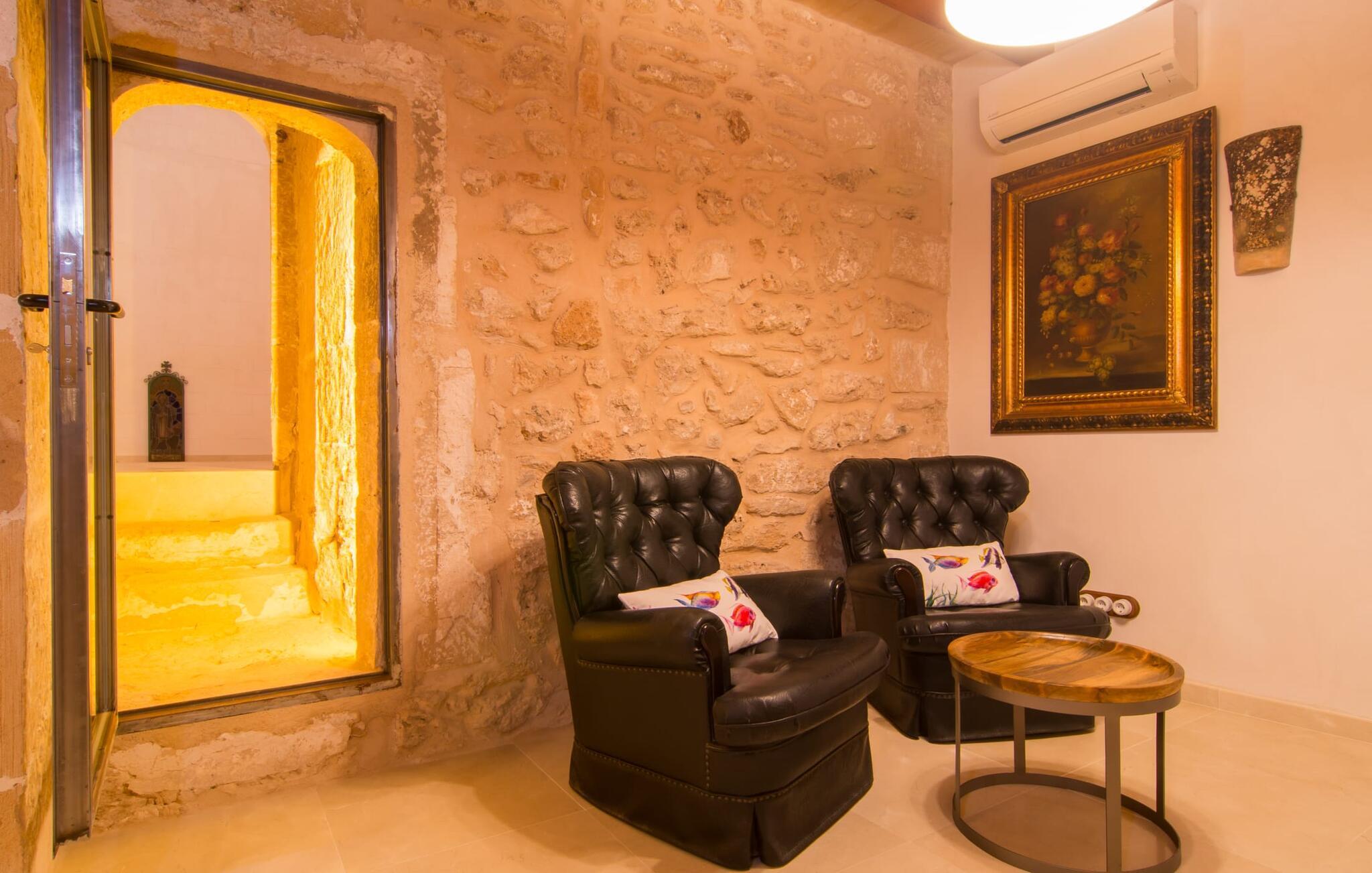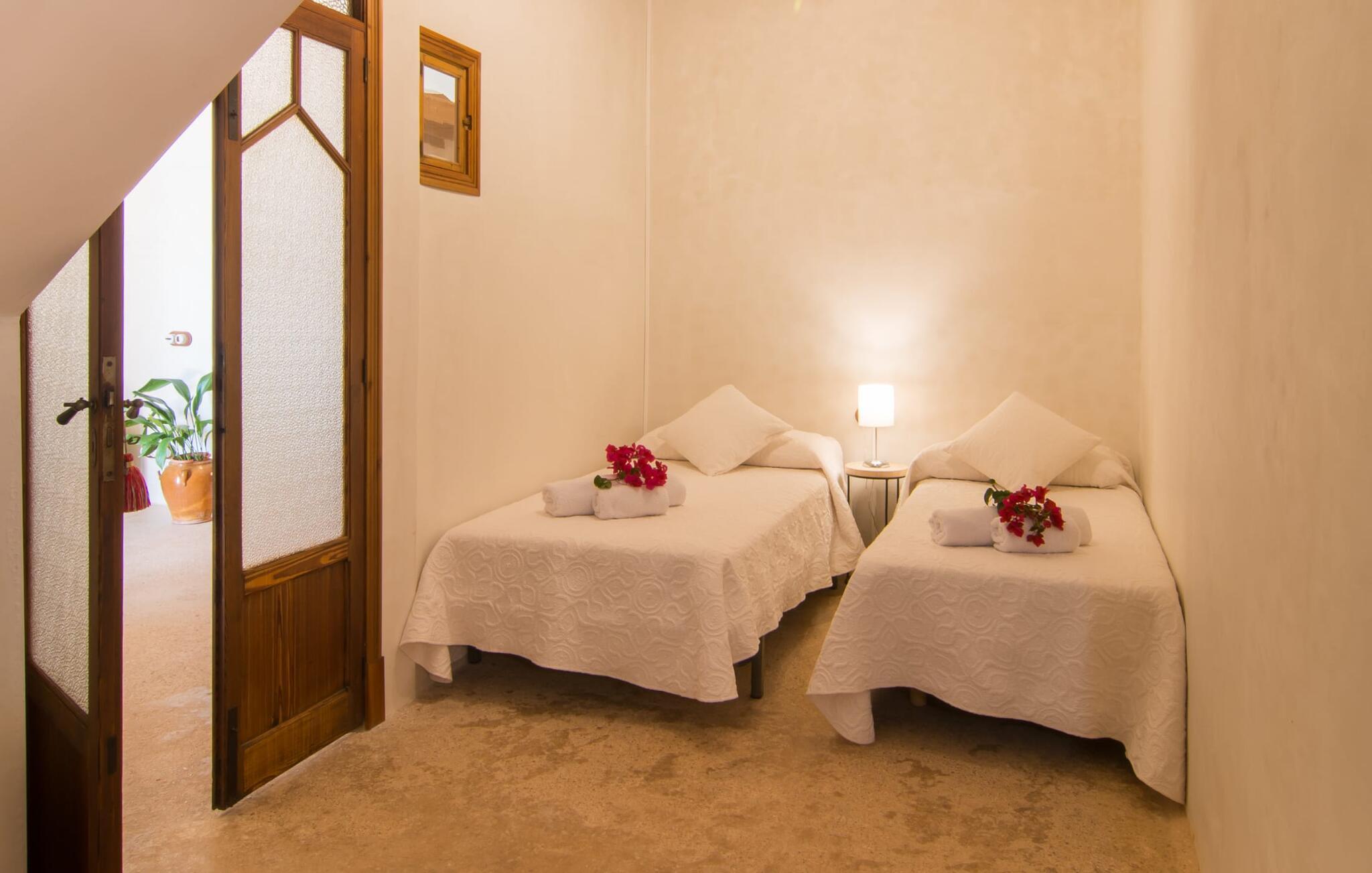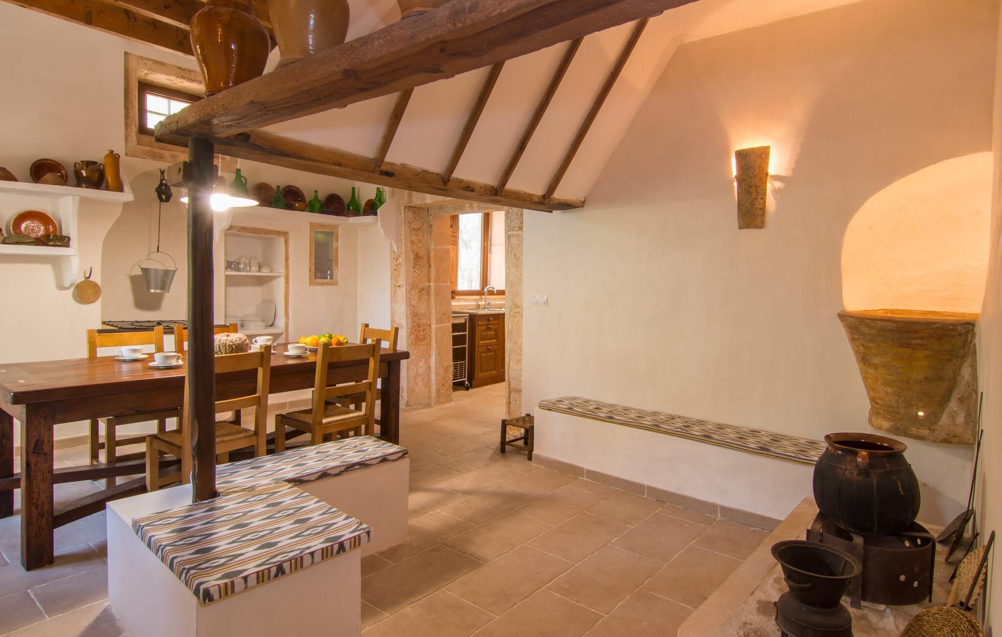 Wenn Sie eintreten, stehen Sie in einem Haus mit besonderer Qualität. Hier finden Sie nichts Überflüssiges, der minimalistische und gemütliche Stil erinnert an die skandinavische Ästhetik, gleichzeitig ist der „fincahafte“ ländliche Charme noch immer in fast jeder Ecke präsent. Eine gemütliche Sitzecke mit einer Steinbank, die in warmes Licht getaucht ist und sich ideal für lange Nächte voller Geschichten eignet, könnte zu einem Ihrer Lieblingsplätze im Haus werden. Andererseits könnte das grüne Sofa, von dem aus Sie in Ihren Traumgarten blicken können, dazu etwas sagen. Es gibt zwei Essbereiche. Einer davon steht direkt neben der bereits erwähnten Sitzecke und dem Hausbrunnen, der andere Esstisch befindet sich in einem größeren Raum. Die in Größe und Form variierenden Fenster tragen zur Originalität des zauberhaften Ambientes bei. Einer der Räume ähnelt mit seinem bunten Glasfenster in der Decke sogar einer Kapelle. Hier können Sie beispielsweise morgens meditieren, um ausgeglichen und gut gelaunt in den Tag zu starten. Die Aufteilung der Räume ist sehr urig, man erreicht die beiden Schlafzimmer durch verwinkelte Flure. Jedes von ihnen verfügt über ein eigenes Badezimmer und das kleine dritte Schlafzimmer ist der perfekte Aufenthaltsort für die Kinder. Die Natursteinwandelemente im Haus sorgen für eine heimelige Schlossatmosphäre, die durch die weißen Farbtöne und das freundliche Lichtkonzept auch Modernität vermittelt.