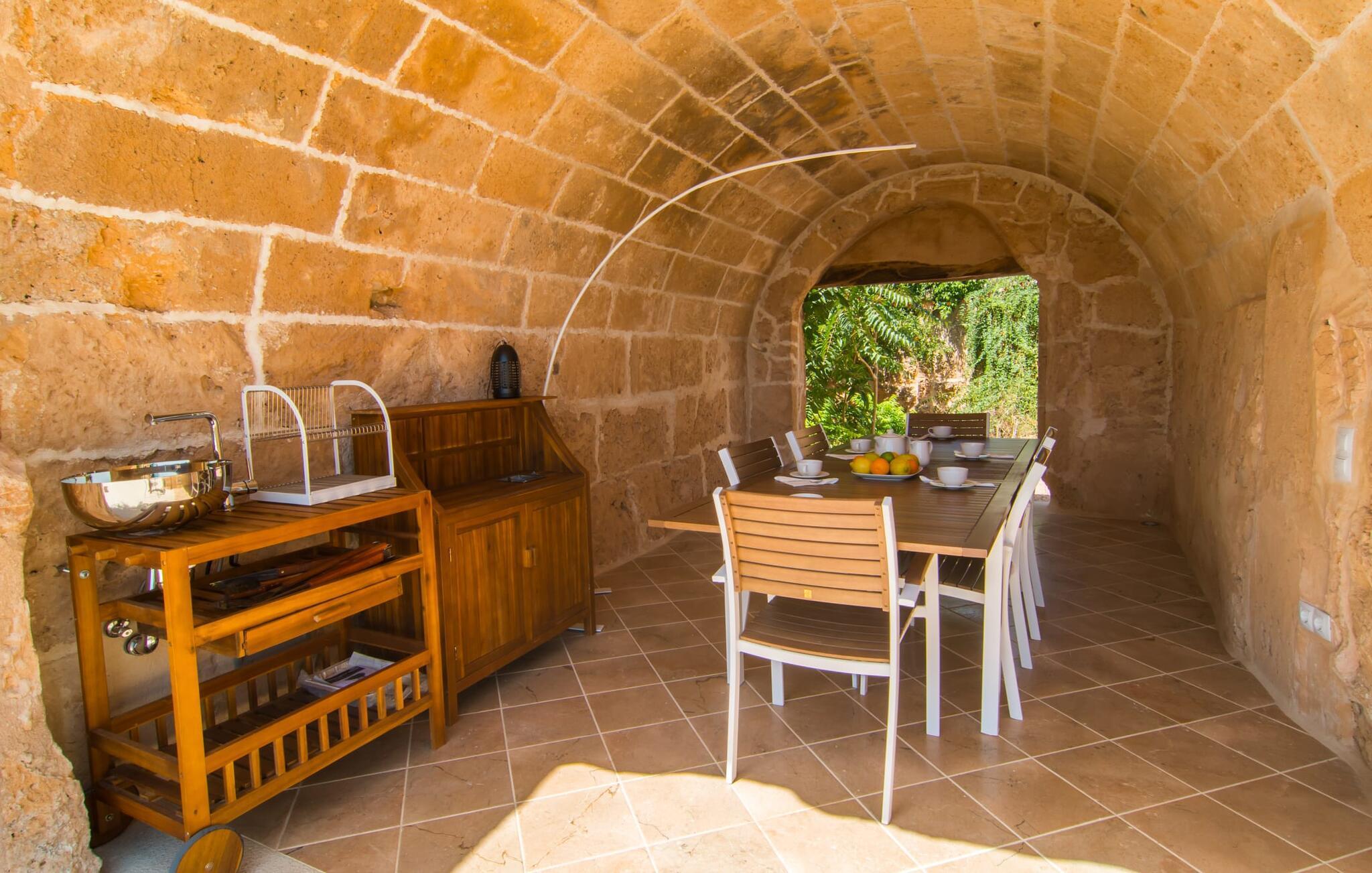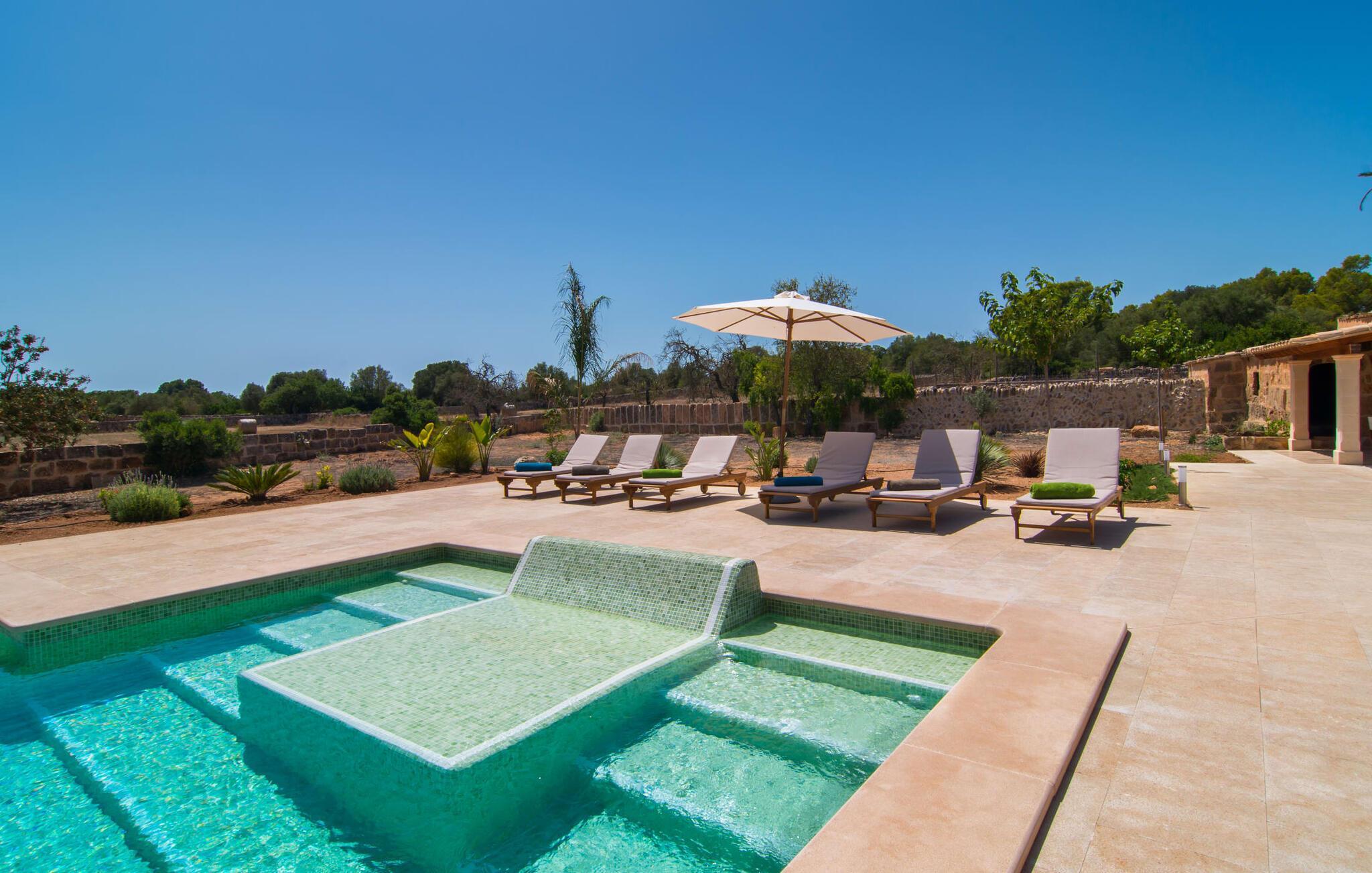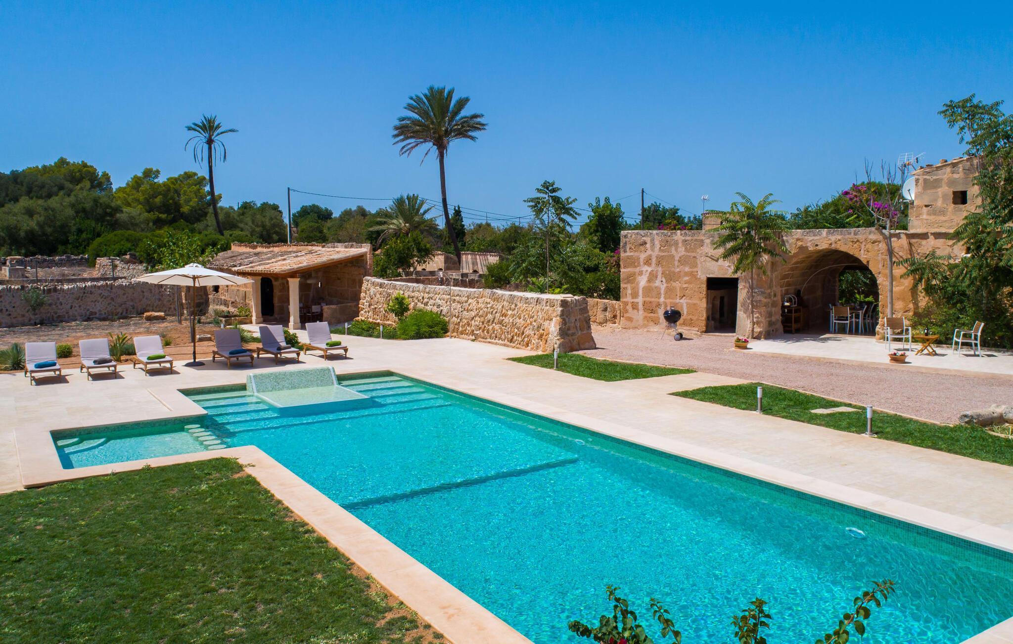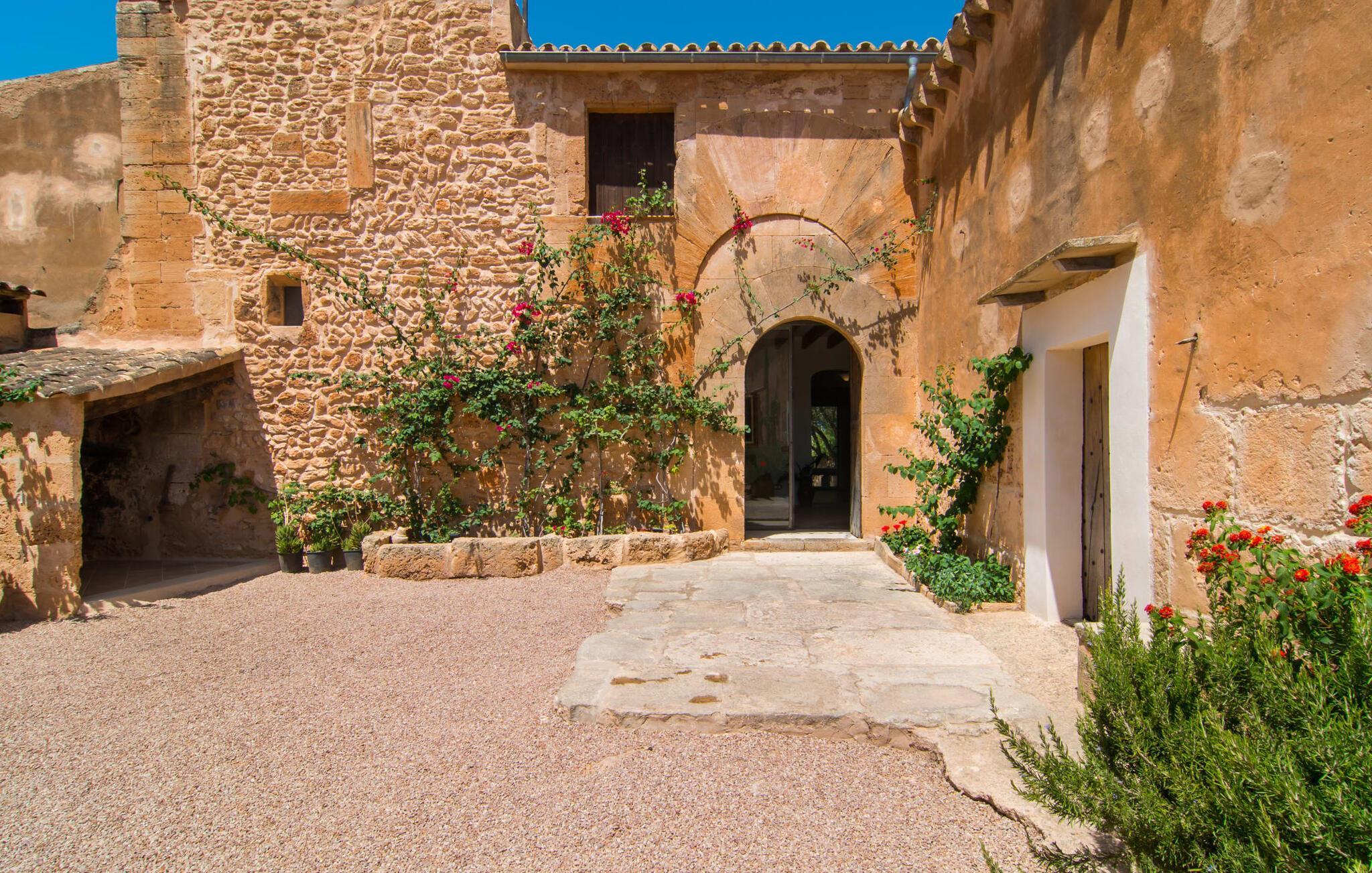 Es gibt Villen, die einem das Gefühl vermitteln, dass einem halb Mallorca zu Füßen liegt. Dies ist bei der Villa „Son Delabau Gran“ der Fall. Sobald Sie das weitläufige Anwesen nach einer kurzen Fahrt vom mallorquinischen Flughafen erreichen, stellt sich unweigerlich das Gefühl von zeitlosem Luxus ein. Trotz der attraktiven Nähe zu aufregenden Städten wie Palma oder Llucmajor versprüht der Blick auf die umliegende Landschaft pure Landidylle. Und vielleicht erinnert Sie die gewölbte Terrasse auch an die tolle Zeit Ihrer Kindheit, als Sie eine besondere Vorliebe für Schlösser hatten, die wie aus einem Märchen wirken. Schmale Stufen, die den Eindruck eines antiken Wahrzeichens vermitteln, führen zu einer hübschen Dachterrasse, auf der Sie die Sonne der Insel genießen können. Das Poolwasser glitzert verführerisch in der Sonne, dem kann man vielleicht nicht lange widerstehen. Und warum sollten Sie? Zu der wohltuenden Wirkung des Wassers gehört schließlich auch, dass das Essen danach deutlich besser schmeckt. Vor allem, wenn es in einer so gemütlichen Außenküche zubereitet wurde, die perfekt für ein großes BBQ ausgestattet ist. Wenn Sie auf einer der Liegen liegen und den Sonnenuntergang beobachten oder eine der Sitzecken – etwa die Pergola oder die Chill-Out-Lounge – nutzen, um ein Glas Inselwein zu probieren, werden Sie wissen: Sie haben alles richtig gemacht, a Mehr Bilderbuch-Idylle gibt es nicht. Wildromantische Rosen klettern an der steinernen Mauerfront im Eingangsbereich empor.