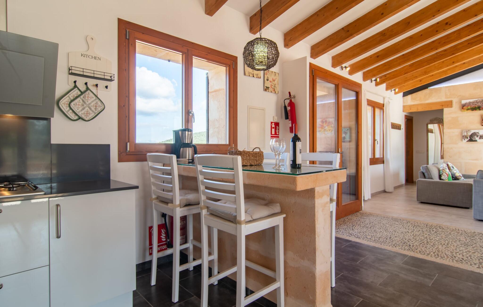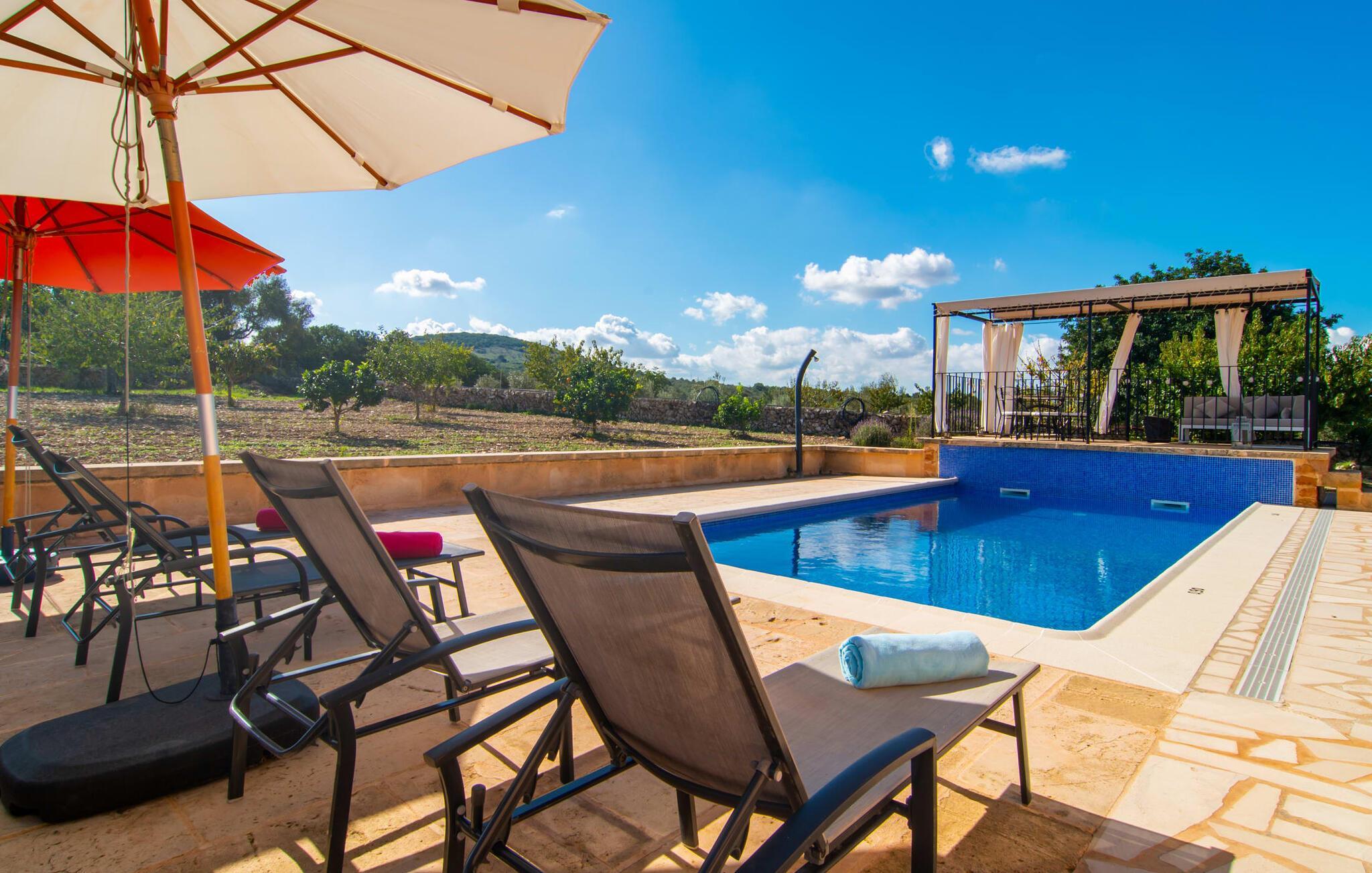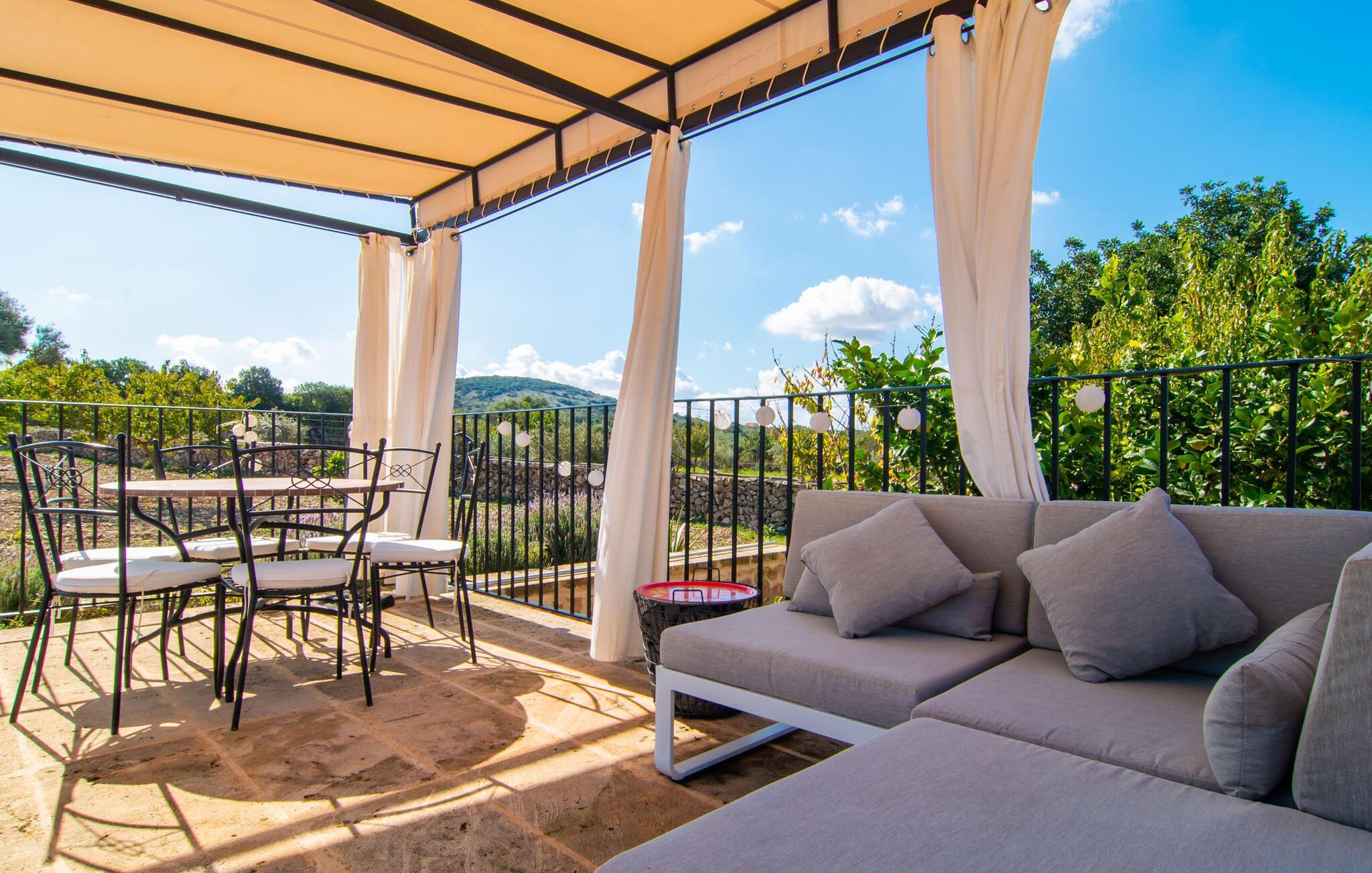 Die im ländlichen Nordosten der Insel gelegene Villa „Son Duri Nou“ ist auch in der Hochsaison eine Oase der Ruhe. Nach etwa 45-minütiger Fahrt vom Flughafen empfängt Sie Ihr Domizil zu einem rundum erholsamen Urlaub. Ein Schotterparkplatz bietet ausreichend Platz für mehrere Mietwagen. Nach der Ankunft begeben sich Gäste jeden Alters vermutlich direkt auf die großzügige Poolterrasse. Hier erwarten Sie 8 x 4 m purer Wasserspaß. Die Gäste können sich bei einem ausgiebigen Bad abkühlen und Spaß am Schwimmen haben. Auch der luftige Poolpavillon wird sofort ins Auge fallen. Leicht erhöht auf einer Galerie zu sitzen, mit oder ohne Vorhänge, bietet Schutz vor Wind und Sonne. Aber auch auf der überdachten Terrasse direkt am Haus können Sie es sich gemütlich machen, in idyllischer Ruhe frühstücken, den Grill anfeuern oder die Erlebnisse des Tages Revue passieren lassen. Auch schräg gegenüber kann man hier auf einer zweiten Terrasse mit einer Chill-out-Lounge aus Paletten relaxen. Alles in allem ein toller Außenbereich, in dem man wunderbar entspannen kann.