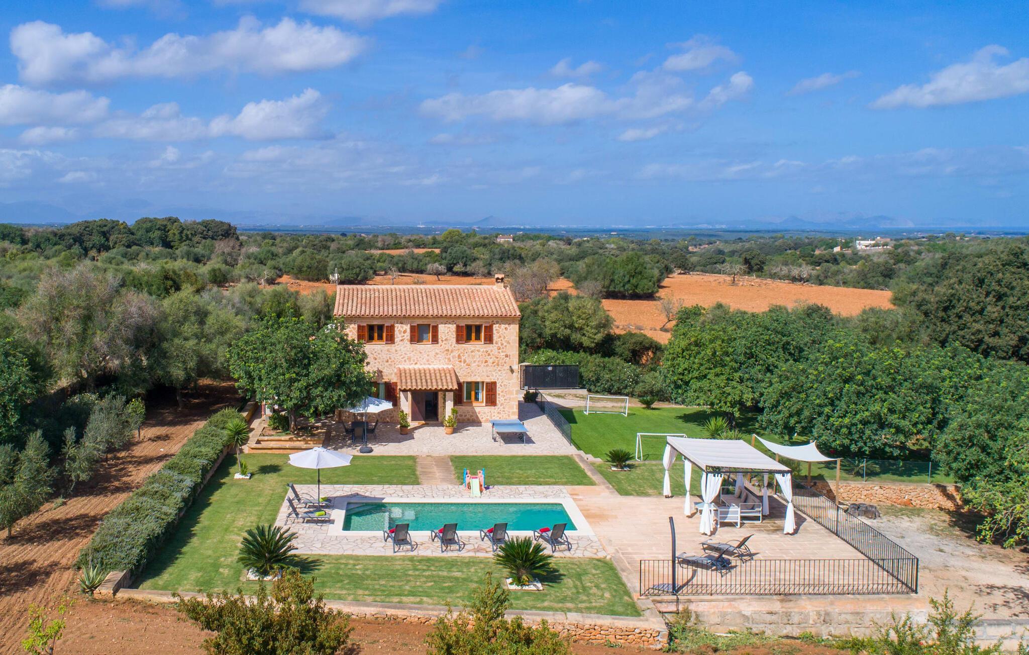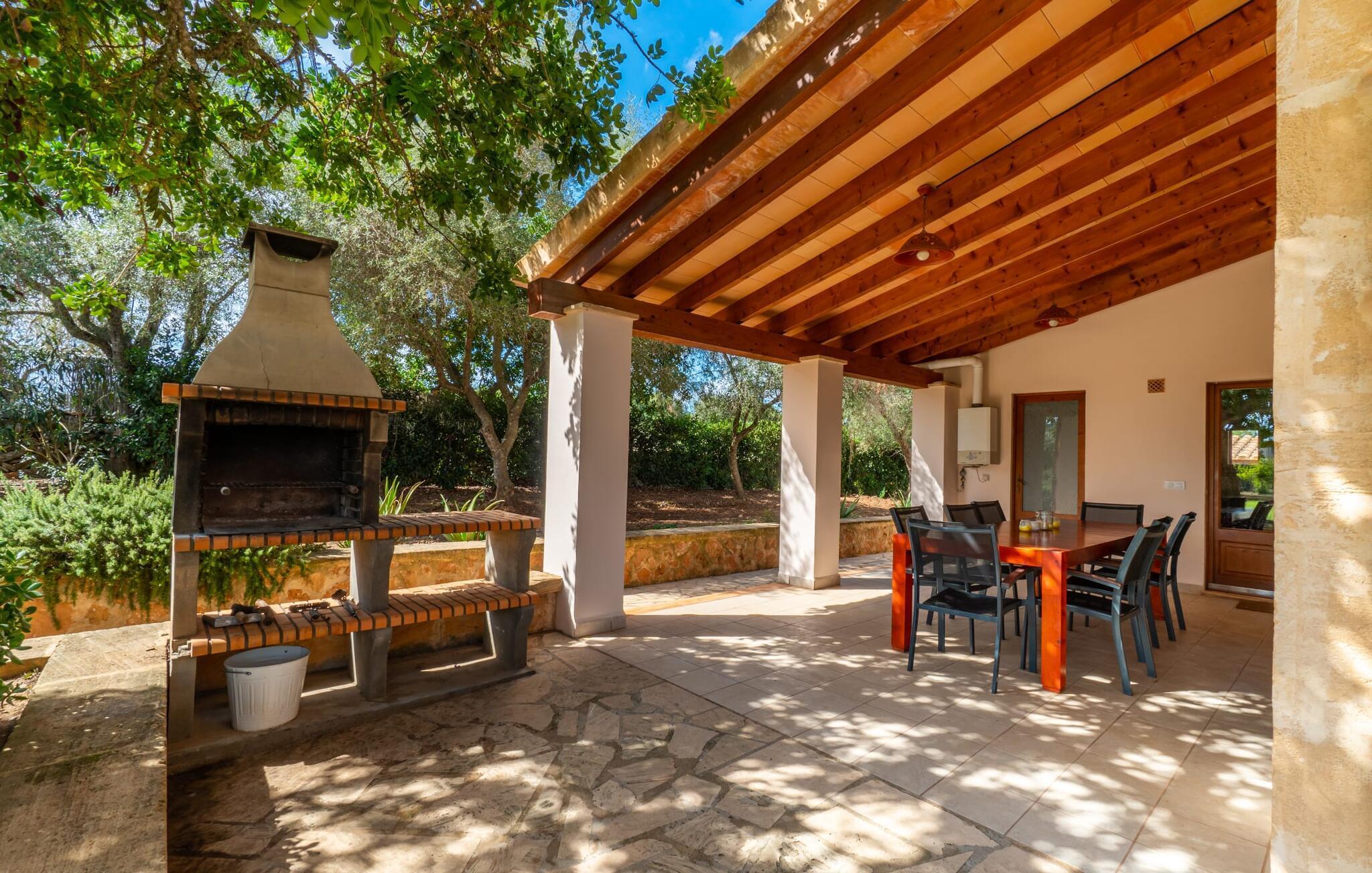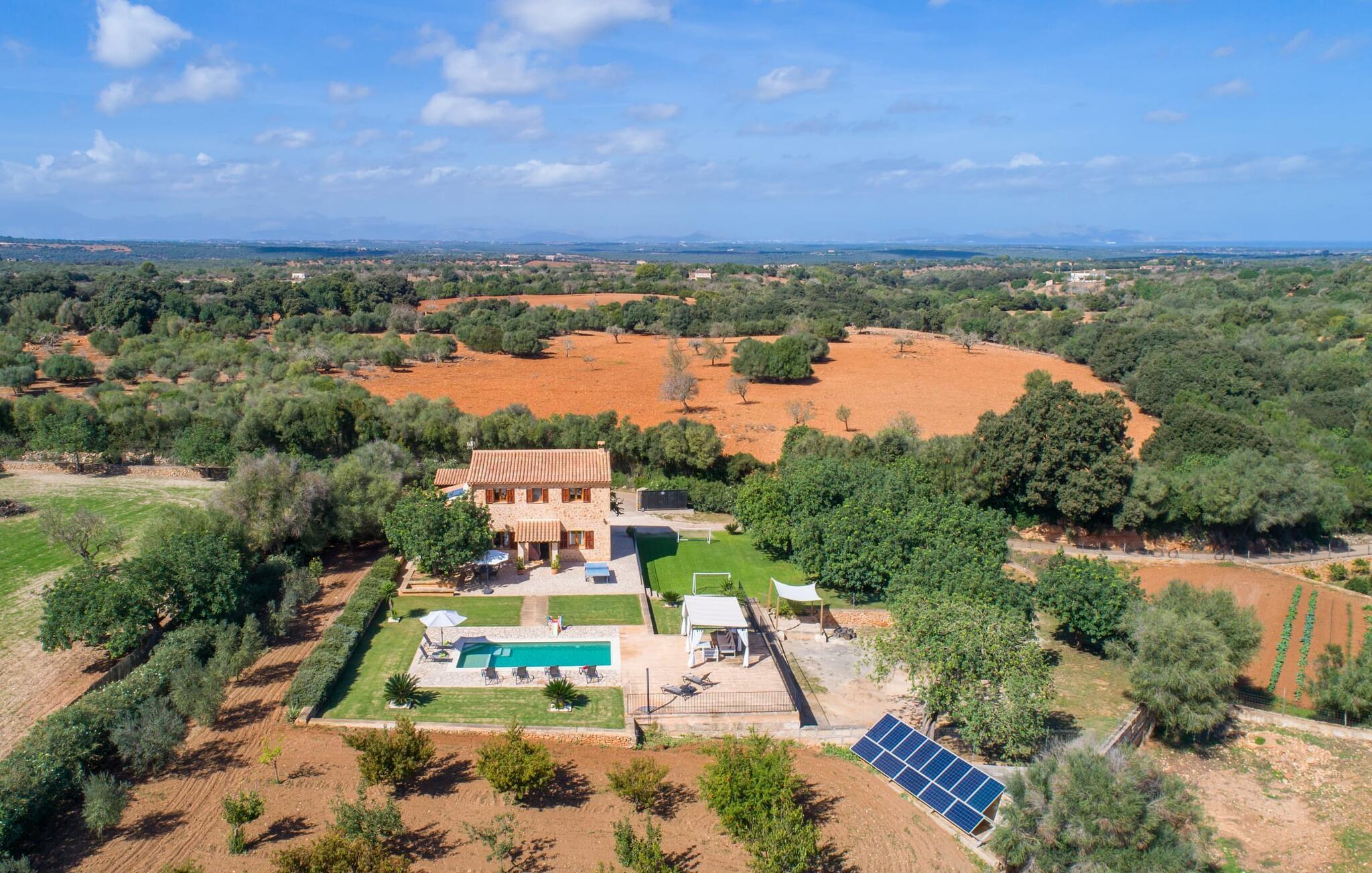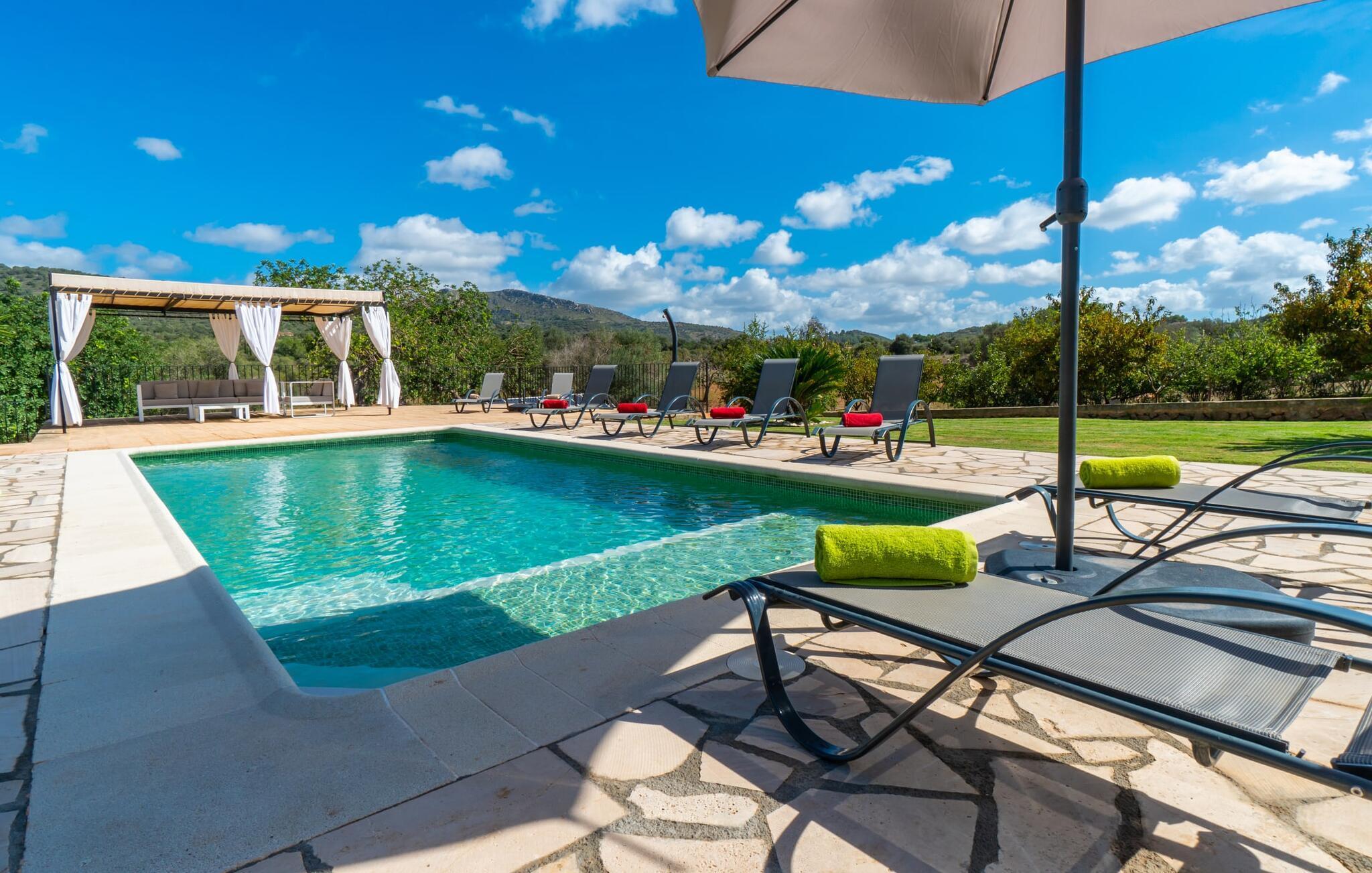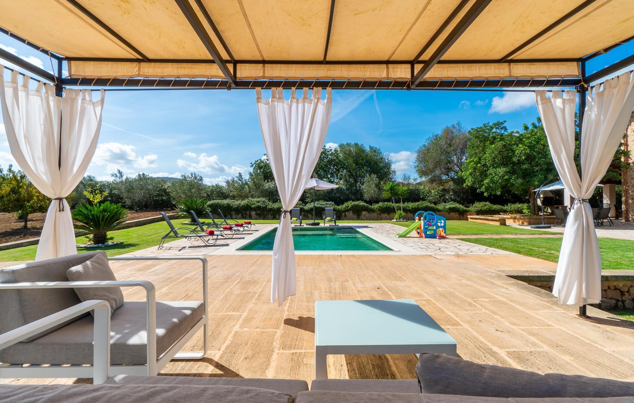 Der Pool verfügt über leicht zugängliche Stufen und eine breite Sitzkante und kann auf Wunsch sicher eingezäunt werden. Die von einem großen Pavillon und bequemen Gartenmöbeln gesäumte Sonnenterrasse lädt zum Entspannen ein. Eine überdachte Terrasse bietet einen gemütlichen Ort zum Essen im Freien, sodass Sie Mahlzeiten vom gemauerten Grill genießen und dabei den Pool im Auge behalten können. Das weitläufige Grundstück bietet atemberaubende Ausblicke auf die Landschaft nördlich von Manacor und sorgt für viel Privatsphäre.
