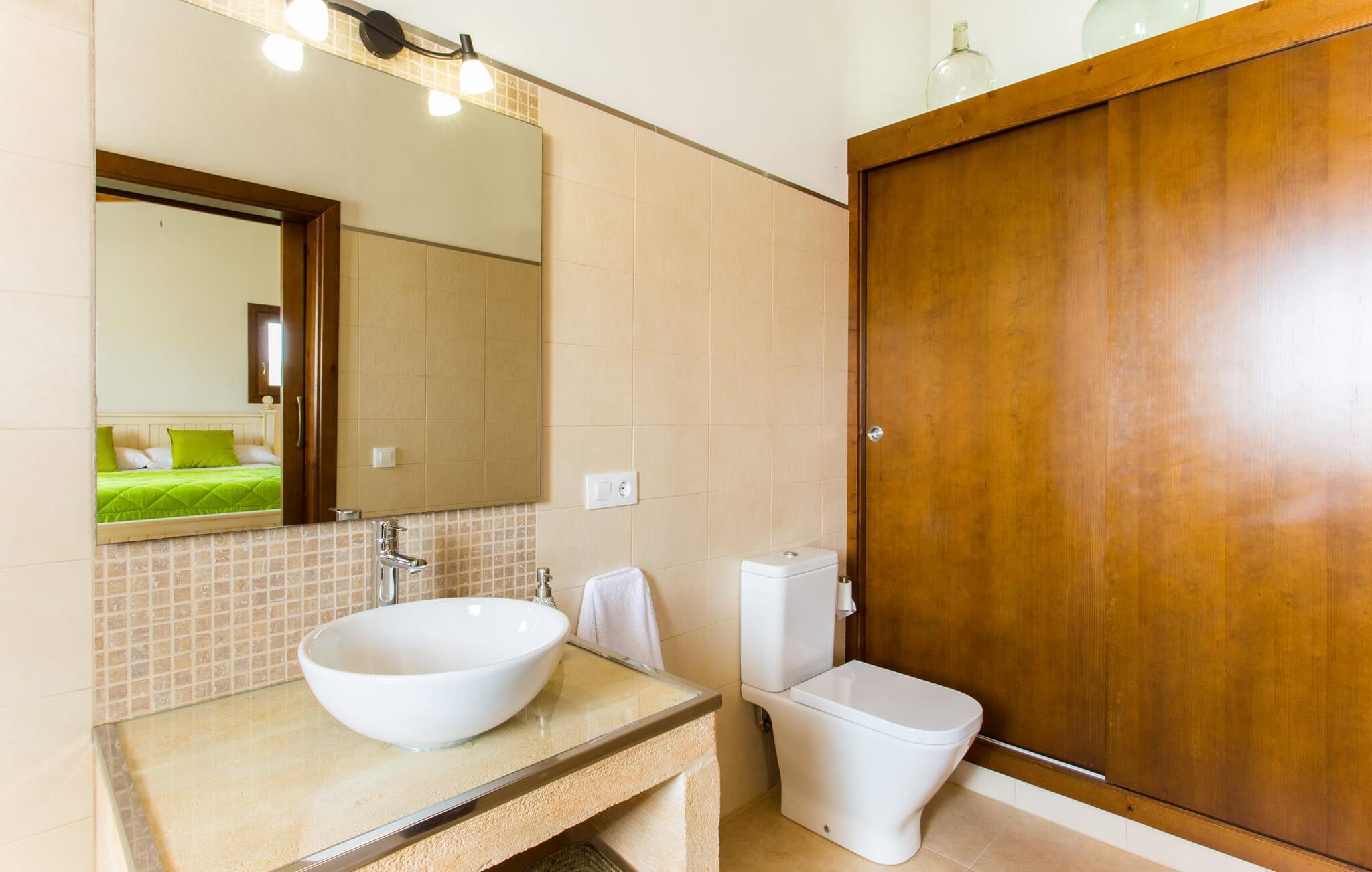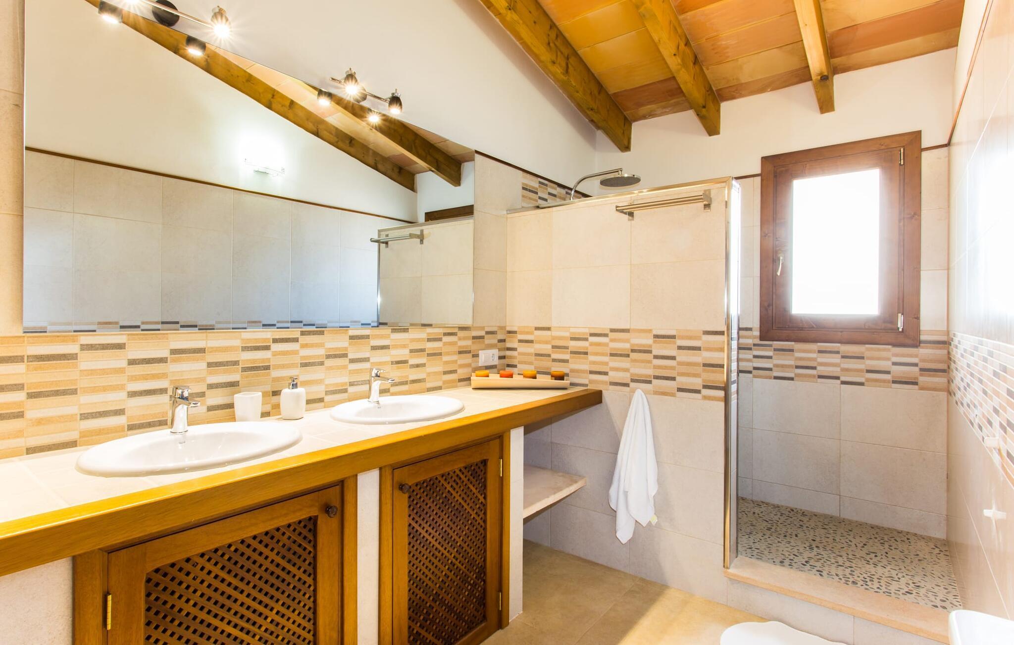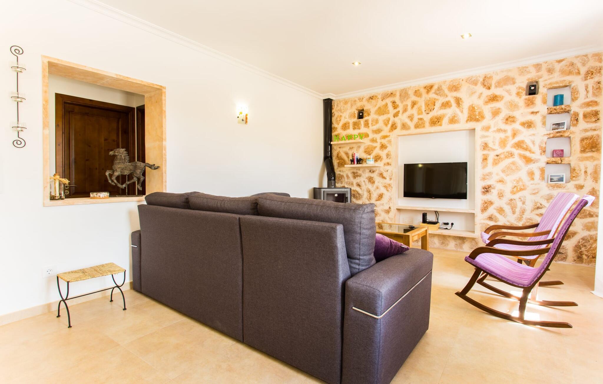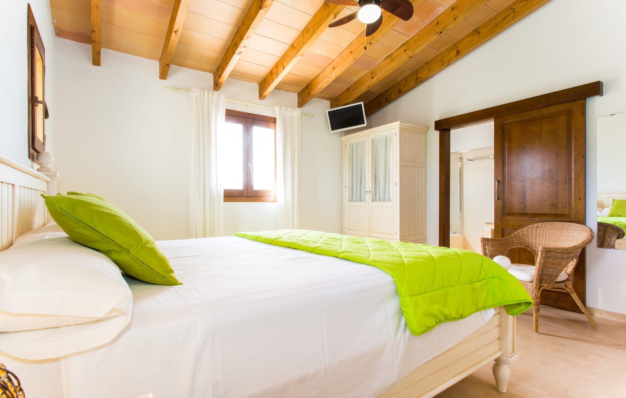 Der großzügige Innenraum ist ideal für einen erholsamen Urlaub mit der ganzen Familie. Im Erdgeschoss finden Sie ein helles Wohn- und Esszimmer mit Sitzgelegenheit und Kamin. Die moderne, gut ausgestattete Küche ist halboffen zum Essbereich. Sowohl von der Küche als auch vom Essbereich gibt es direkten Zugang zur überdachten Terrasse. Durch die breite Dusche und die Türen im Erdgeschoss ist dieser Teil der Finca für jedermann leicht zugänglich. Im Obergeschoss befinden sich drei weitere Doppelschlafzimmer und zwei Badezimmer. Die gemütlichen Schlafzimmer bieten einen schönen Ausblick auf die umliegende Landschaft und die Fenster lassen sich bequem mit Rollläden verdunkeln. Dieses entzückende Ferienhaus in der Nähe von Manacor bietet außerdem zuverlässigen Mobilfunkempfang, gutes WLAN und einen Schreibtisch.