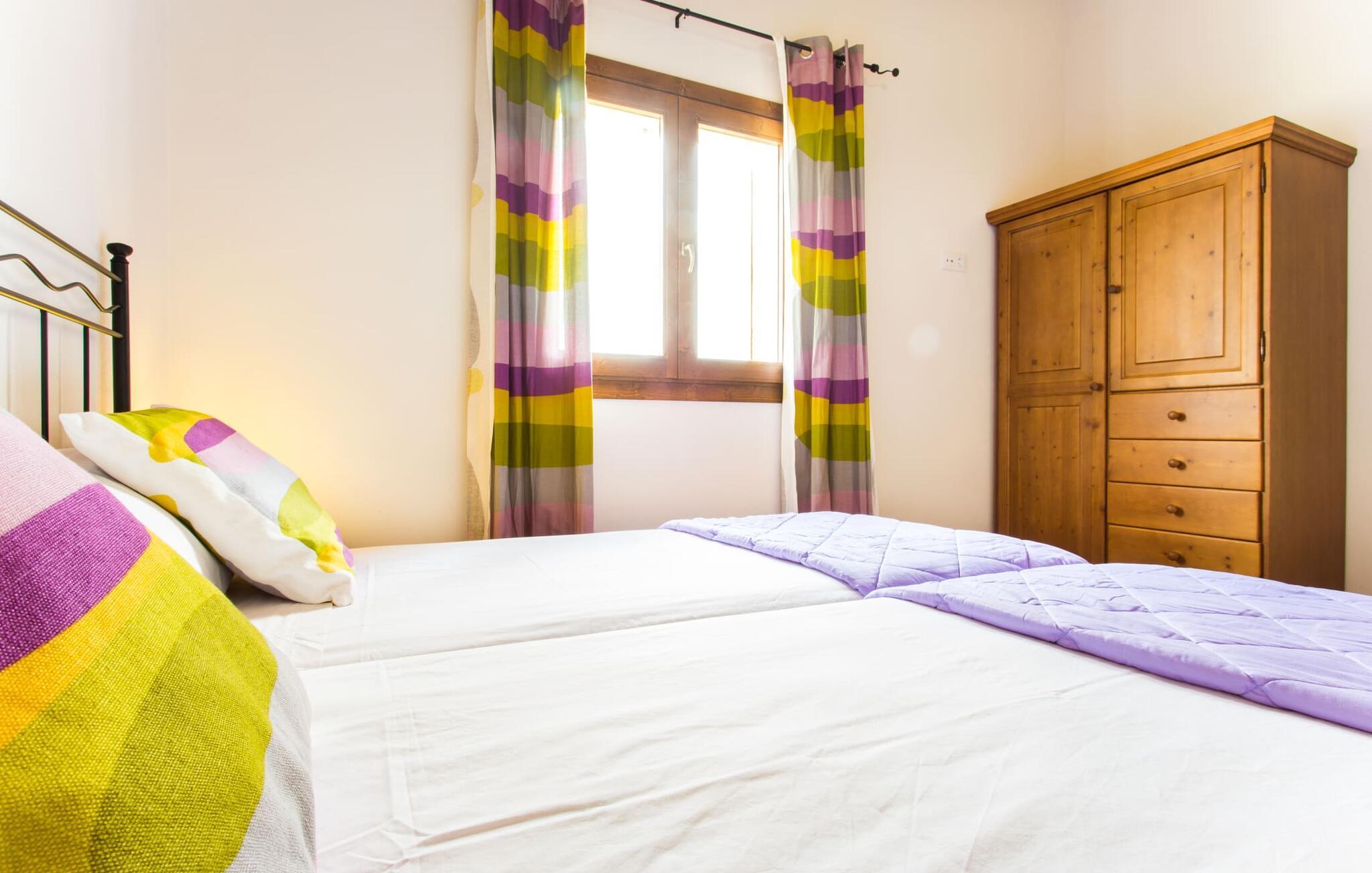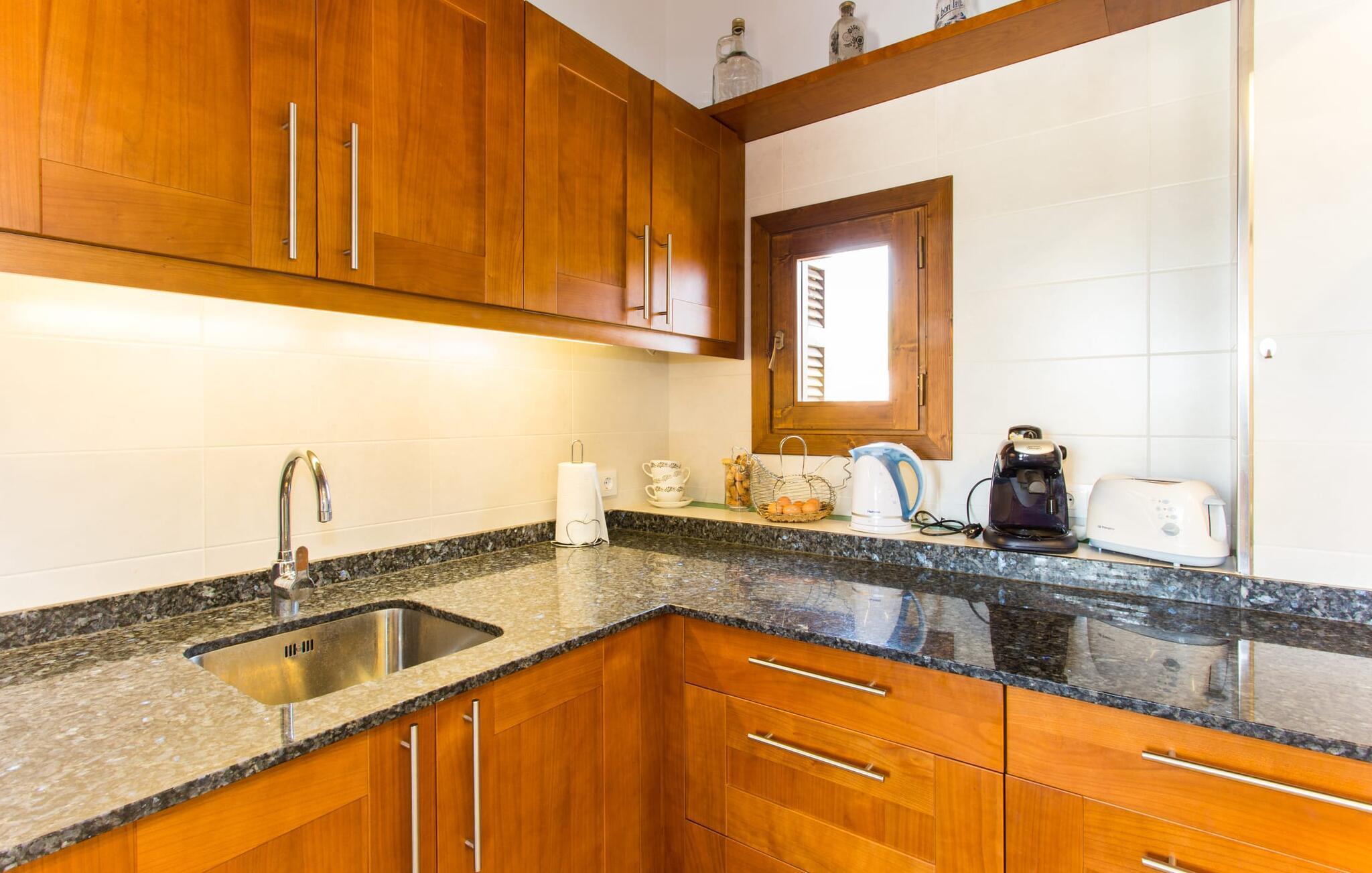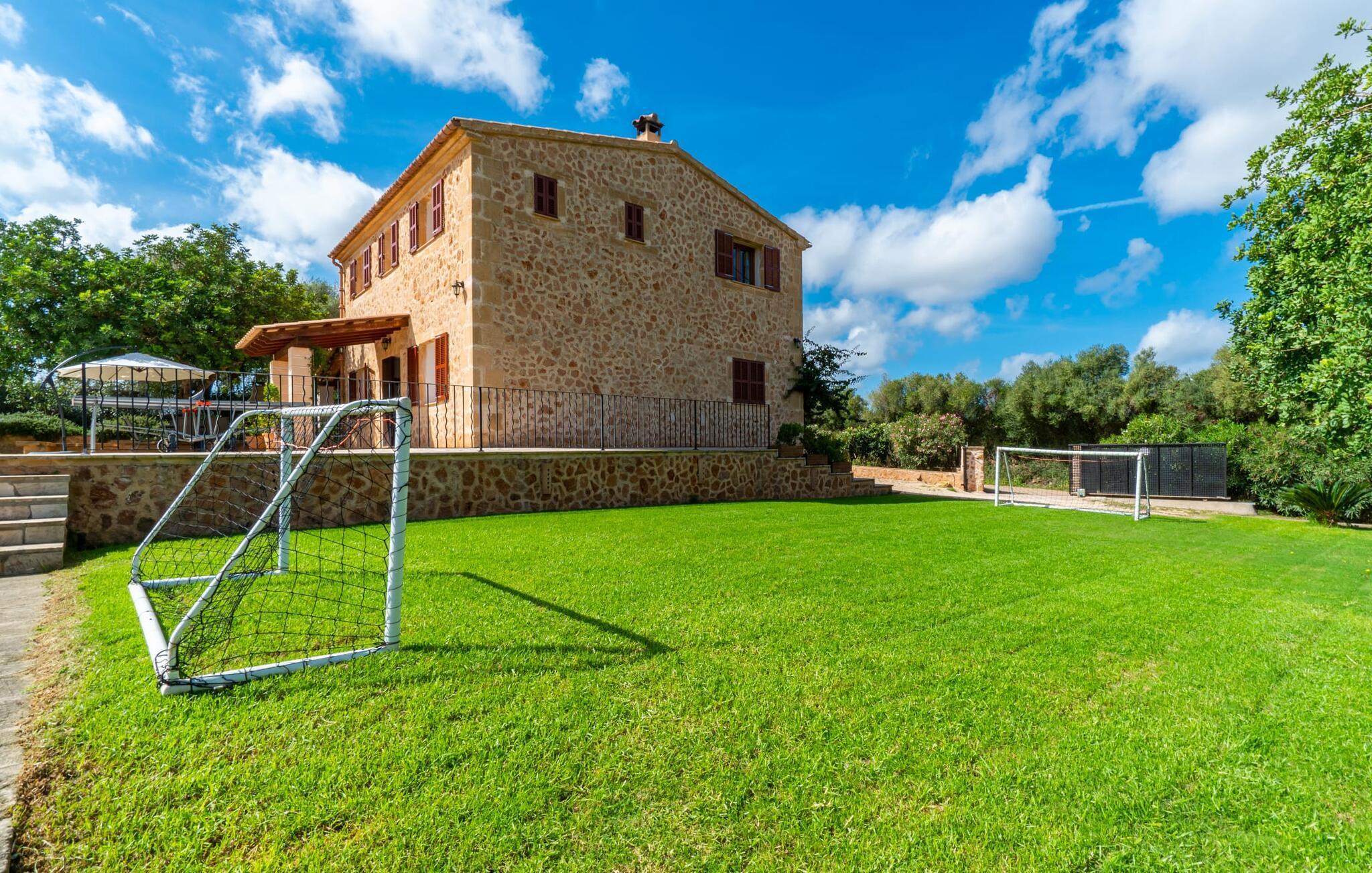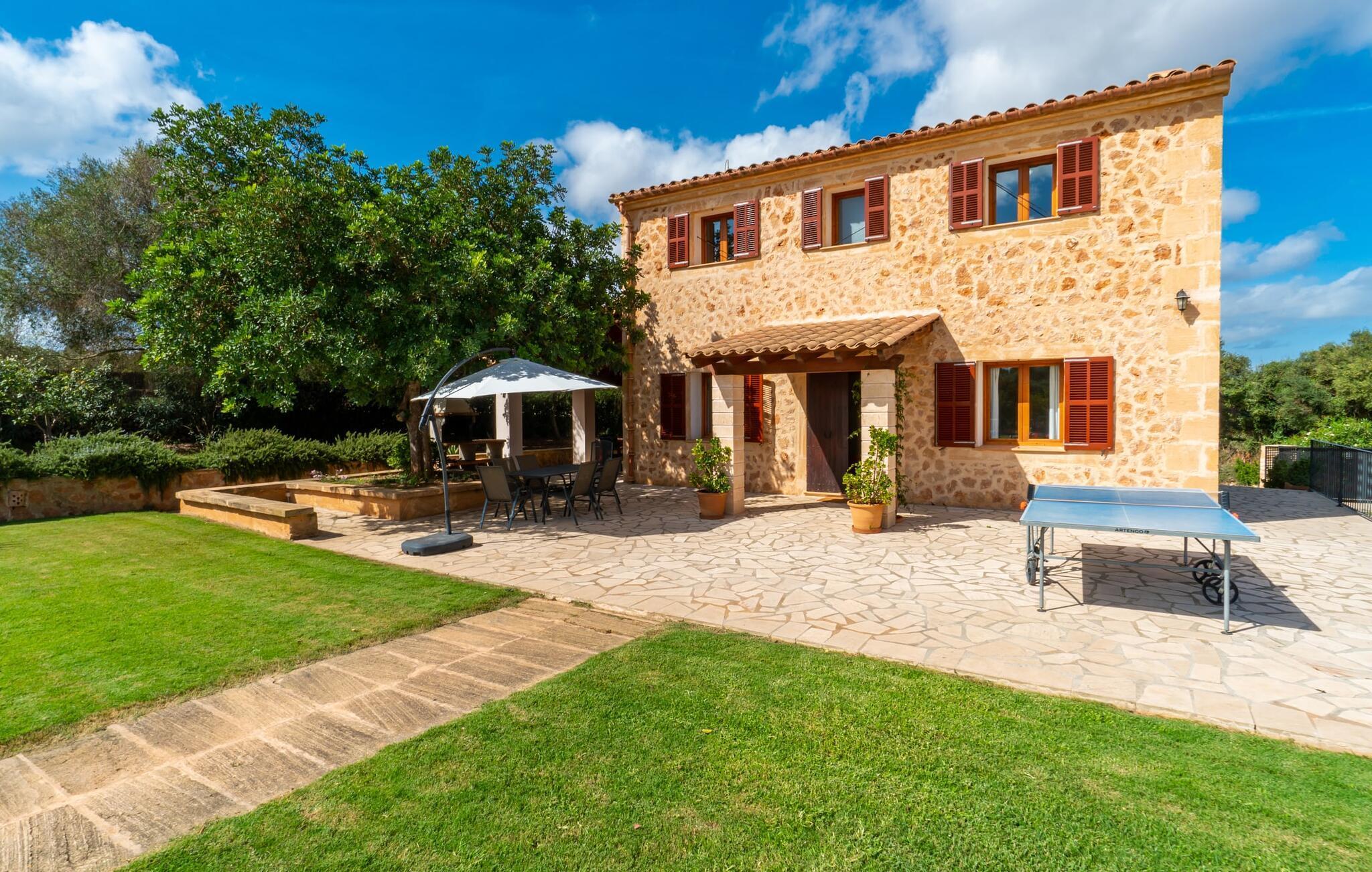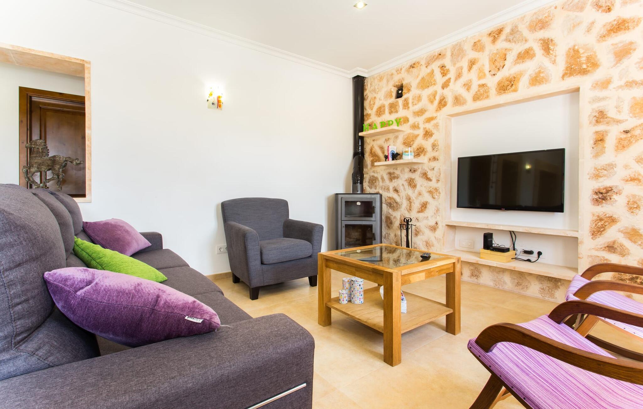 Der großzügige Innenraum ist ideal für einen erholsamen Urlaub mit der ganzen Familie. Im Erdgeschoss finden Sie ein helles Wohn- und Esszimmer mit Sitzgelegenheit und Kamin. Die moderne, gut ausgestattete Küche ist halboffen zum Essbereich. Sowohl von der Küche als auch vom Essbereich gibt es direkten Zugang zur überdachten Terrasse. Durch die breite Dusche und die Türen im Erdgeschoss ist dieser Teil der Finca für jedermann leicht zugänglich. Im Obergeschoss befinden sich drei weitere Doppelschlafzimmer und zwei Badezimmer. Die gemütlichen Schlafzimmer bieten einen schönen Ausblick auf die umliegende Landschaft und die Fenster lassen sich bequem mit Rollläden verdunkeln. Dieses entzückende Ferienhaus in der Nähe von Manacor bietet außerdem zuverlässigen Mobilfunkempfang, gutes WLAN und einen Schreibtisch.