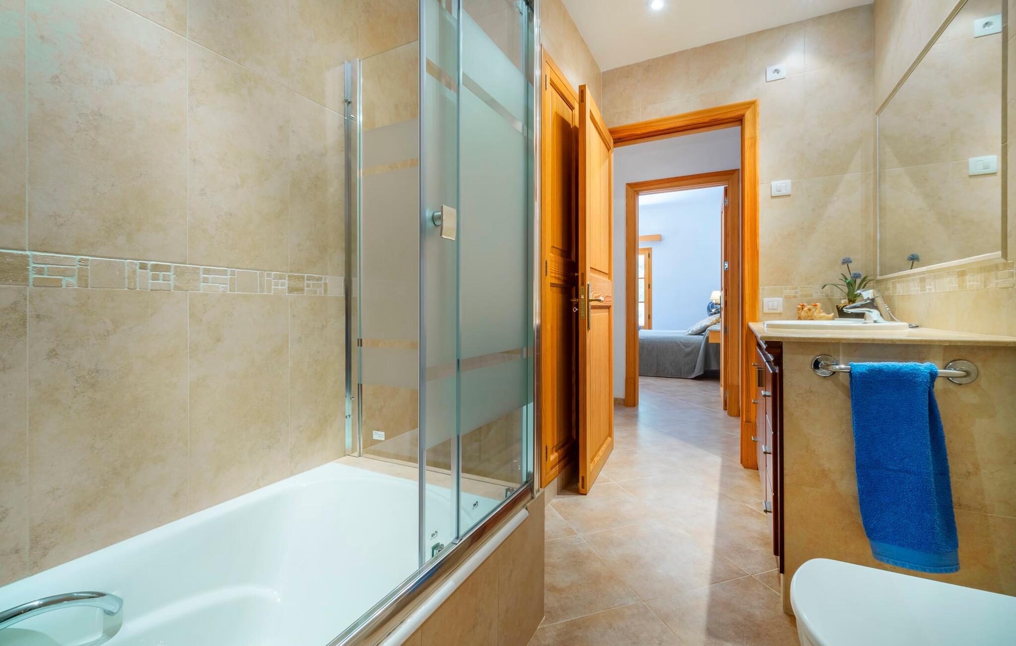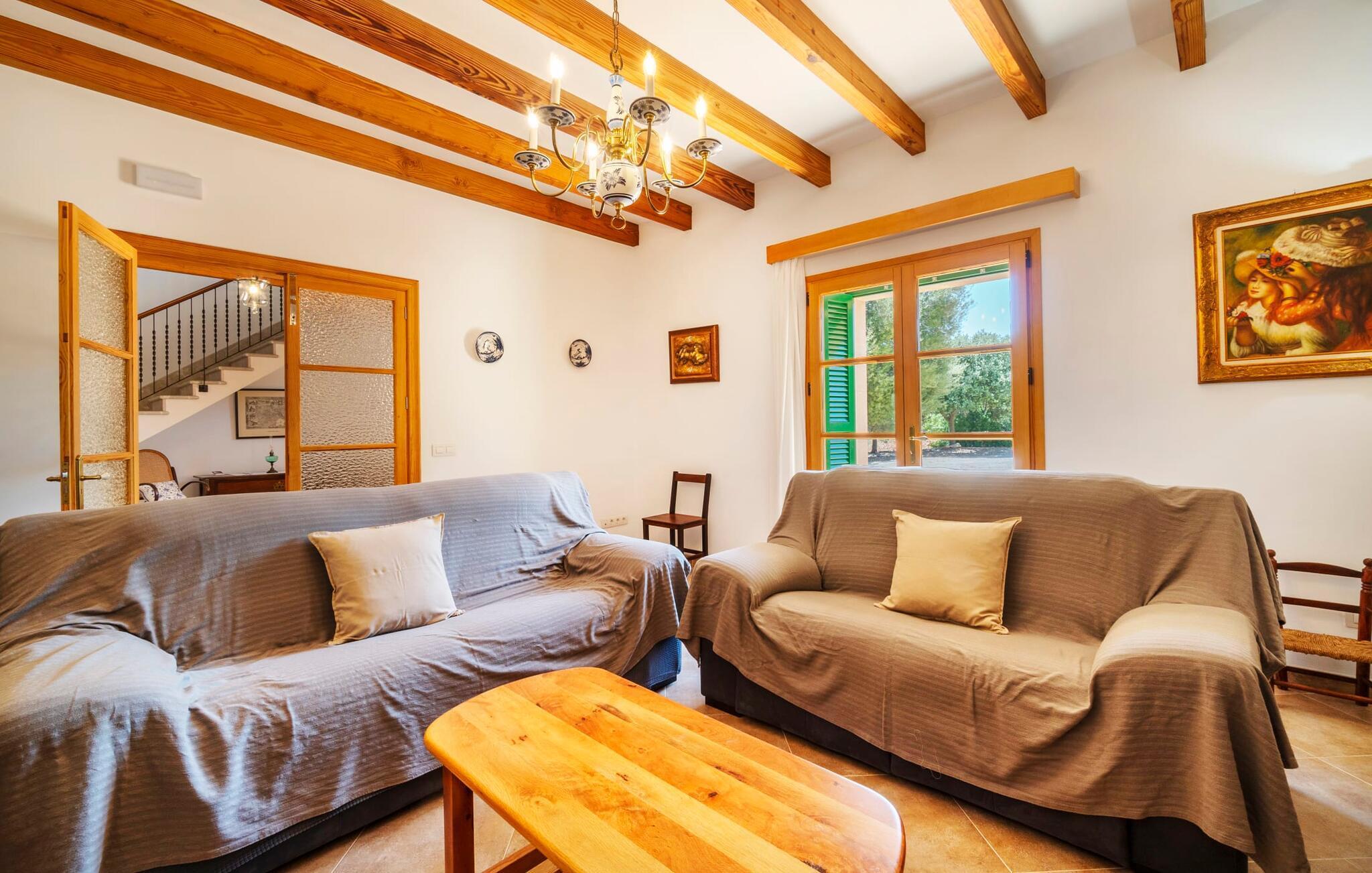 Das Interieur von „Son Fadrí“ ist mit Holzmöbeln ausgestattet, eine Anspielung auf die ländliche Umgebung, wobei Kiefernholz, Erbstücke und Mahagoni ausgestellt sind und die bewohnte, gemütliche Urlaubsatmosphäre unterstreichen. Die Zimmer sind schlicht und funktionell und entsprechen dem Geist des Hauses. Durch die Fenster strömt helles Sonnenlicht, was zur Dekoration der Villa nötig ist. Hohe Doppeltüren aus Glas führen vom Eingang und Flur in die Loungebereiche, die mit einem Kamin und einem Fernseher ausgestattet sind. Es gibt zwei Schlafzimmer im Erdgeschoss und drei im ersten Stock mit mehreren Waschgelegenheiten, darunter separate Duschen und Bäder mit Whirlpool. Und wenn Sie nicht alleine schlafen möchten, stehen Ihnen auch 2 Doppelzimmer zur Verfügung. Eine Innenküche mit Aga sowie eine praktische Außenküche und drei Esstische sorgen dafür, dass auch bei vollem Haus genügend Essen für alle da ist und für jeden Geschmack etwas dabei ist; Die perfekten Zutaten, um jeden Anlass zu feiern – lassen Sie es einfach zuerst vom Eigentümer laufen. Da das Anzünden von Feuer im Sommer nicht gestattet ist, steht für die Durchführung großer Grillfeste im Freien ein Elektrogrill zur Verfügung.
