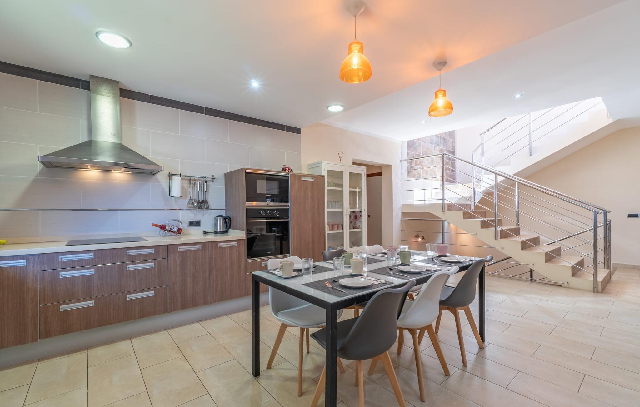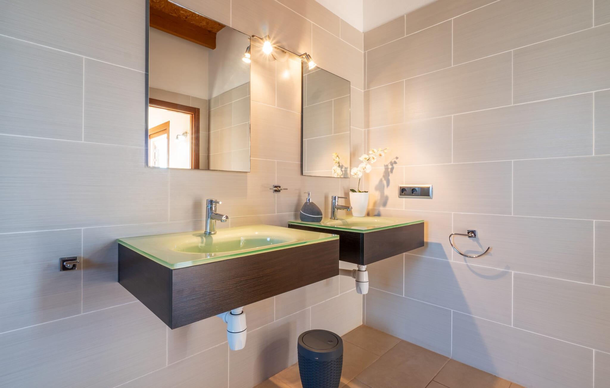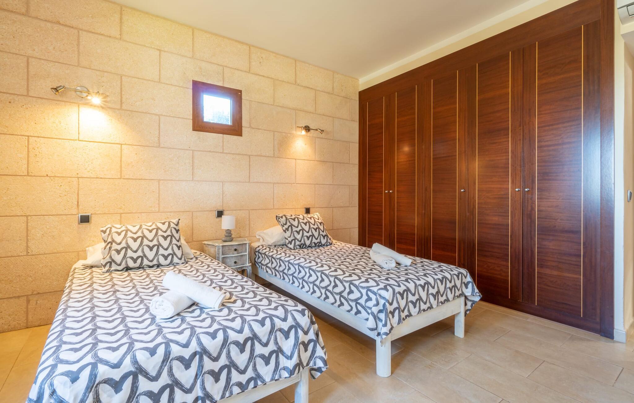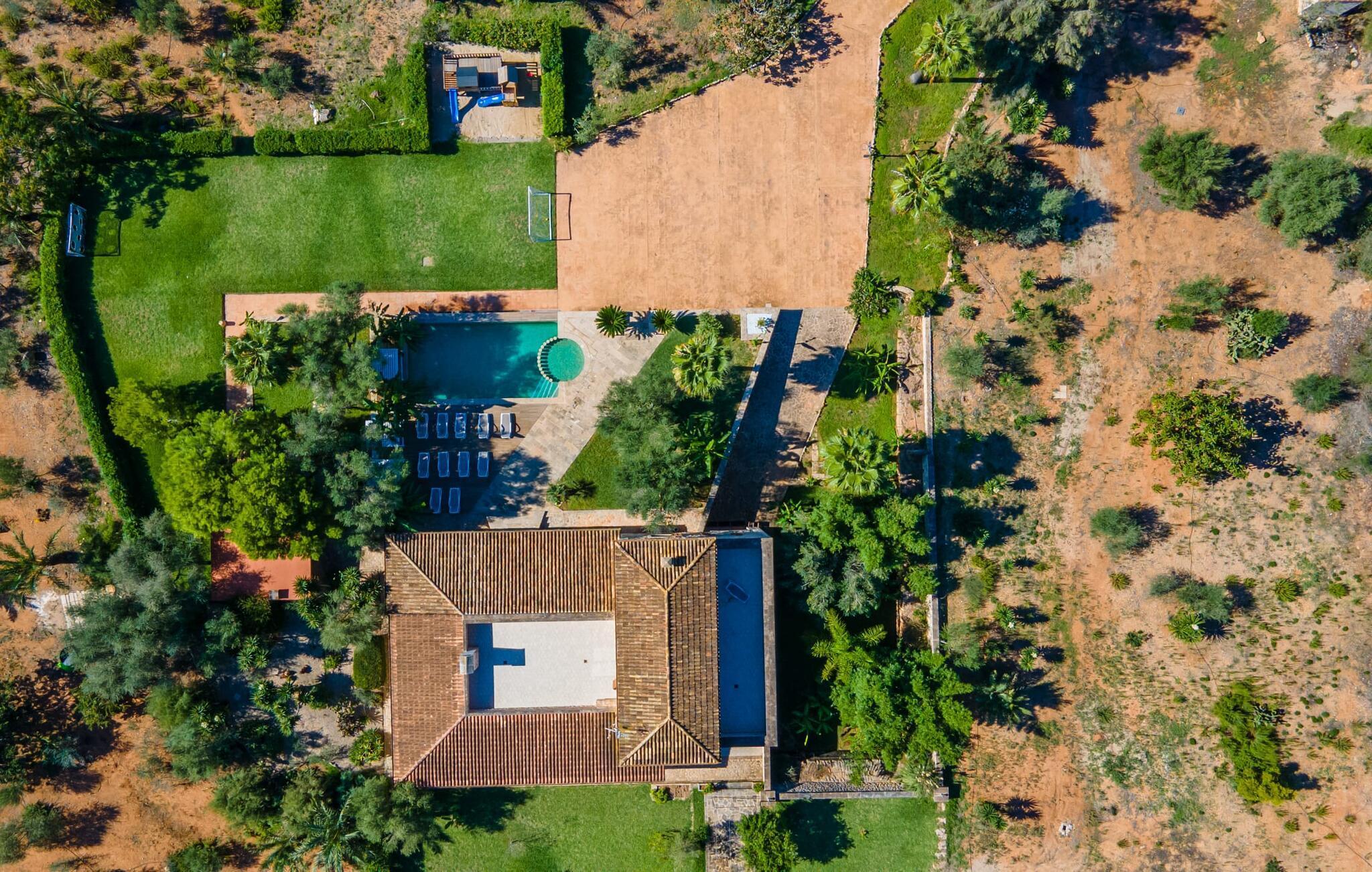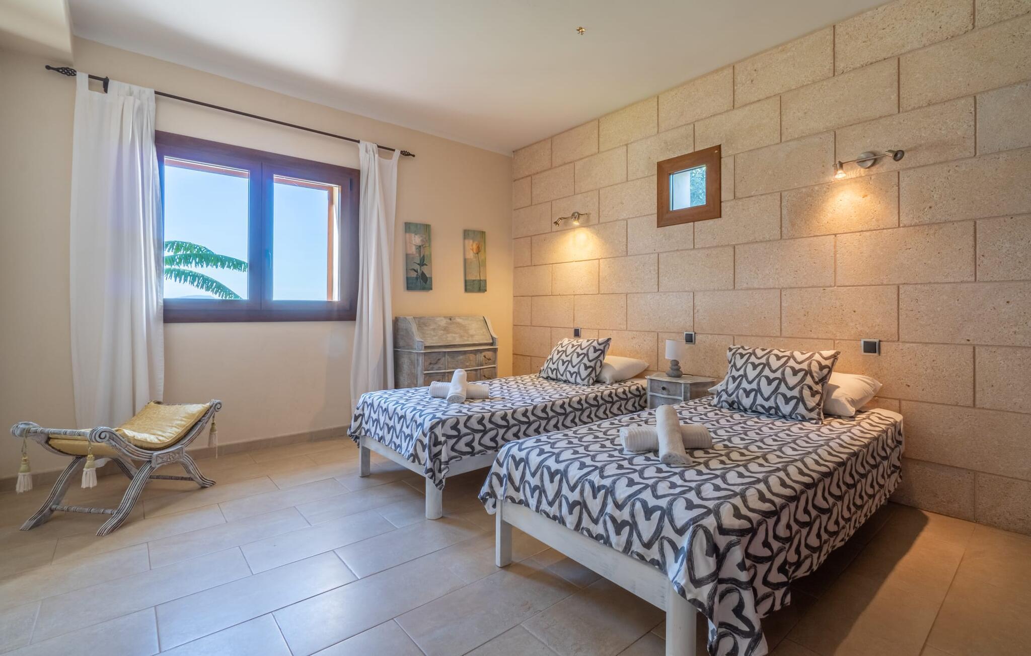 Das optisch ansprechende Natursteinhaus bietet mit seinen 335 m² Platz für eine große Gruppe von bis zu 12 Personen. Der Wohn- und Essbereich ist hell und offen gestaltet und verfügt über bequeme Sofas, einen Kamin und zwei Esstische. Die Küche in Holz- und Edelstahloptik verfügt über alle notwendigen Annehmlichkeiten. Eine Kaffeemaschine, ein großer Kühlschrank, Backofen und Mikrowelle in angenehmer Höhe sowie eine Spülmaschine – das sind nur einige der vielen Ausstattungsmerkmale. Durch eines der vielen bodentiefen Holzfenster gelangen Sie auf die überdachte Terrasse, um an der langen Tafel ein herzhaftes Frühstück zu genießen. Fünf der Schlafzimmer verfügen über Doppelbetten, während das andere ein Zweibettzimmer ist. Für die insgesamt sechs Schlafzimmer stehen fünf Badezimmer zur Verfügung. Jeder Raum im ganzen Haus verfügt über eine individuelle Klimaanlage und kann auch außerhalb der Sommersaison beheizt werden. Wenn Sie die unglaubliche Aussicht über die Landschaft von oben genießen möchten, betreten Sie die große Terrasse im Obergeschoss mit Blick auf die endlose Weite der mallorquinischen Ebene.