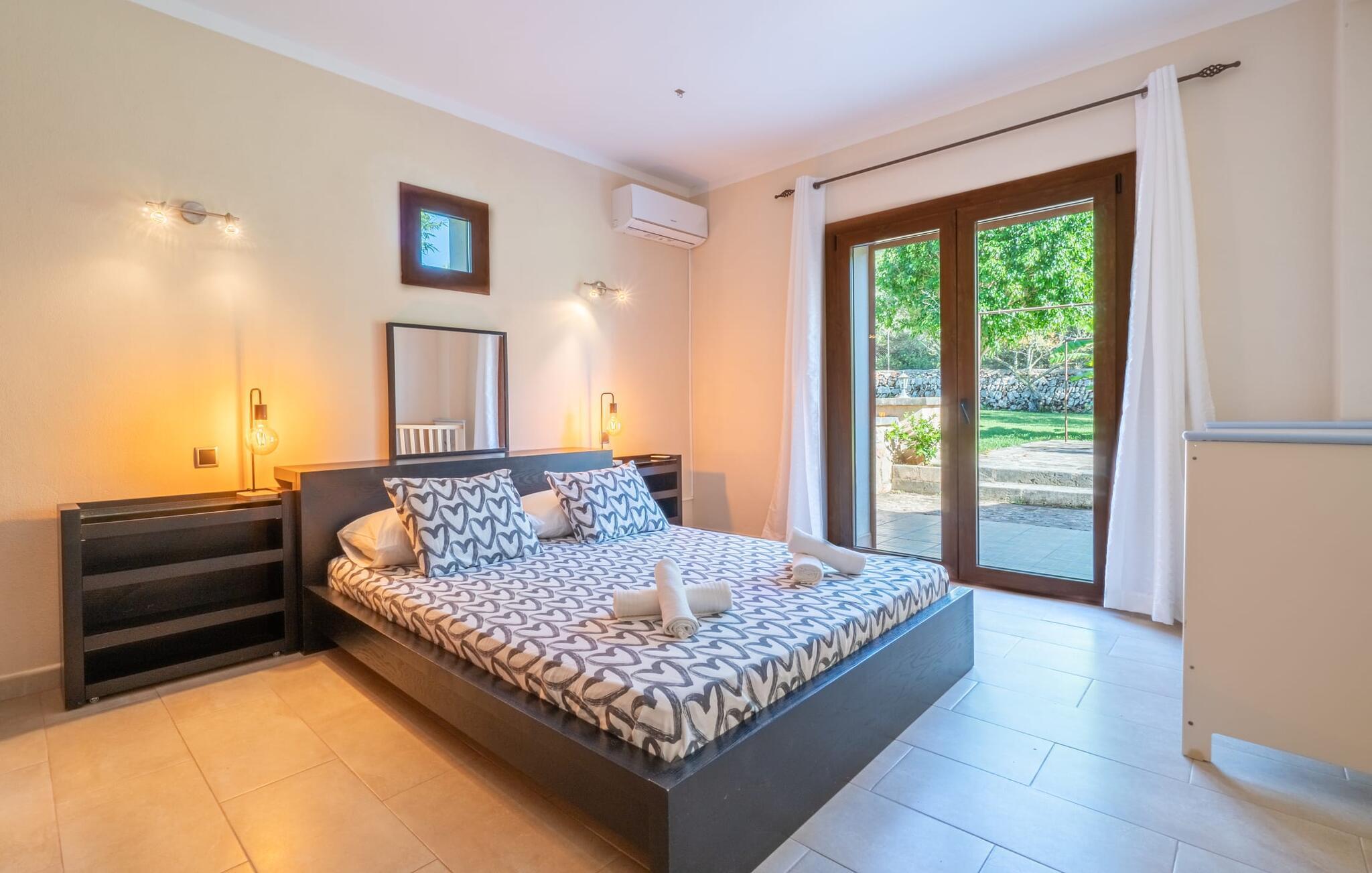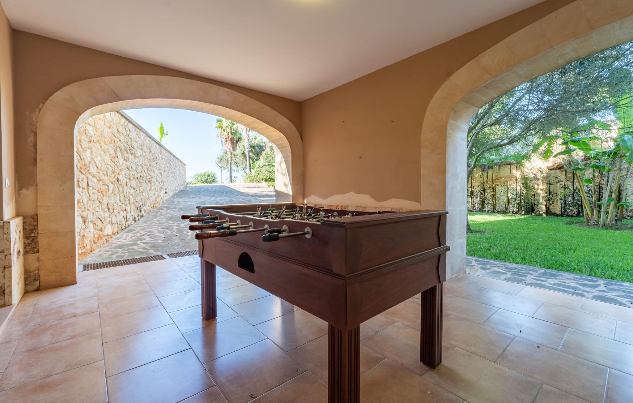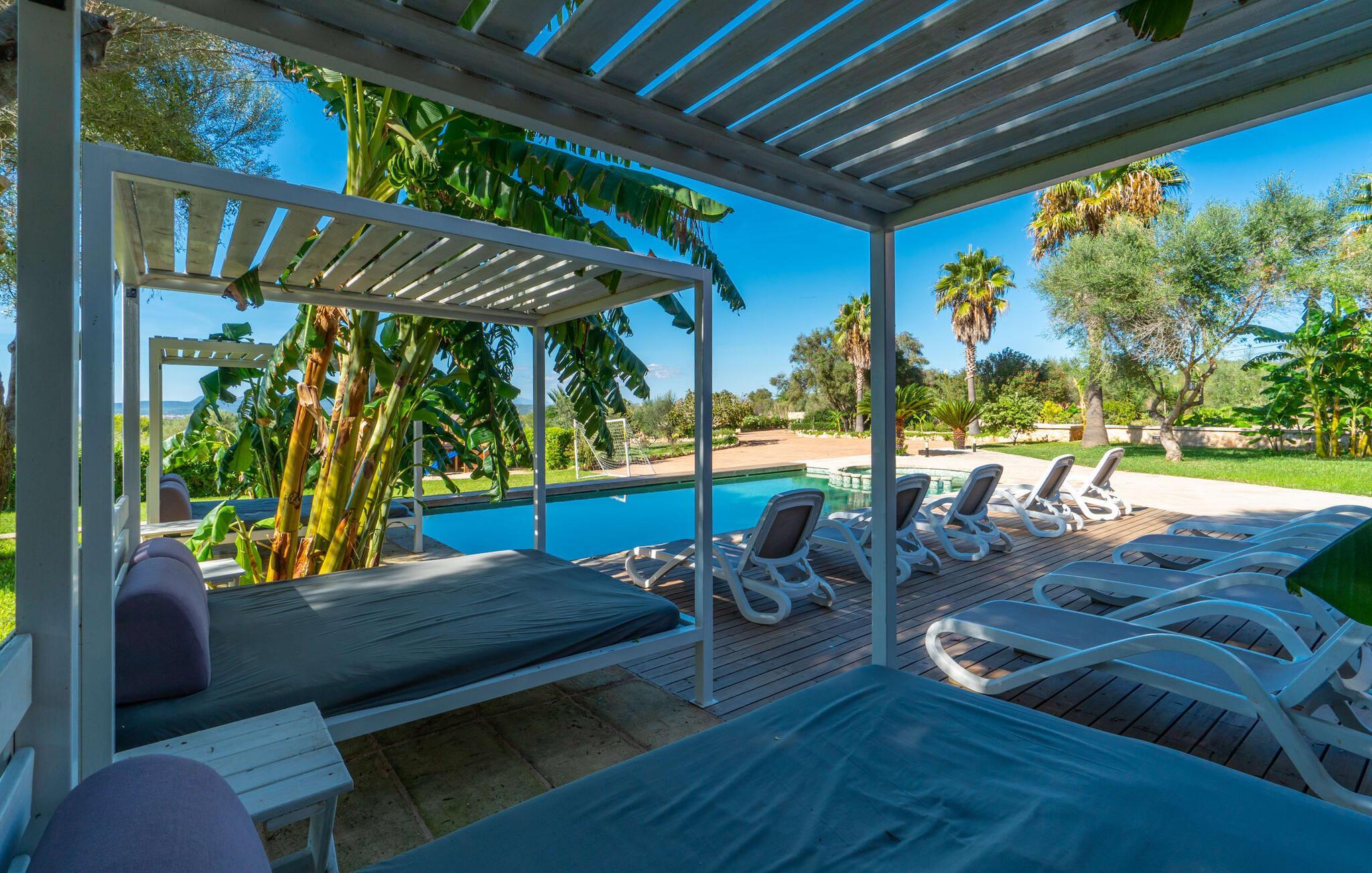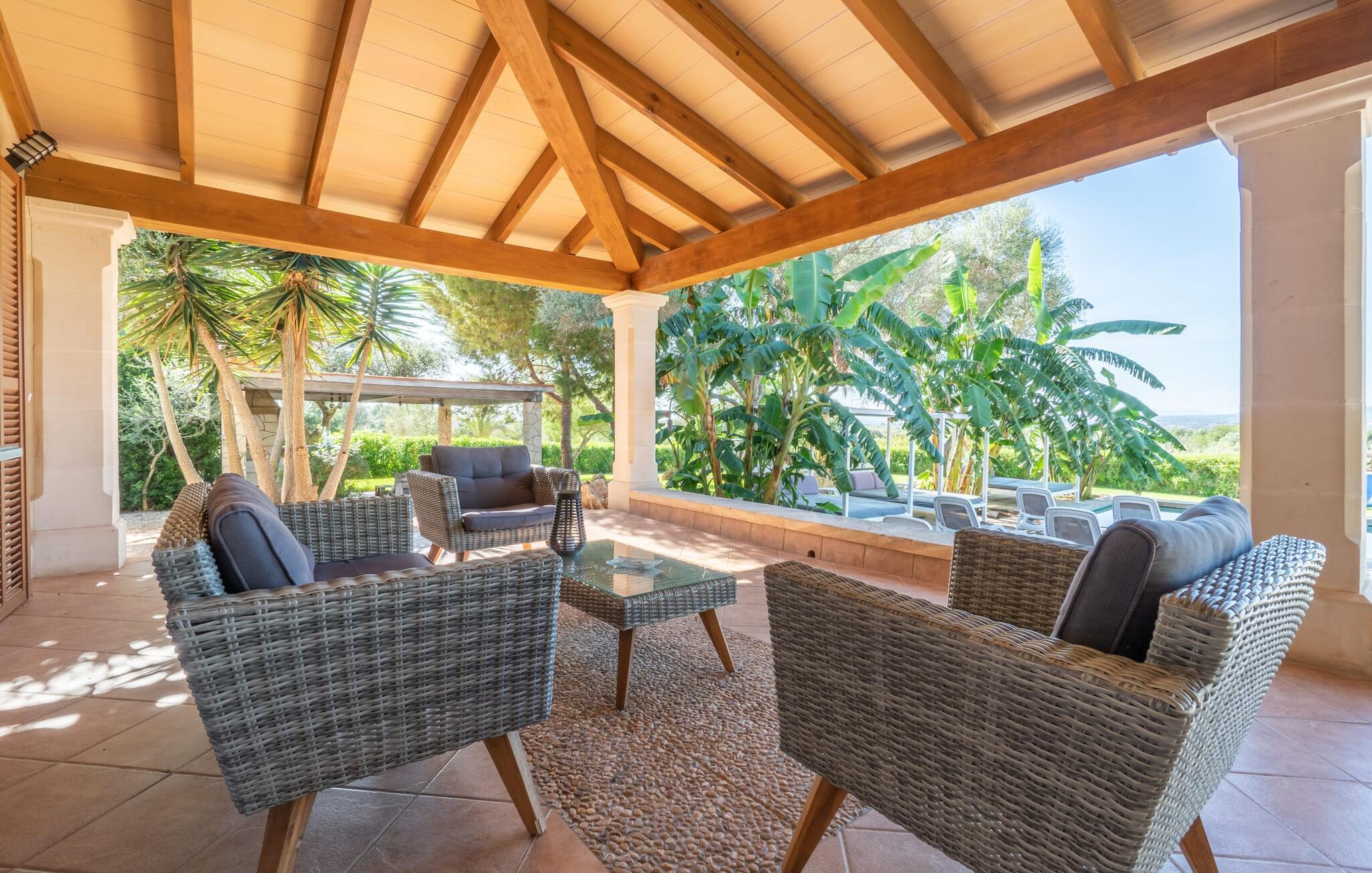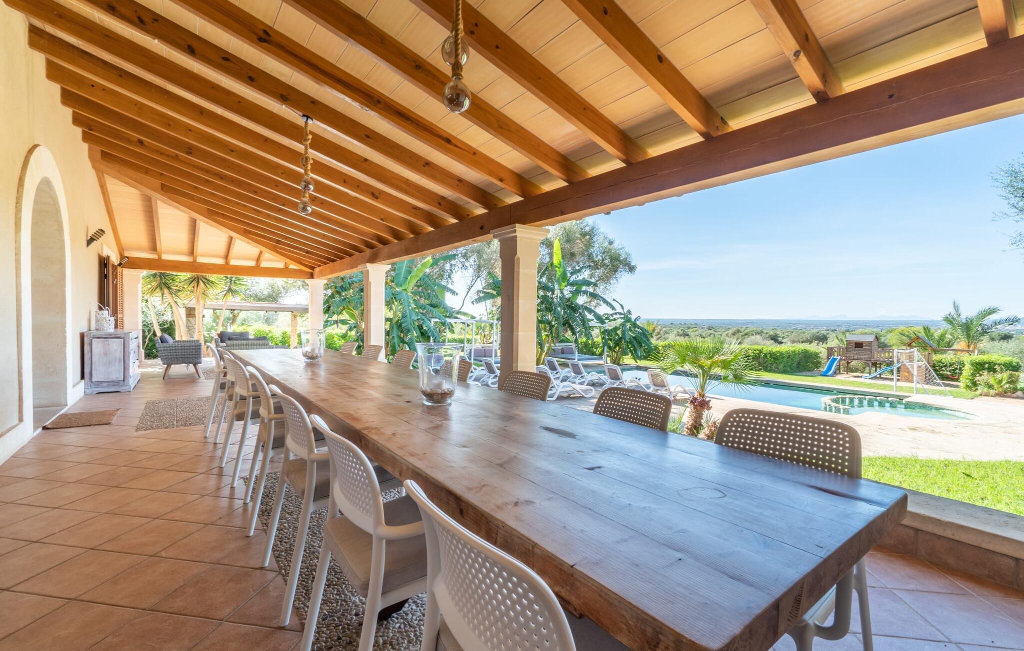 Die Villa „Son Figo“ verfügt über eine moderne Ausstattung und eine unglaubliche Alleinlage auf einem 20.000 m² großen Grundstück mit einem liebevoll gestalteten Garten und einem fantastischen Panorama über den flachen Abschnitt der Südostküste sowie über Plà de Mallorca bis hin zur Insel Tramuntana-Gebirge. Das Natursteinhaus ist im typisch mallorquinischen Stil gehalten und verfügt über mehrere Terrassen, von denen einige überdacht sind. Die größte überdachte Veranda befindet sich vor dem Haus und verfügt auf der einen Seite über einen großen Esstisch und auf der anderen Seite über bequeme Loungemöbel. Von hier aus genießen Sie den herrlichen Blick über das Anwesen, den Pool sowie die ländliche Weite bis zum Horizont. Der Pool, der Whirlpool und die Außendusche sind in eine Terrasse aus Naturstein und Holz integriert. Für alle Gäste stehen ausreichend Sonnenschirme und Liegestühle zur Verfügung. Das flachere Kinderbecken ist etwas vom Rest des Beckens getrennt, sodass Kinder sicher schwimmen und planschen können. Um aktiv zu bleiben, gibt es für die Kinder einen kleinen Spielbereich; Sie können sie von der Terrasse aus bequem im Auge behalten. Darüber hinaus steht Ihnen ein fester Grill zur Zubereitung herrlich frischer Köstlichkeiten zur Verfügung.