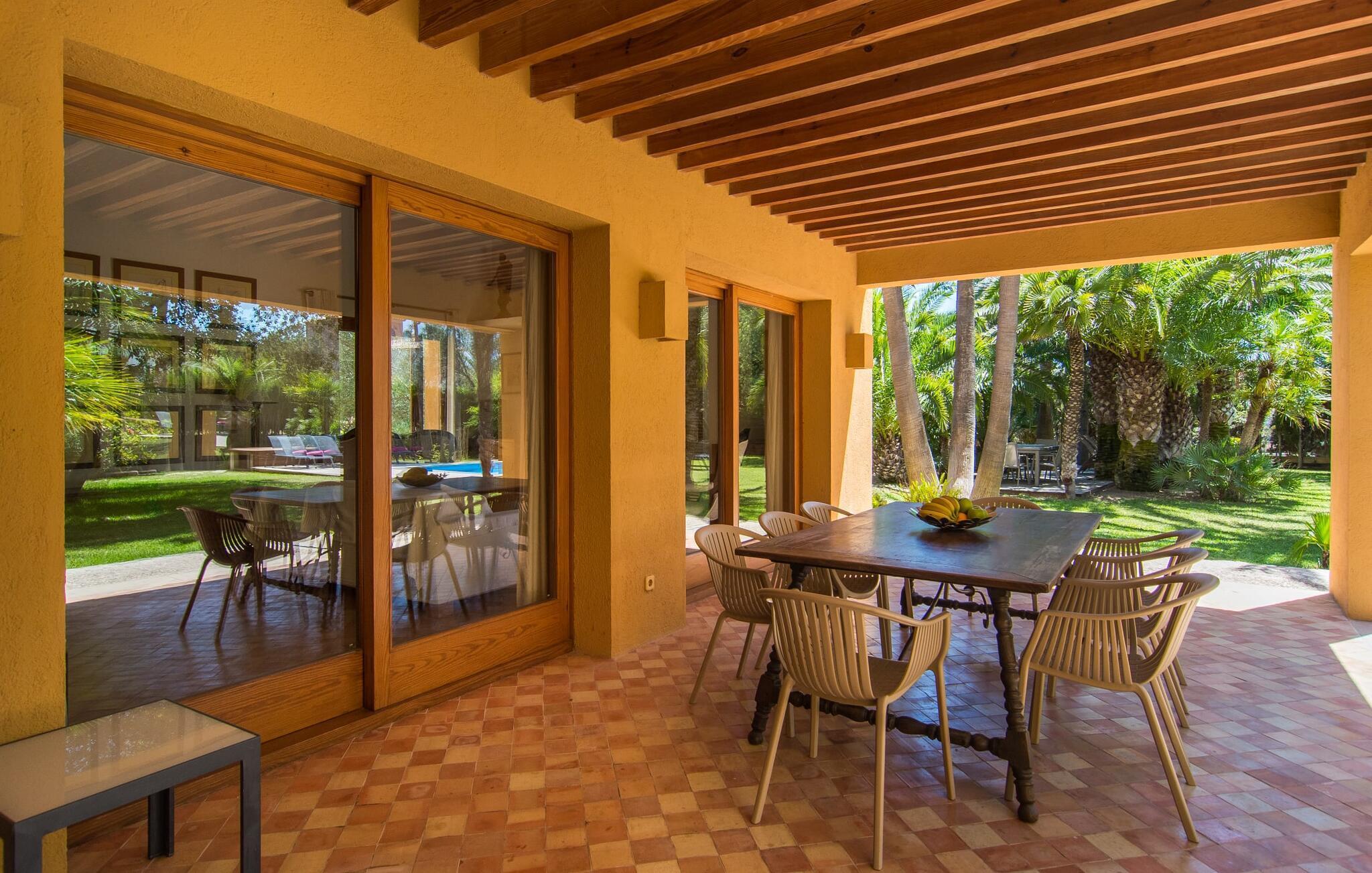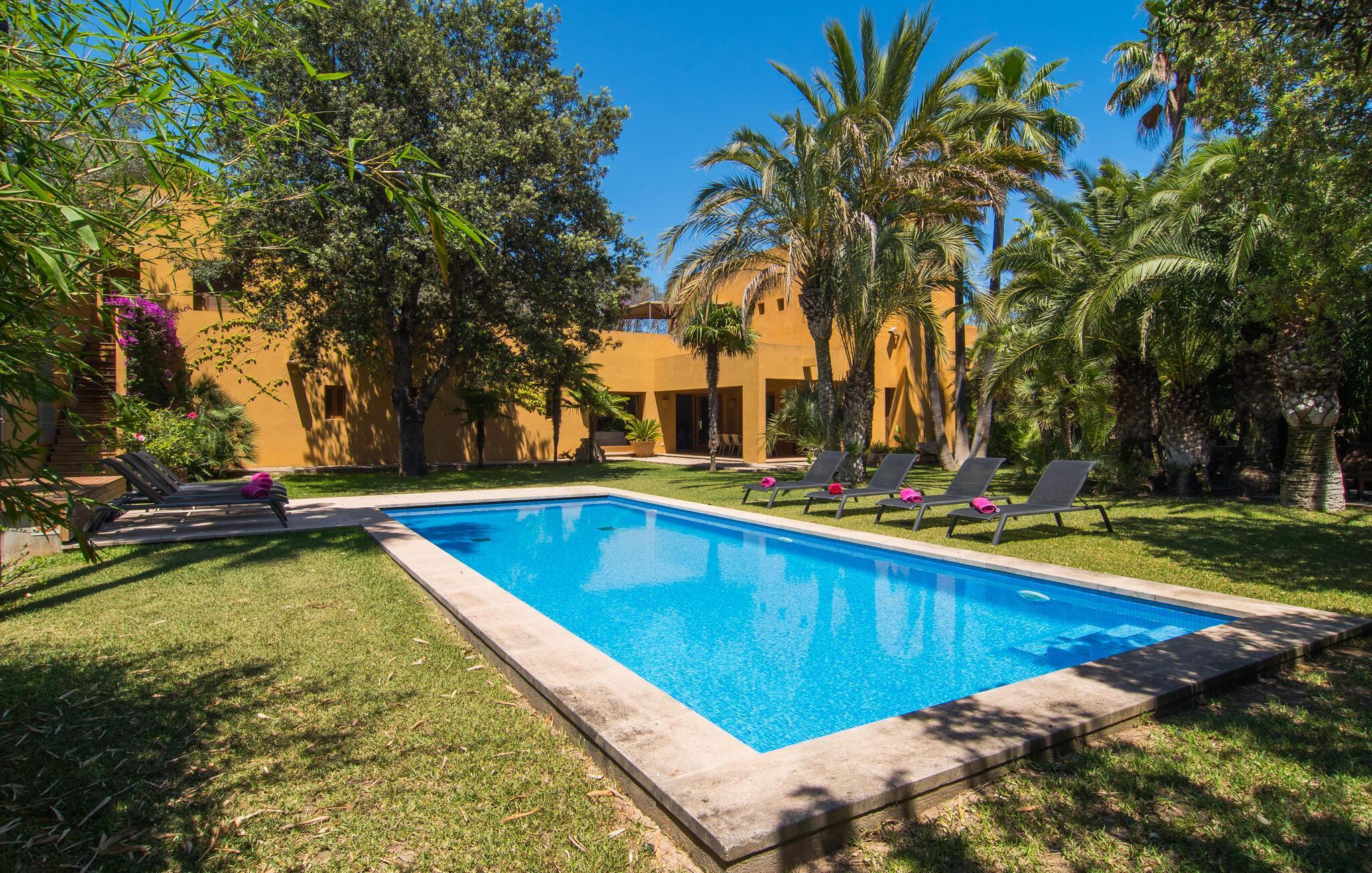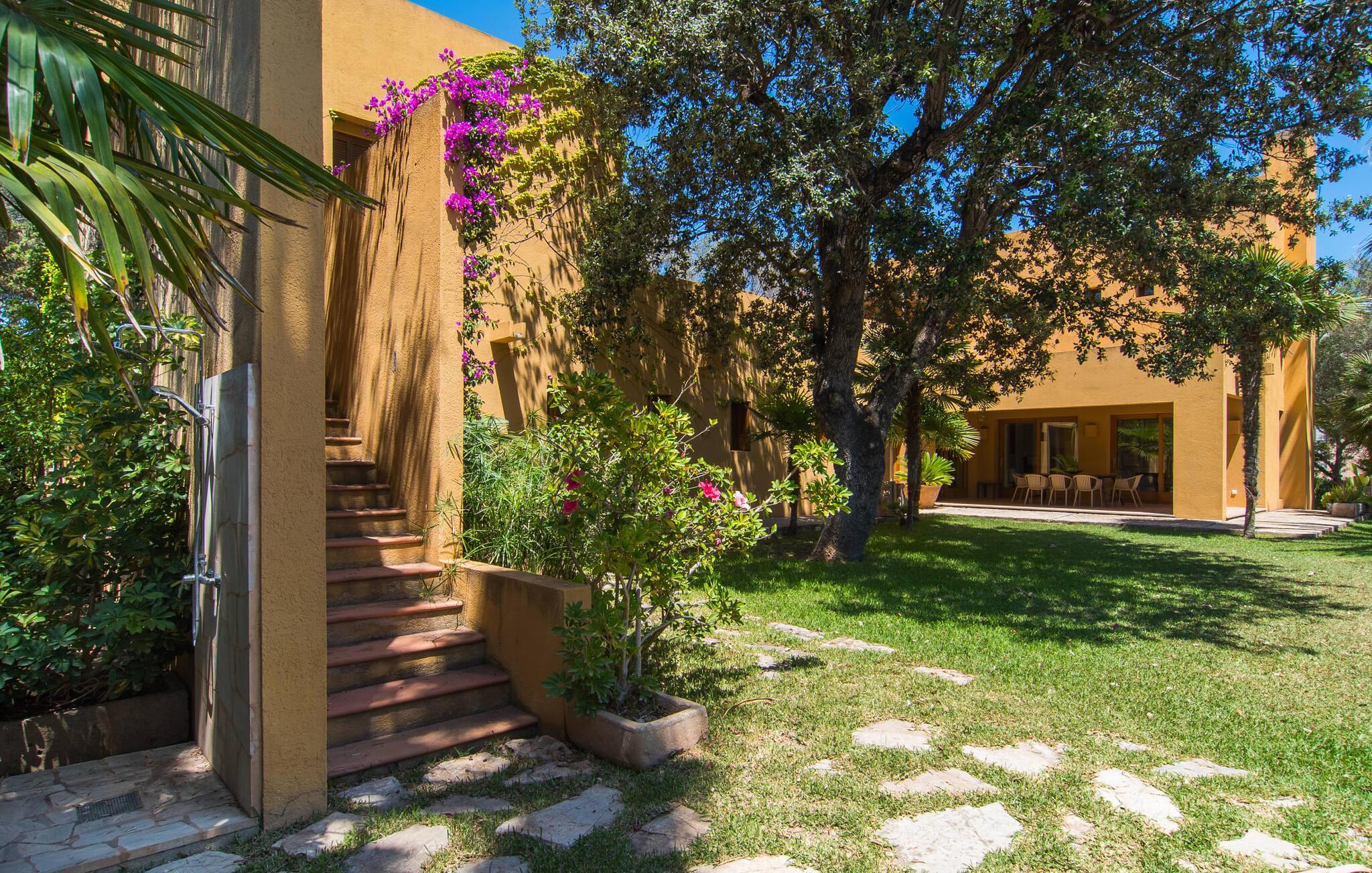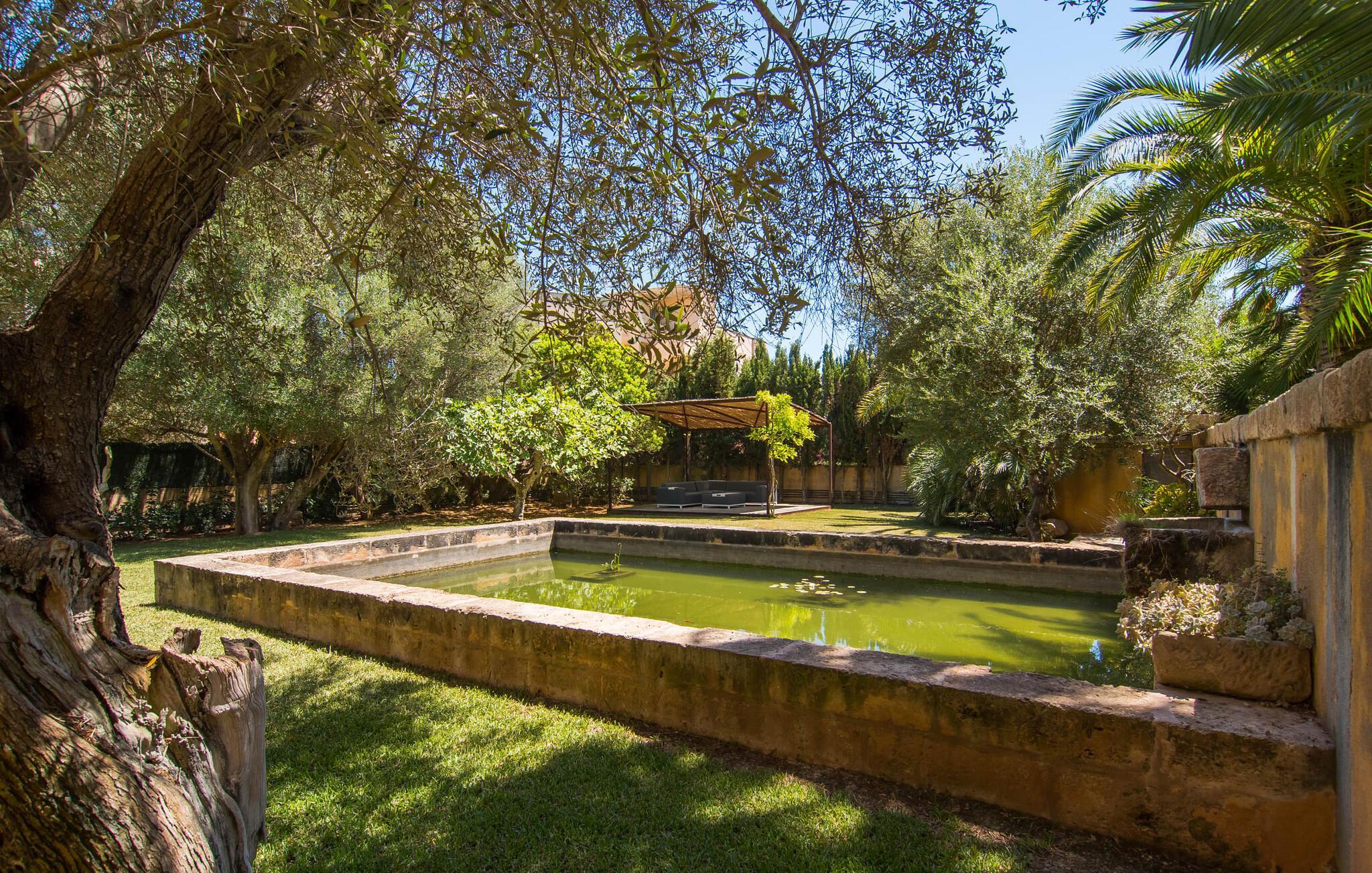 Mit ihrer architektonischen Individualität, einem oasenartigen Garten und einer absolut traumhaften Innenausstattung beeindruckt die sonnengelbe Villa „Son Floriana“. Dem Architekten/Eigentümer dieses ästhetisch ansprechenden Anwesens ist es gelungen, seine beeindruckenden Ideen perfekt in die Realität umzusetzen. Das L-förmige Gebäude ist ideal für Reisende, die eine gewisse Autonomie bevorzugen, aber dennoch gerne zu Fuß unterwegs sind. Die Tatsache, dass das nach Süden ausgerichtete Haus in einem Wohngebiet liegt, stört nicht, da der Außenbereich mit seinem paradiesischen Garten und dem großen Pool nicht einsehbar ist. Der riesige Garten voller hoher Palmen und üppiger mediterraner Vegetation erstreckt sich über zwei verschiedene Ebenen. Auf der ersten Seite befindet sich der großzügige Pool mit Sonnenterrasse und weitläufiger Rasenfläche. Auf der zweiten Ebene, friedlich eingebettet unter einem Bambusdach und im Schatten der umliegenden Bäume, befindet sich ein Fischteich. Eine Insel der Entspannung für die großen Gäste, aber auch ein toller Ort zum Spielen für die Kleinen. Auf dem Gelände gibt es zahlreiche Sitzgelegenheiten: Wählen Sie zwischen den gemütlichen Sitzgelegenheiten unter dem Binsen- oder Baldachin, dem süßen kleinen Plätzchen im Schatten der Palmen oder dem Essbereich auf der überdachten Veranda. Auch wenn Sie mehrere Personen in Ihrer Gruppe haben, findet jeder seinen eigenen Lieblingsplatz zum Entspannen und Entspannen.