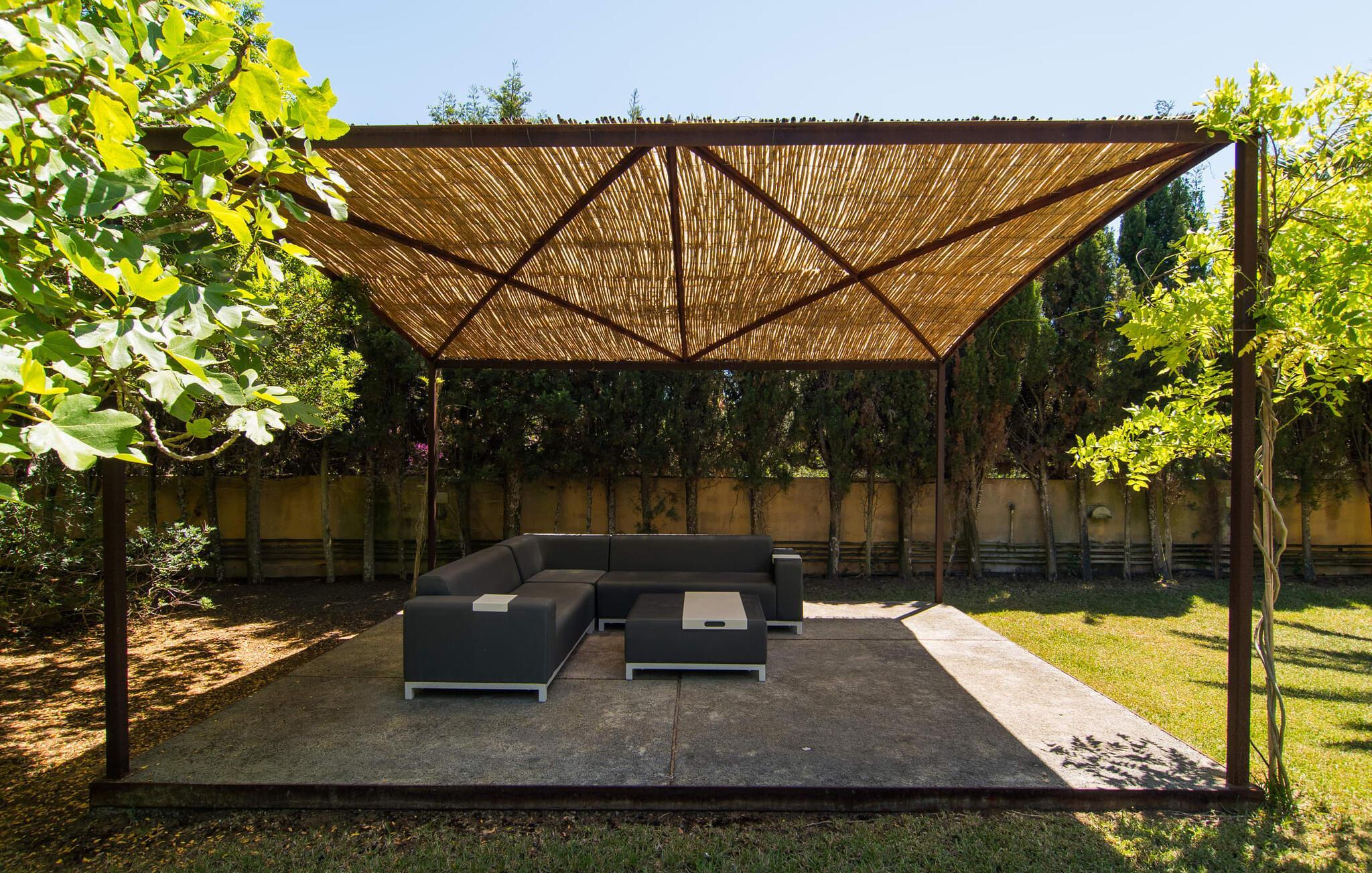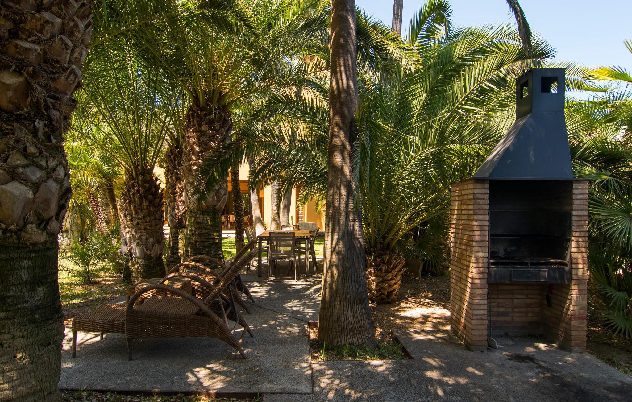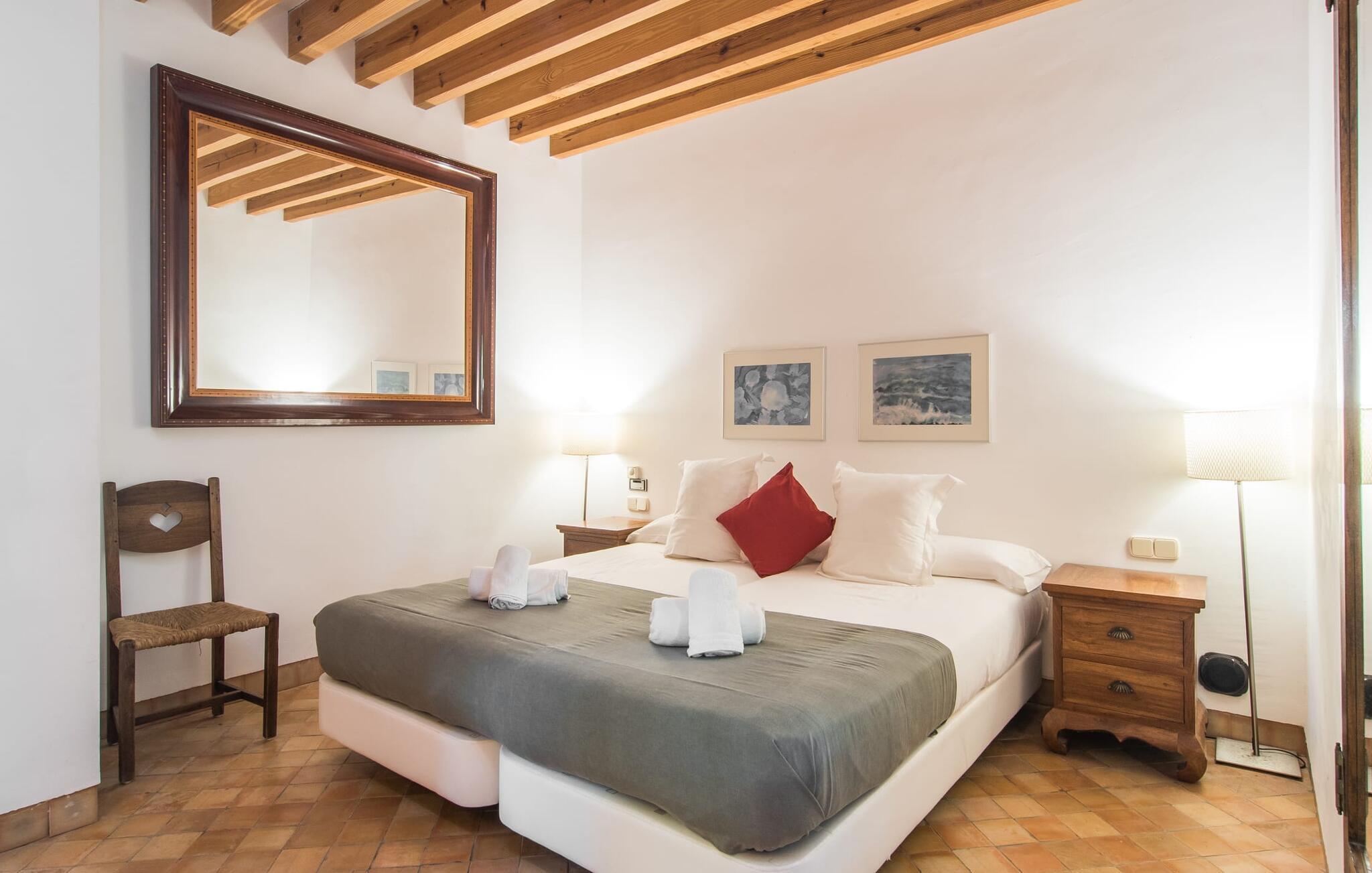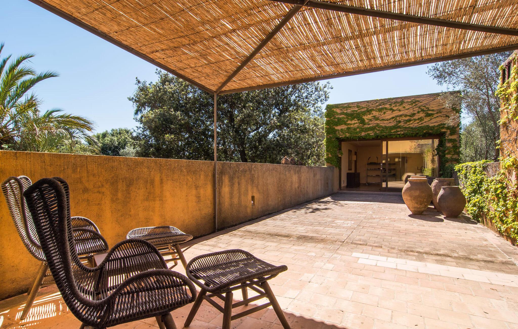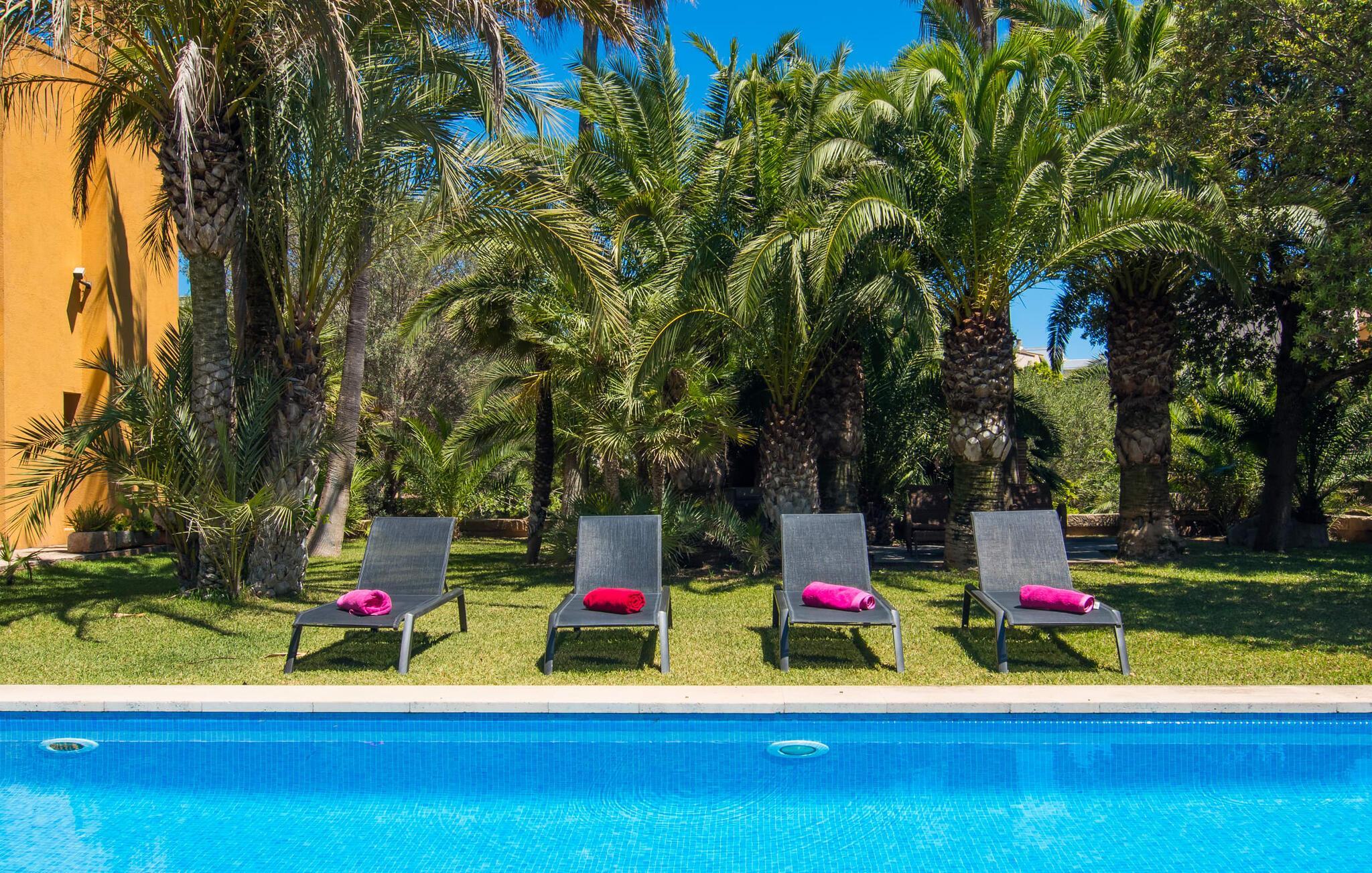 Mit ihrer architektonischen Individualität, einem oasenartigen Garten und einer absolut traumhaften Innenausstattung beeindruckt die sonnengelbe Villa „Son Floriana“. Dem Architekten/Eigentümer dieses ästhetisch ansprechenden Anwesens ist es gelungen, seine beeindruckenden Ideen perfekt in die Realität umzusetzen. Das L-förmige Gebäude ist ideal für Reisende, die eine gewisse Autonomie bevorzugen, aber dennoch gerne zu Fuß unterwegs sind. Die Tatsache, dass das nach Süden ausgerichtete Haus in einem Wohngebiet liegt, stört nicht, da der Außenbereich mit seinem paradiesischen Garten und dem großen Pool nicht einsehbar ist. Der riesige Garten voller hoher Palmen und üppiger mediterraner Vegetation erstreckt sich über zwei verschiedene Ebenen. Auf der ersten Seite befindet sich der großzügige Pool mit Sonnenterrasse und weitläufiger Rasenfläche. Auf der zweiten Ebene, friedlich eingebettet unter einem Bambusdach und im Schatten der umliegenden Bäume, befindet sich ein Fischteich. Eine Insel der Entspannung für die großen Gäste, aber auch ein toller Ort zum Spielen für die Kleinen. Auf dem Gelände gibt es zahlreiche Sitzgelegenheiten: Wählen Sie zwischen den gemütlichen Sitzgelegenheiten unter dem Binsen- oder Baldachin, dem süßen kleinen Plätzchen im Schatten der Palmen oder dem Essbereich auf der überdachten Veranda. Auch wenn Sie mehrere Personen in Ihrer Gruppe haben, findet jeder seinen eigenen Lieblingsplatz zum Entspannen und Entspannen.
