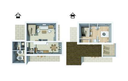 Im Inneren verbindet sich moderner Komfort mit rustikalem Charme. Das offene Wohnzimmer, der Essbereich und die Küche bieten eine einladende Atmosphäre mit viel natürlichem Licht, das durch große Fenster fällt. Die Küche ist mit allem Notwendigen ausgestattet, und der Esstisch bietet Platz für sechs Personen. Es gibt zwei Schlafzimmer: ein Zweibettzimmer im Erdgeschoss und ein offenes Hauptschlafzimmer mit einem Queensize-Bett (1,6 m) und eigenem Bad im Obergeschoss. Das Hauptschlafzimmer führt zu einer privaten Terrasse mit atemberaubender Aussicht, was es zu einem idealen Rückzugsort für Paare oder kleine Gruppen macht.
