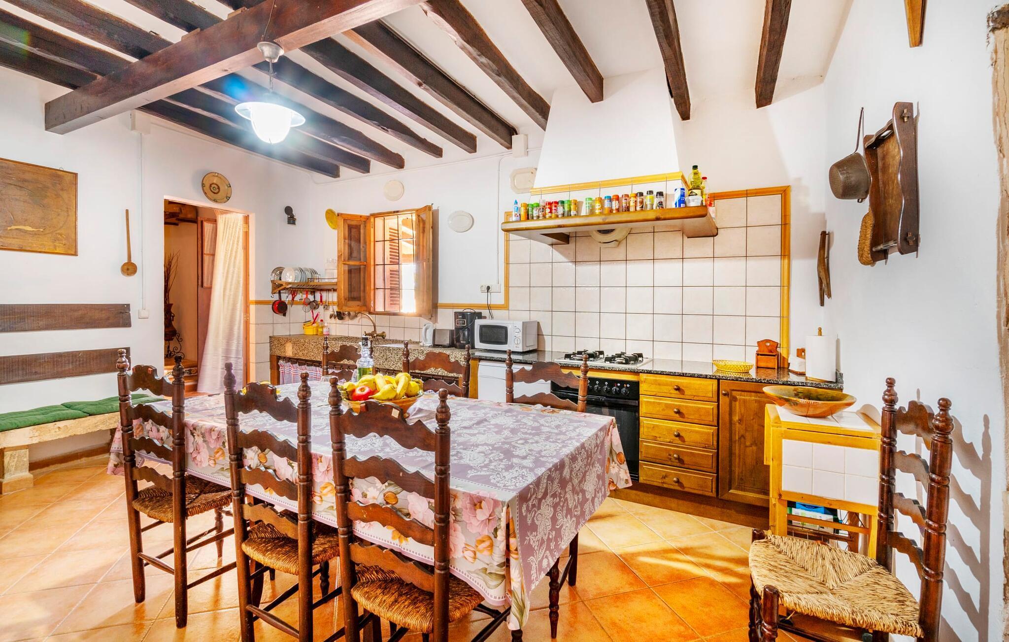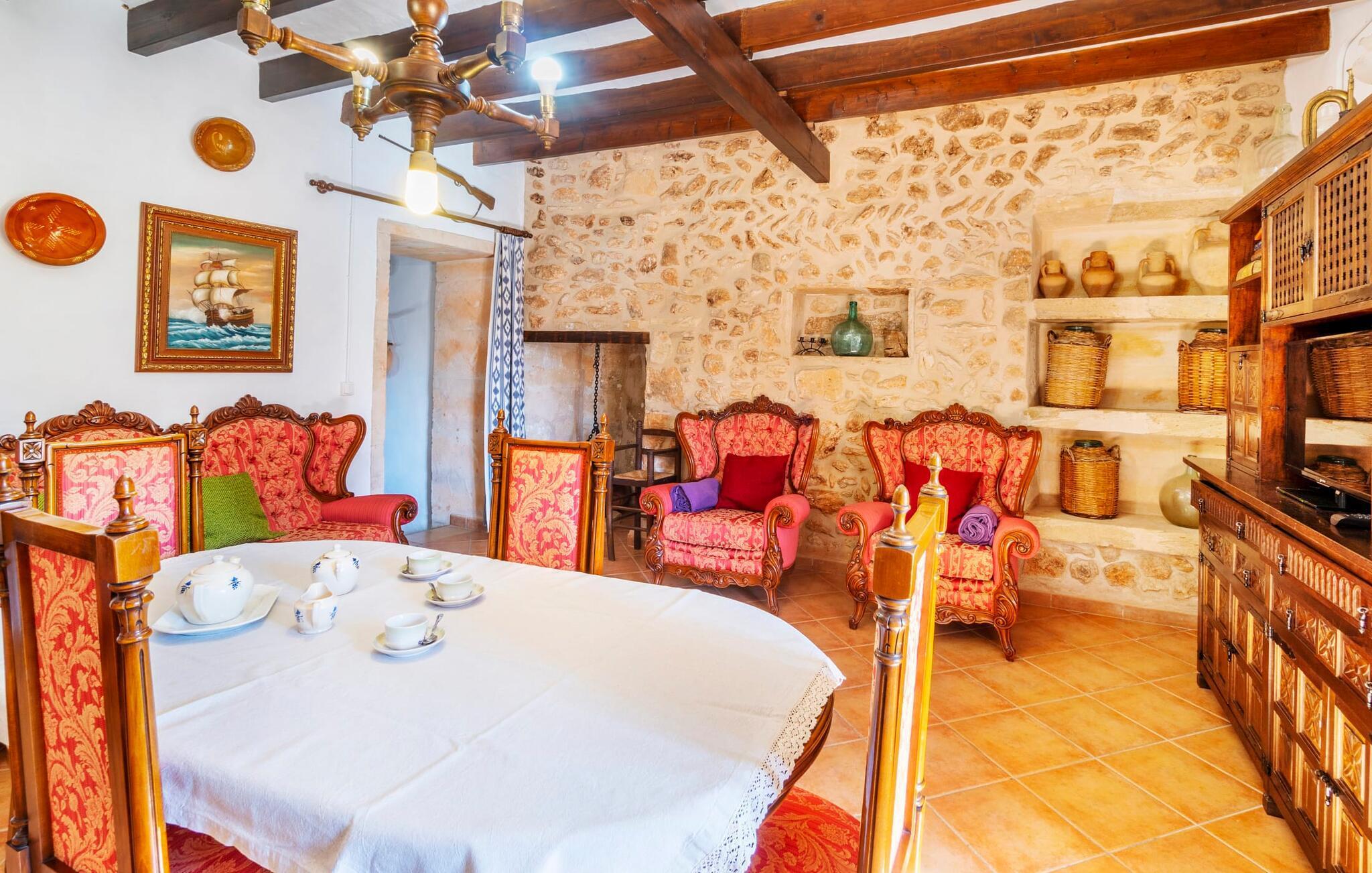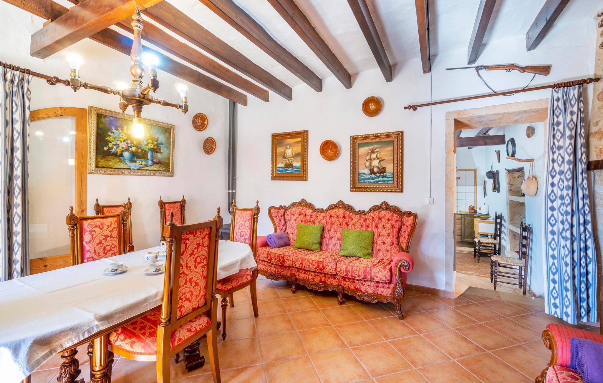 Das Haus selbst ist wie folgt aufgeteilt: Im Erdgeschoss gibt es einen atemberaubenden Eingangsbereich, eine geräumige Küche mit Esstisch, ein Fernsehzimmer und ein Badezimmer. Es gibt auch eine Treppe, die in den Keller führt. Im Obergeschoss befinden sich die vier Schlafzimmer und zwei Badezimmer. Eines davon ist von außen zugänglich, sodass Sie vom Schlafzimmer aus über den Balkon ins Badezimmer gelangen. Das Innere der Villa „Son Gabriela“ wurde im typisch mallorquinischen Stil gestaltet, was dem Anwesen eine besonders urige Atmosphäre verleiht. Im gesamten Anwesen werden Sie auf eine Fülle wunderschöner, echter antiker Möbel stoßen, die perfekt mit den farbenfrohen Wänden, den freiliegenden Balken und den Terrakottafliesen harmonieren. Hier und da sind dekorative Natursteinelemente zu sehen. Eine Vielzahl unterschiedlicher Wohnbereiche machen es Ihnen allen leicht, sich nach Herzenslust auszubreiten und mindestens einen der vielen einladenden Plätze zu finden, die zum ausgiebigen Entspannen einladen. Die gemütliche Küche ist bestens für den täglichen Bedarf ausgestattet und bietet vom Wasserkocher bis zur Filterkaffeemaschine alles. Für kühle Abende gibt es sogar einen Kamin, an dem Sie gemeinsam am Esstisch sitzen und eine Mahlzeit genießen können. In spektakulär schönen Schlafzimmern findet jeder einen Platz zum Ausruhen, der genau seinen Wünschen entspricht. Auch hier finden wir antikes Flair und ein absolut charmantes Arrangement. Die Badezimmer sind in einem modernen und sehr geschmackvollen Stil eingerichtet. Das Mitbringen eines eigenen Bügeleisens und Haartrockners ist nicht erforderlich, da diese bereits vor Ort vorhanden sind und während Ihres Urlaubs kostenfrei genutzt werden können. Im Keller können Sie Ihre Lebensmittel bequem gekühlt aufbewahren.