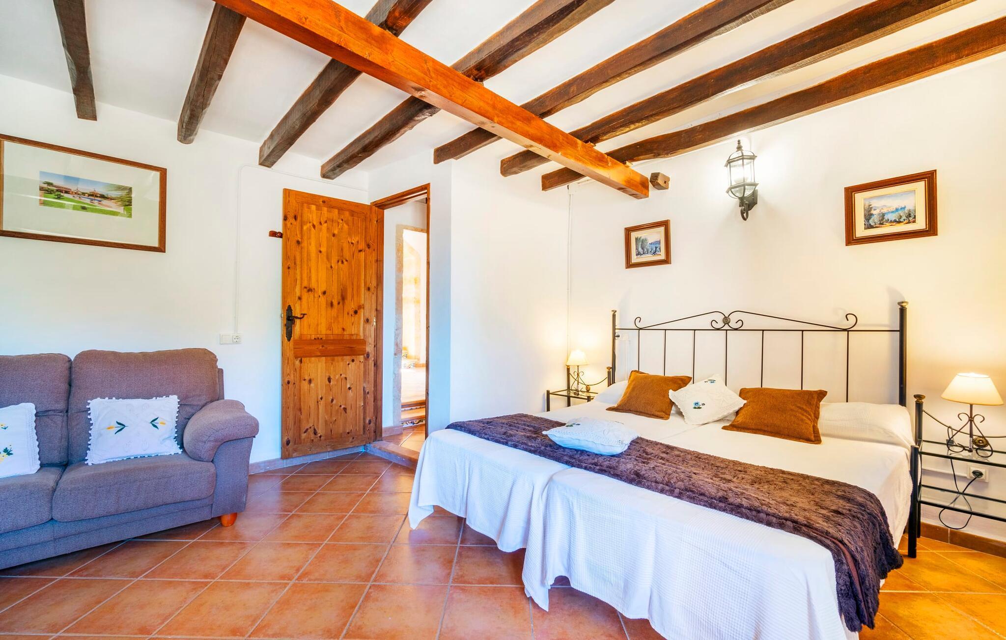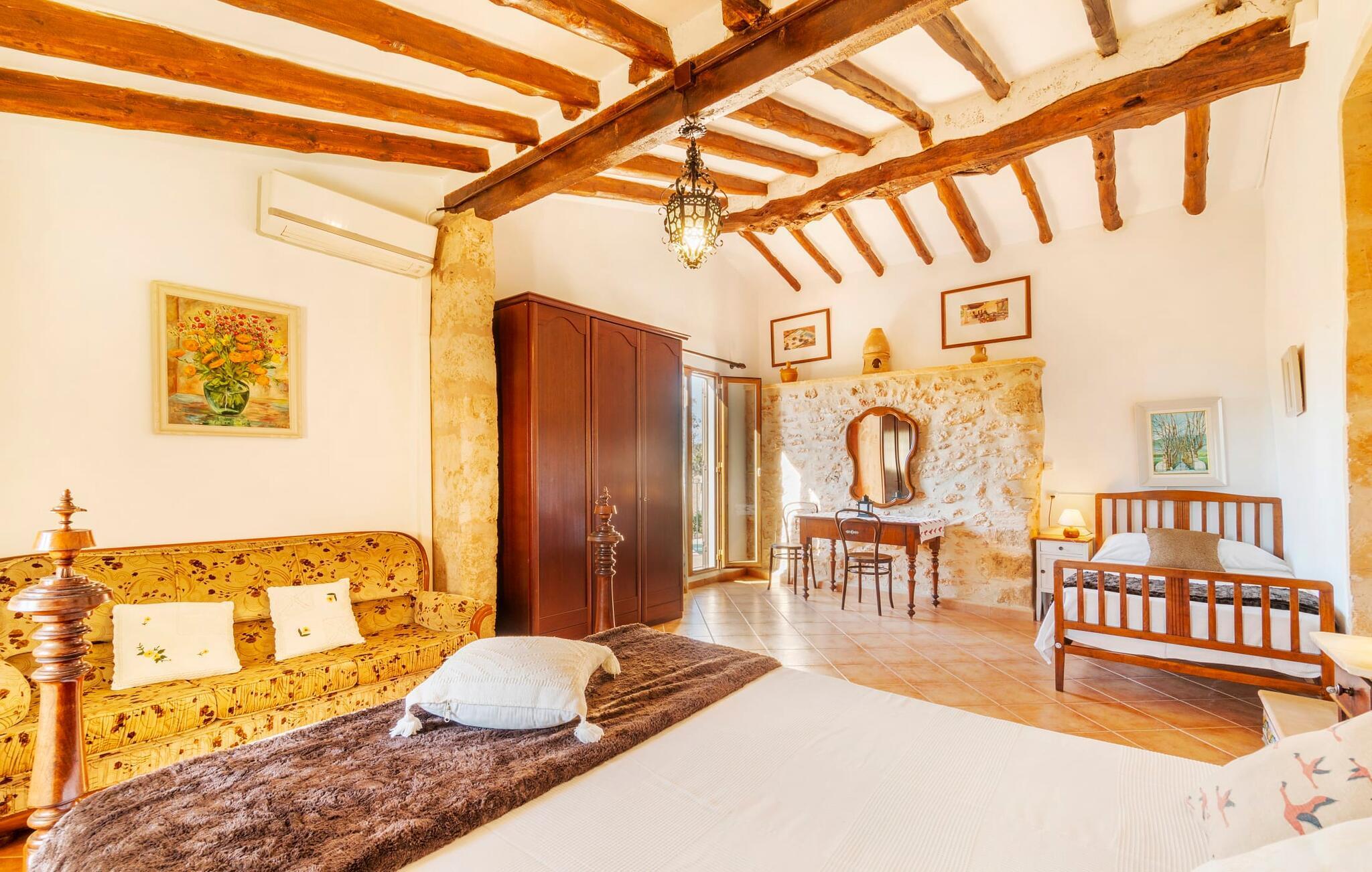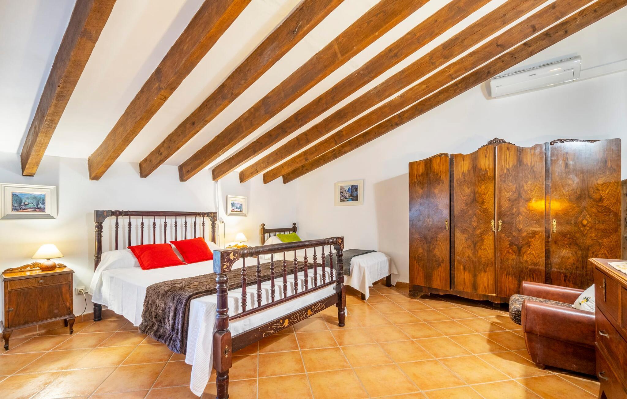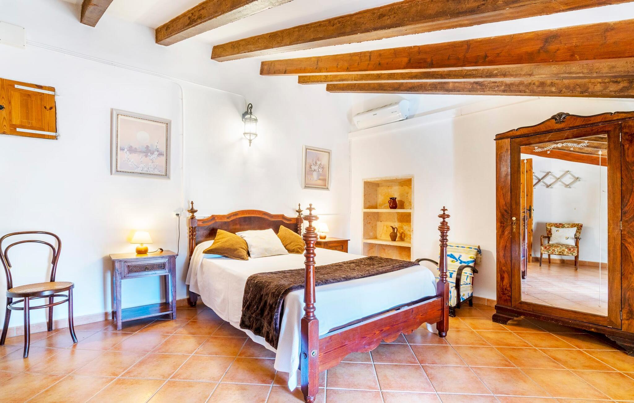 Das Haus selbst ist wie folgt aufgeteilt: Im Erdgeschoss gibt es einen atemberaubenden Eingangsbereich, eine geräumige Küche mit Esstisch, ein Fernsehzimmer und ein Badezimmer. Es gibt auch eine Treppe, die in den Keller führt. Im Obergeschoss befinden sich die vier Schlafzimmer und zwei Badezimmer. Eines davon ist von außen zugänglich, sodass Sie vom Schlafzimmer aus über den Balkon ins Badezimmer gelangen. Das Innere der Villa „Son Gabriela“ wurde im typisch mallorquinischen Stil gestaltet, was dem Anwesen eine besonders urige Atmosphäre verleiht. Im gesamten Anwesen werden Sie auf eine Fülle wunderschöner, echter antiker Möbel stoßen, die perfekt mit den farbenfrohen Wänden, den freiliegenden Balken und den Terrakottafliesen harmonieren. Hier und da sind dekorative Natursteinelemente zu sehen. Eine Vielzahl unterschiedlicher Wohnbereiche machen es Ihnen allen leicht, sich nach Herzenslust auszubreiten und mindestens einen der vielen einladenden Plätze zu finden, die zum ausgiebigen Entspannen einladen. Die gemütliche Küche ist bestens für den täglichen Bedarf ausgestattet und bietet vom Wasserkocher bis zur Filterkaffeemaschine alles. Für kühle Abende gibt es sogar einen Kamin, an dem Sie gemeinsam am Esstisch sitzen und eine Mahlzeit genießen können. In spektakulär schönen Schlafzimmern findet jeder einen Platz zum Ausruhen, der genau seinen Wünschen entspricht. Auch hier finden wir antikes Flair und ein absolut charmantes Arrangement. Die Badezimmer sind in einem modernen und sehr geschmackvollen Stil eingerichtet. Das Mitbringen eines eigenen Bügeleisens und Haartrockners ist nicht erforderlich, da diese bereits vor Ort vorhanden sind und während Ihres Urlaubs kostenfrei genutzt werden können. Im Keller können Sie Ihre Lebensmittel bequem gekühlt aufbewahren.