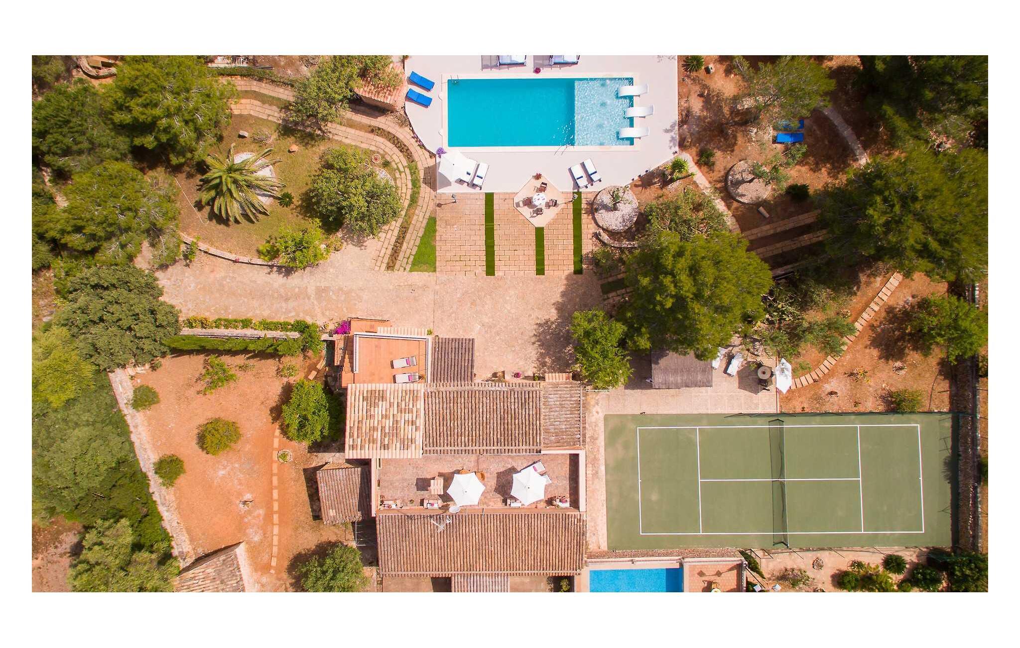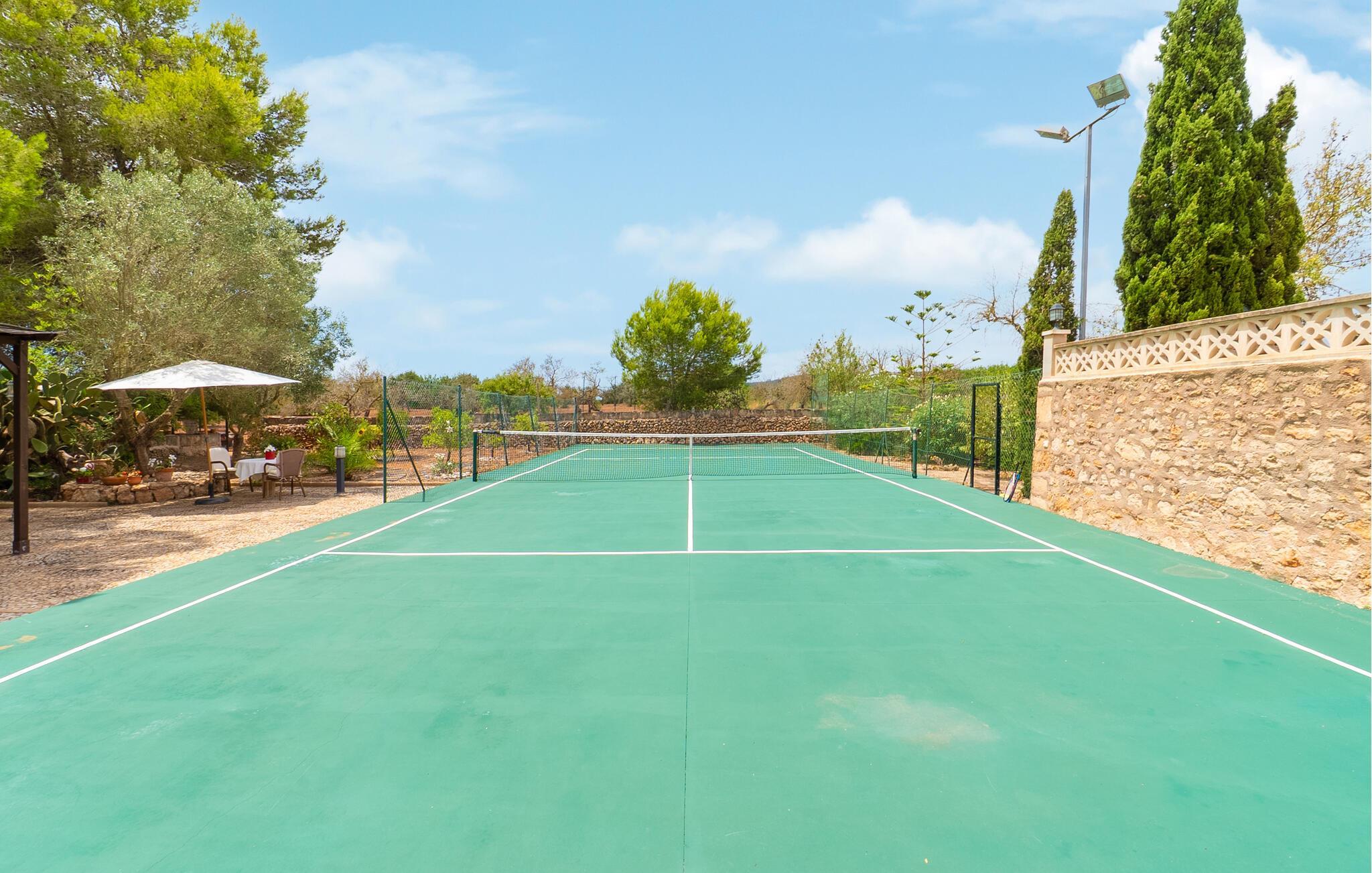Die Villa verfügt über einen Swimmingpool mit flachem Bereich, der sich ideal für kleine Kinder eignet, einen großen Spielbereich und einen Tennisplatz, die reichlich Freizeitmöglichkeiten bieten. Die weitläufige Terrassenlandschaft umfasst private Sitzbereiche unter alten Oliven-, Pinien- und Johannisbrotbäumen, die natürlichen Schatten spenden. Hochwertige Gartenmöbel und ein charmanter Pavillon bereichern das Outdoor-Erlebnis, perfekt für abendliche Grillabende. Parkplätze stehen im Schatten auf dem Grundstück der Villa zur Verfügung. (Die Garage ist nicht im Mietpreis inbegriffen).