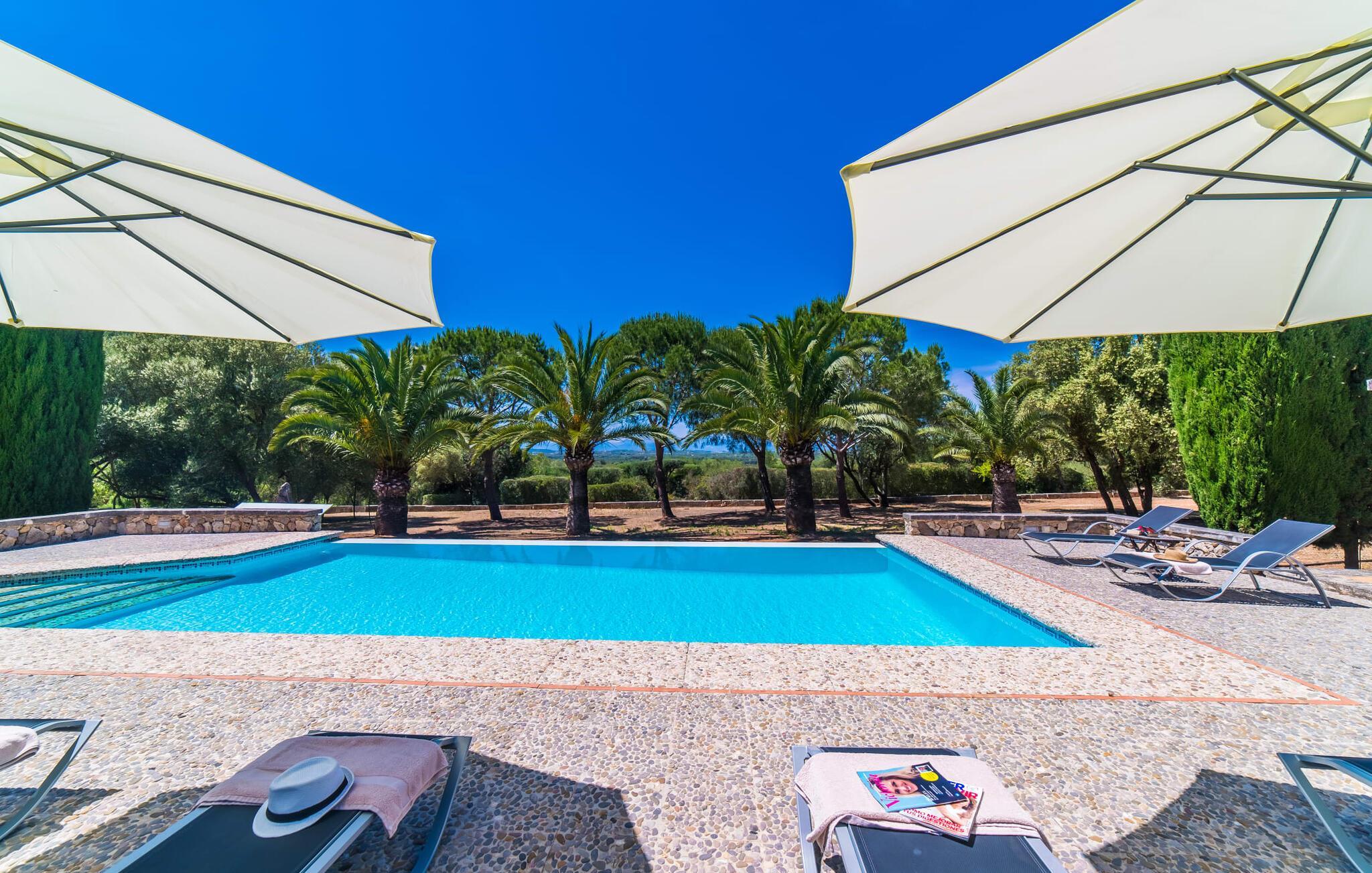 Die Natursteinvilla „Son Guillotet“ wurde auf einem sehr schönen 120.000 Quadratmeter großen Grundstück errichtet. Es zeichnet sich durch seine Alleinlage inmitten einer unberührten Naturlandschaft mit einer üppigen Vegetation direkt neben dem Haus aus. Ein Teil davon beherbergt einen Garten und bietet zahlreiche Liegeflächen sowie schattenspendende Bäume. Hier wachsen überwiegend mediterrane Pflanzen, wie zum Beispiel Olivenbäume oder ein paar eindrucksvolle Palmen. Die ruhige Atmosphäre rund um das Haus ist geprägt von Naturgeräuschen und bietet den idealen Rahmen für private Entspannung und Erholung. Ein großer, 66 Quadratmeter großer Infinity-Pool ist inmitten der großen Gartenlandschaft integriert und sorgt dafür, dass Sie an heißen Tagen herrlich frisch bleiben. Es verfügt über einen bequemen Zugang und ist von einer umlaufenden Terrasse mit zahlreichen bequemen Liegen umgeben.