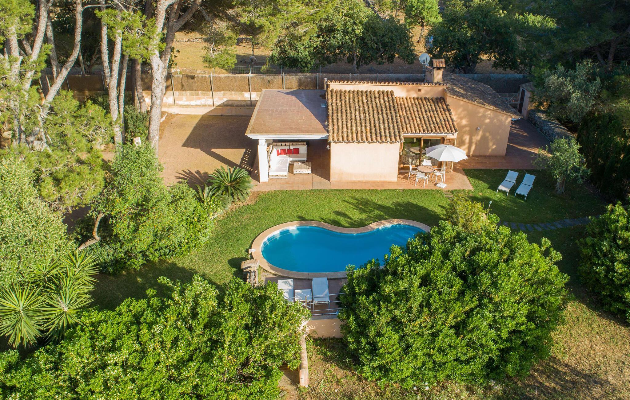 Diese rollstuhlgerechte Villa im Bungalow-Stil für 4 Personen liegt im Schatten hoher Kiefern, die dem Anwesen eine besondere Note verleihen und den Weg der Sonne nicht blockieren. Früher als Gästehaus des Haupthauses „Son Jaumell Gran“ genutzt, bleibt es seiner Aufgabe grundsätzlich treu und beherbergt nun Selbstversorger-Urlauber mit separatem Zugang und Privatsphäre. Eine überdachte Terrasse mit Ausblick – manchmal blitzt sogar das Meer hindurch –, der Pool, ein gepflegter Rasen, Landschaftspflanzen und kleine Palmen rahmen das schon etwas ältere Haus, das keine Anzeichen von Ermüdung erkennen lässt, dekorativ ein. Hinzu kommt die Top-Lage, um die Sie viele beneiden werden: Nur 5 Autominuten nach Cala Ratjada, um hervorragenden Fisch zu genießen, und nur 15 Gehminuten nach Capdepera und zum Naturstrand Cala Agulla. Man kann fast sagen, dass man die Villa „Son Jaumell“ gleich mit dem Meer und der Badebucht bucht. Hier herrscht ein leichtes Bauernhof-Feeling: Einmal im Jahr grasen Kühe auf einem abgelegenen Teil des Anwesens. Darüber hinaus haben einige der hier Beschäftigten, etwa der Bademeister und der Gärtner, Hunde, die sie gelegentlich mitbringen.