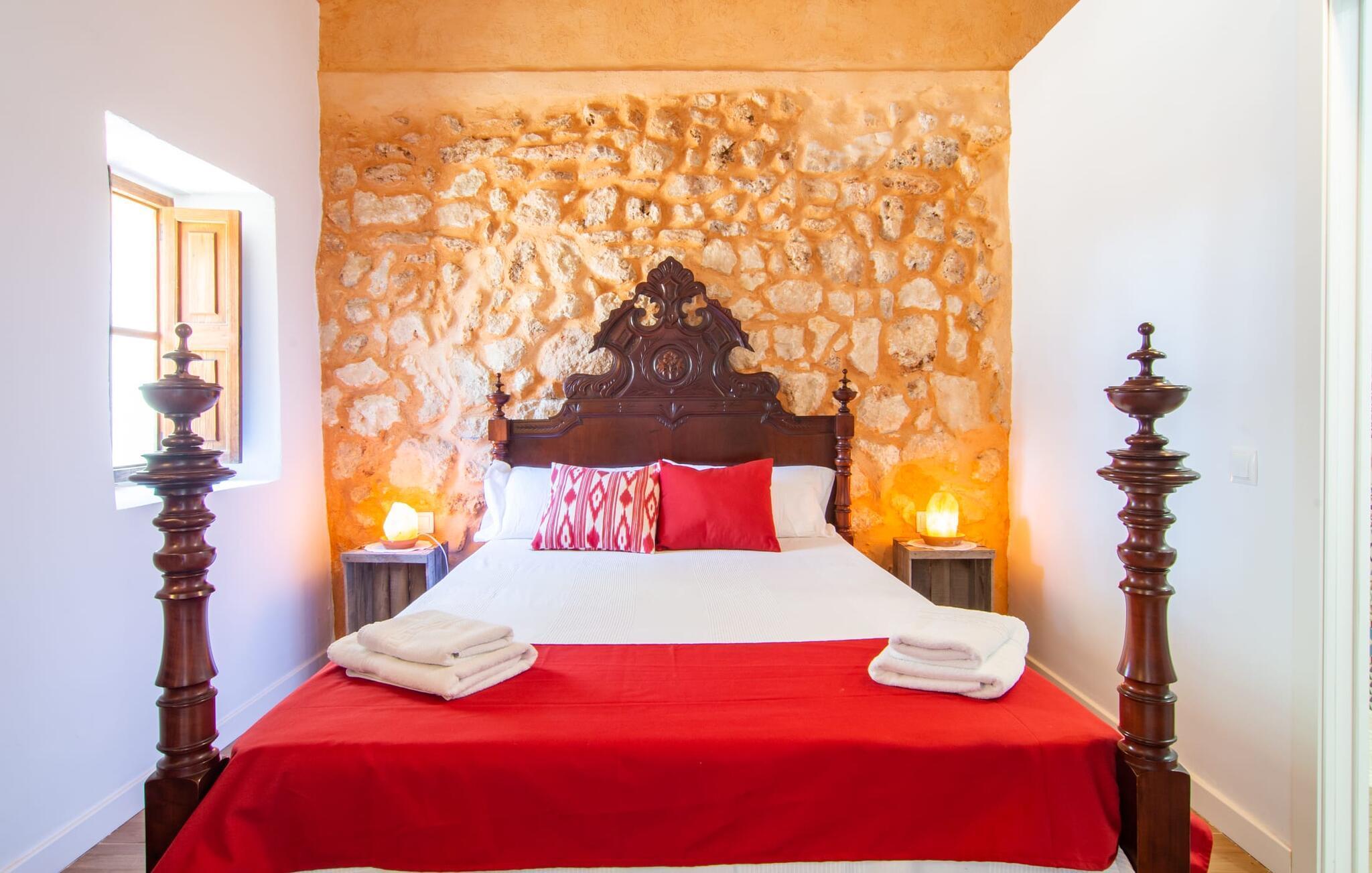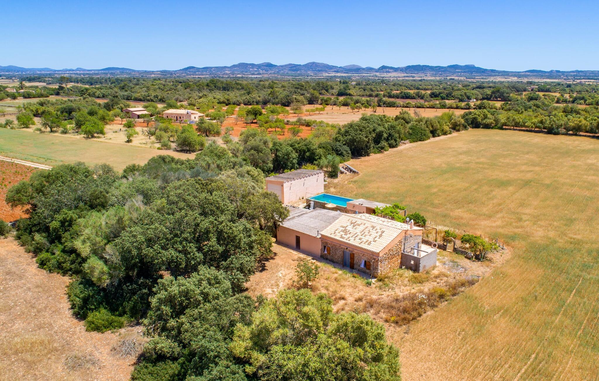 Wenn Sie sich für die Villa „Son Julià“ entscheiden, werden Sie belohnt – mit einer herrlichen Lage, die herrlich erholsame Tage bietet: Umgeben von Feldern und kleinen Wäldern gleicht der Außenbereich einer Oase. Und ein Pool zum Abkühlen gehört natürlich auch dazu. Mit einer Größe von 8 x 4 m bietet der Pool viel Platz zum Planschen und Schwimmen nach Herzenslust. Der Blick reicht von hier aus so weit, dass man in der Ferne sogar die Ausläufer des Tramuntana-Gebirges erkennen kann. In der überdachten Außenküche steht Ihnen ein schattiger Essbereich zur Verfügung, wo Sie die frischen Köstlichkeiten vom Grill genießen können. Die Villa verfügt außerdem über eine gemütliche Terrasse, deren Dach teilweise mit wilden, schattenspendenden Weinreben bedeckt ist. Direkt vor dem Pool haben Sie außerdem die Möglichkeit, auf bequemen Sonnenliegen unter einem Strohschirm zu entspannen. Wenn Sie auf der Suche nach einem Ort für ein Picknick im Freien sind, finden Sie einen tollen Platz unter den Baumwipfeln, wenn Sie ein Stück weiter vom Haus entfernt sind. Die authentische Bruchsteinfassade des Hauses verbreitet eine ganz besondere, für geschichtsträchtige Orte typische Atmosphäre.