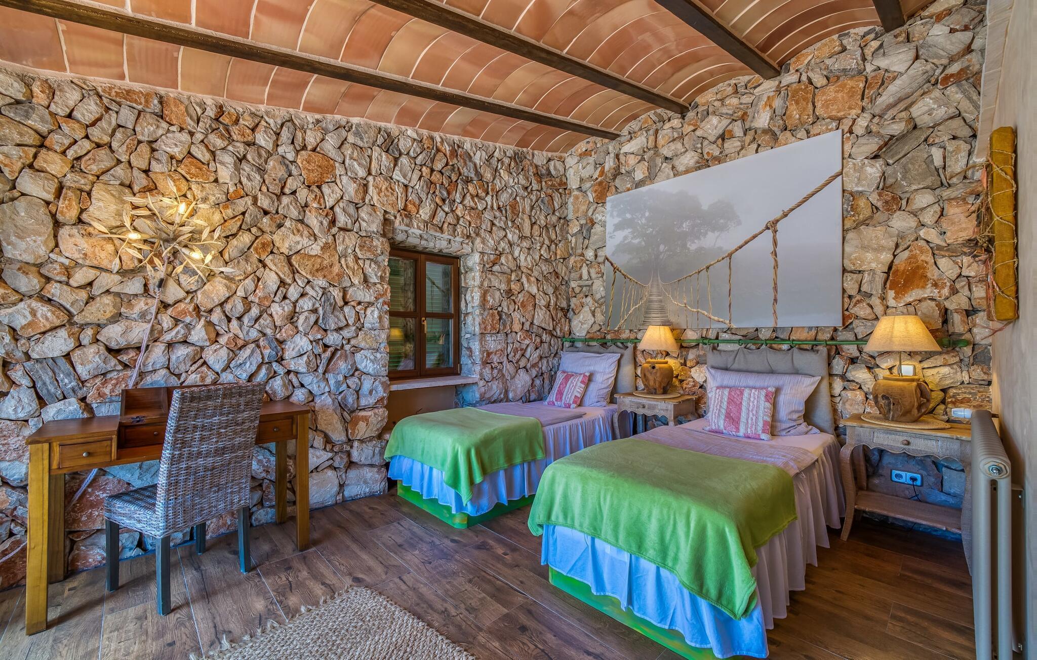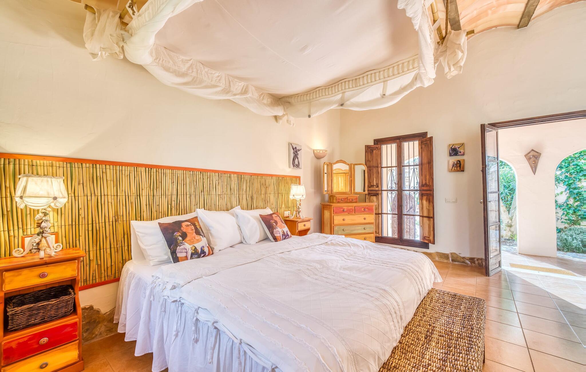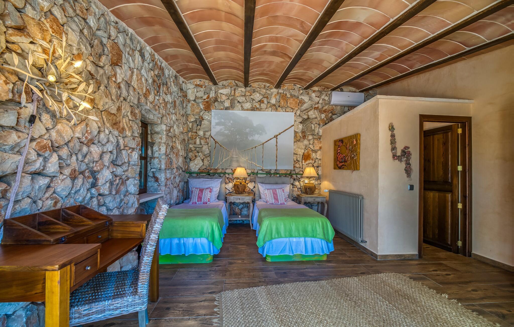 Die Villa strahlt im Inneren eine fast verzauberte Atmosphäre aus. Alles ist wunderbar hell und gemütlich eingerichtet – und zudem sehr geschmackvoll und individuell. Viele Fenster lassen viel Licht herein und eröffnen fantastische Ausblicke sowohl in den Garten als auch in den romantischen Innenhof des Anwesens. Der Wohn- und Essbereich sowie die Küche sind in einem großen, langgestreckten Raum in offener Bauweise untergebracht. Im Wohnzimmer finden Sie mehrere gemütliche Sofas und Sessel – wo Sie entweder entspannen und fernsehen oder am knisternden Feuer Klavier spielen können. Ebenso wie die Küche mit breiter Theke und extra Tisch wirkt auch der Essbereich rustikal: Warmes Holz und bequeme Korbstühle laden zum gemütlichen Beisammensitzen ein. Wenn Sie die Augen nicht länger offen halten können, begeben Sie sich in eines der bezaubernden Doppelzimmer, die jeweils separat von außen zugänglich sind. Eines davon liegt direkt vor dem Pool. Jedes Zimmer verfügt außerdem über ein schickes eigenes Badezimmer.