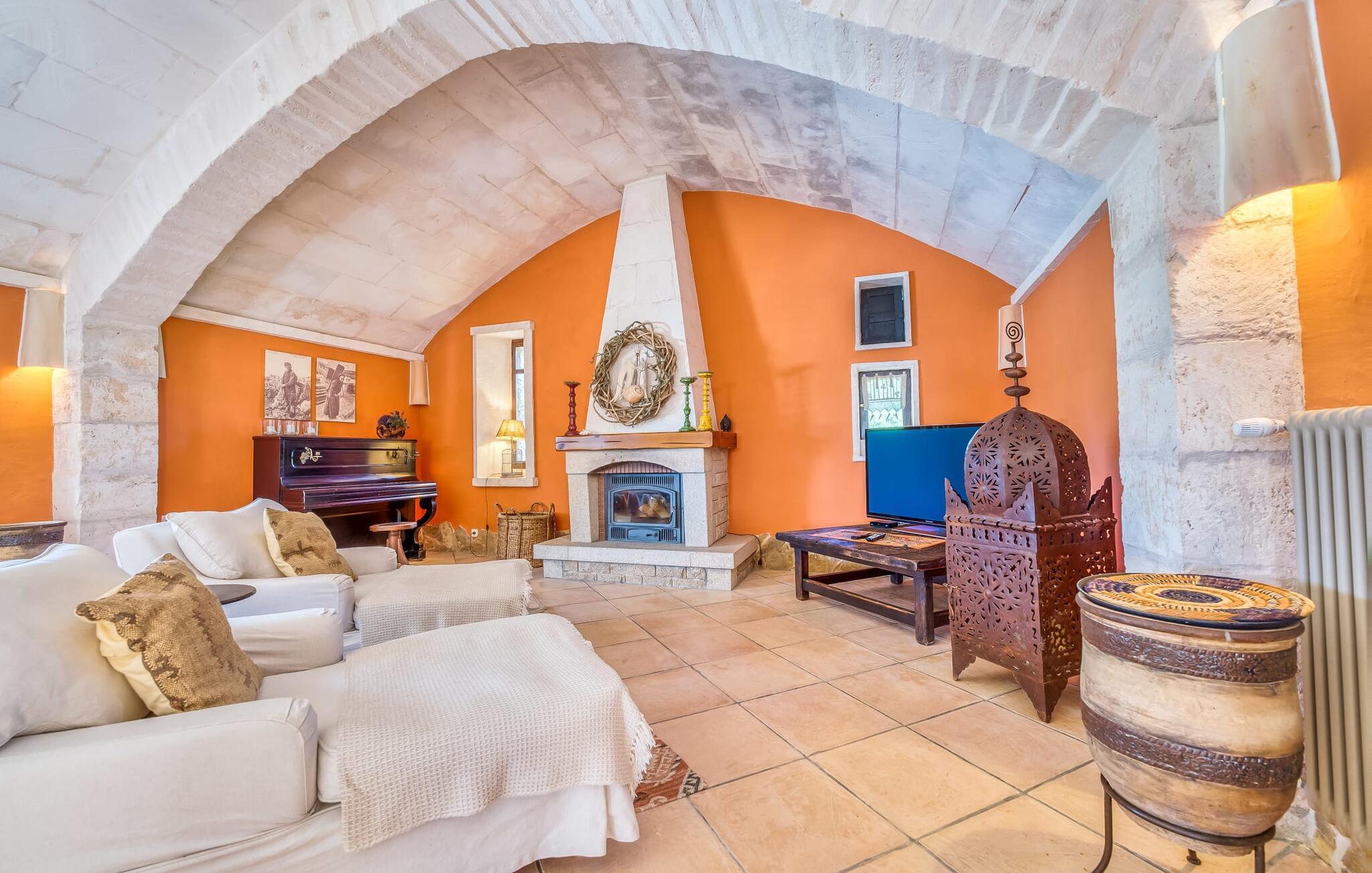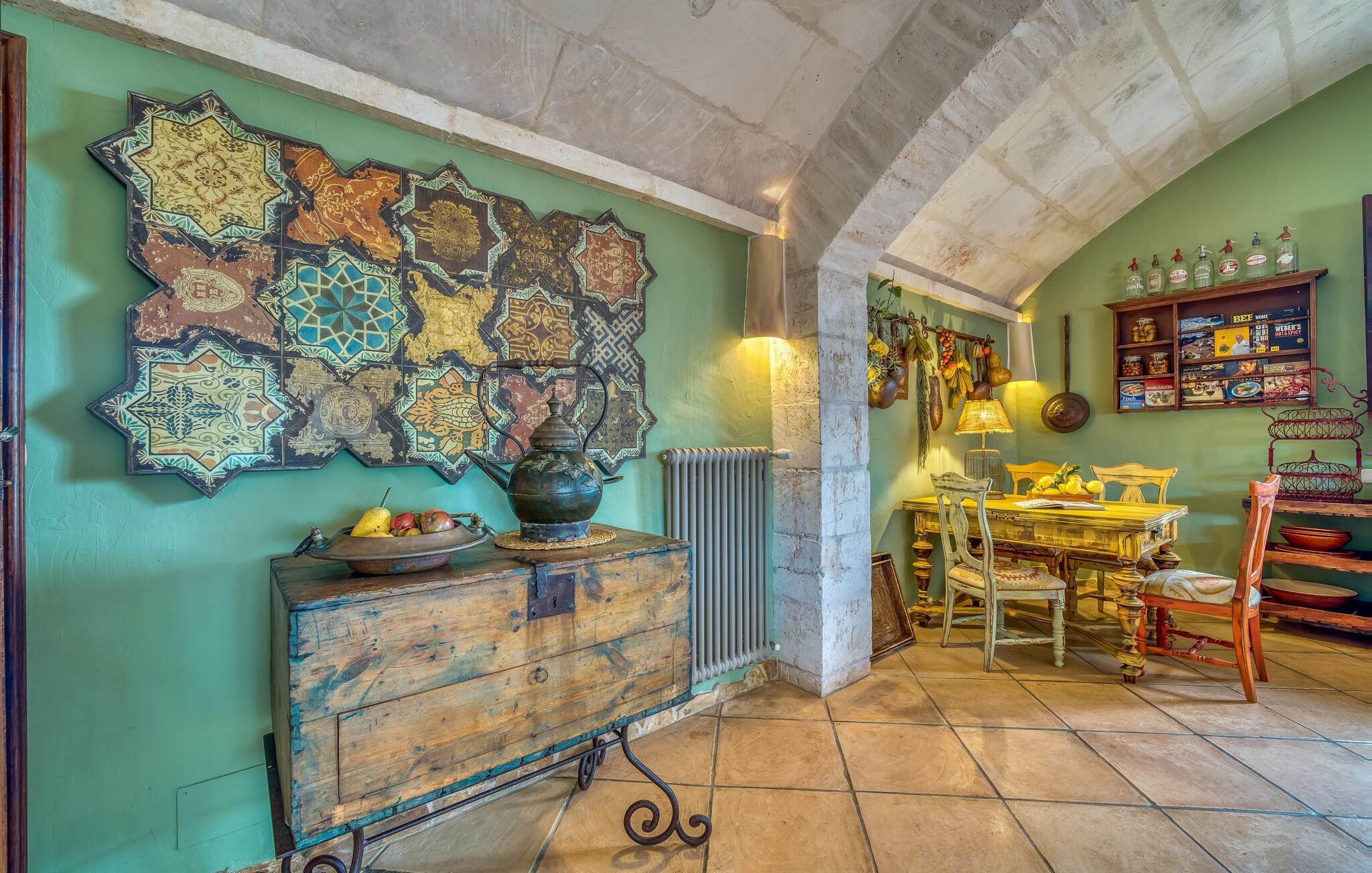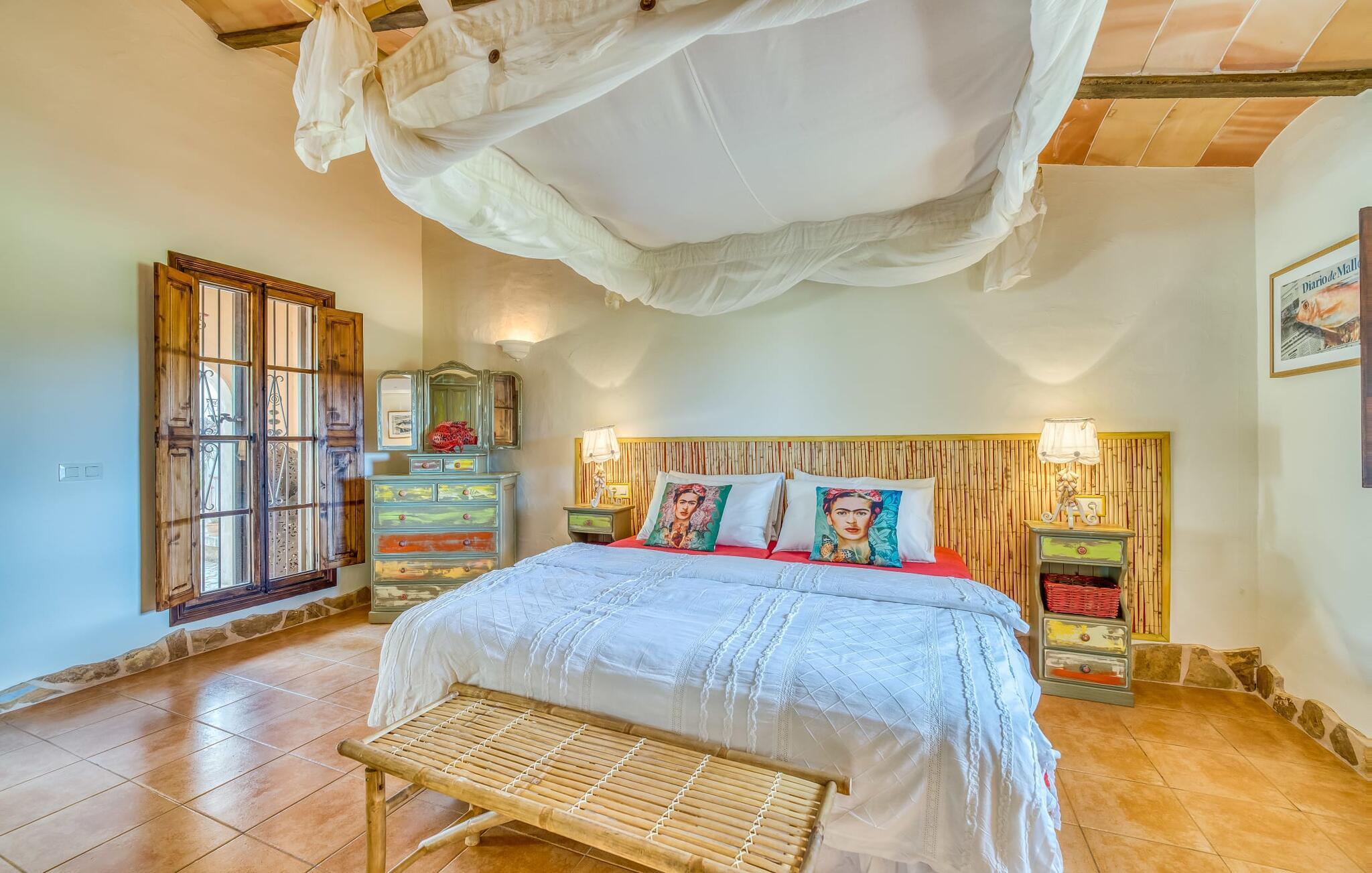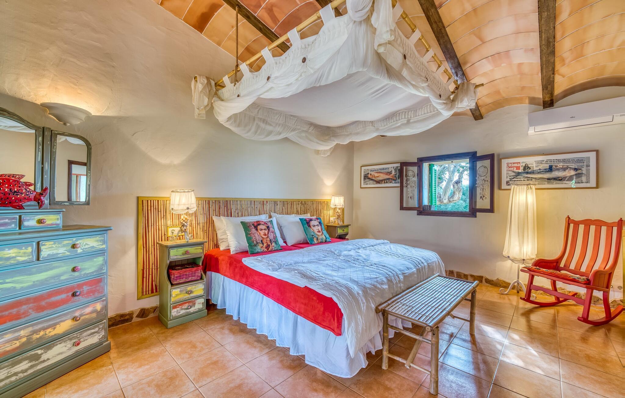 Die Villa strahlt im Inneren eine fast verzauberte Atmosphäre aus. Alles ist wunderbar hell und gemütlich eingerichtet – und zudem sehr geschmackvoll und individuell. Viele Fenster lassen viel Licht herein und eröffnen fantastische Ausblicke sowohl in den Garten als auch in den romantischen Innenhof des Anwesens. Der Wohn- und Essbereich sowie die Küche sind in einem großen, langgestreckten Raum in offener Bauweise untergebracht. Im Wohnzimmer finden Sie mehrere gemütliche Sofas und Sessel – wo Sie entweder entspannen und fernsehen oder am knisternden Feuer Klavier spielen können. Ebenso wie die Küche mit breiter Theke und extra Tisch wirkt auch der Essbereich rustikal: Warmes Holz und bequeme Korbstühle laden zum gemütlichen Beisammensitzen ein. Wenn Sie die Augen nicht länger offen halten können, begeben Sie sich in eines der bezaubernden Doppelzimmer, die jeweils separat von außen zugänglich sind. Eines davon liegt direkt vor dem Pool. Jedes Zimmer verfügt außerdem über ein schickes eigenes Badezimmer.