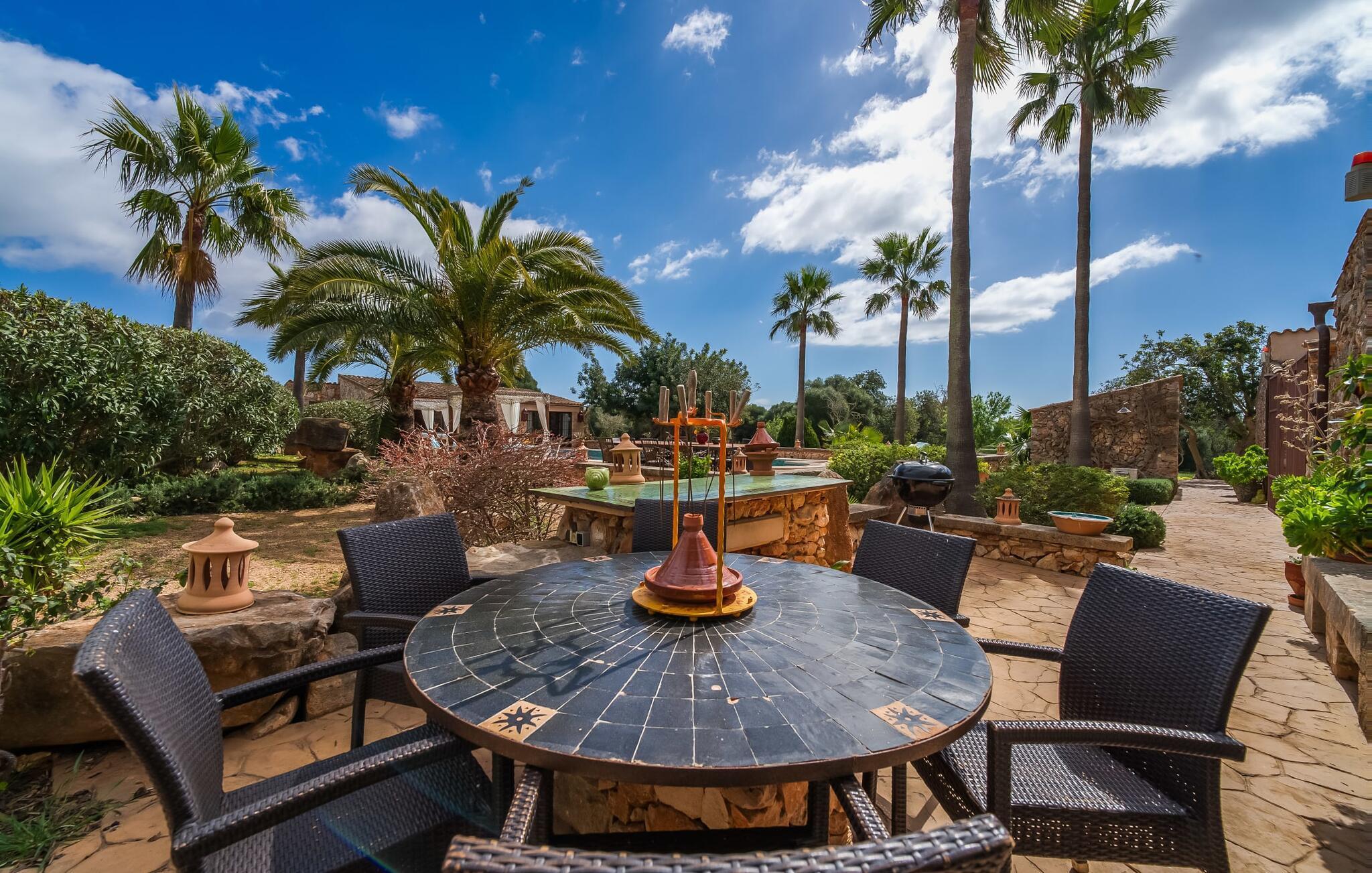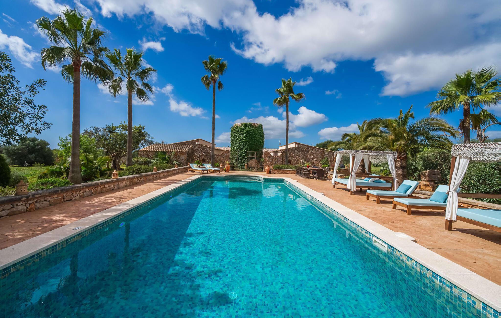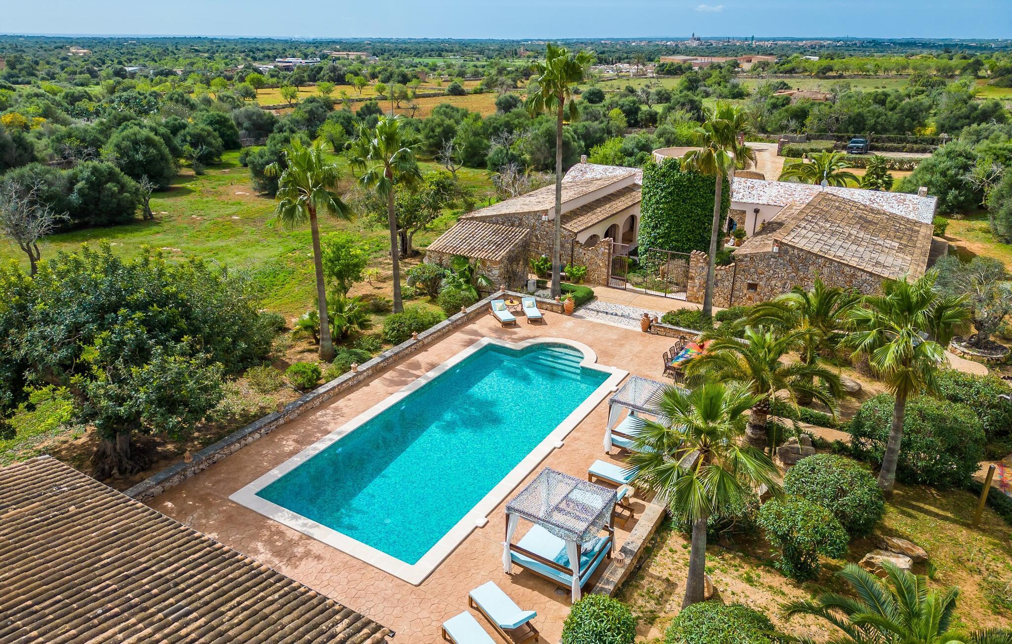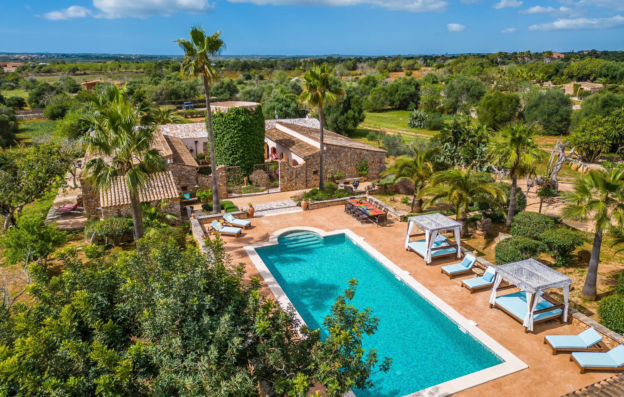 Wenn die wundervolle Villa „Son Sans“ ein Abbild des Landlebens im Süden Mallorcas ist, dann werden wohl selbst überzeugte Städter nicht mehr weg wollen. Das ebenerdige Natursteinhaus ist einfach zu schön: Es liegt auf einem riesigen Grundstück, bedeckt mit in den blauen Himmel ragenden Palmen, vielen typisch mediterranen Pflanzen und liebevoll gepflegten Kakteen, die auch rund um die großzügige Terrasse zu finden sind Bereiche – darunter eine kleine Dachterrasse auf einem kleinen Turm. Überall gibt es charmante Rückzugsorte, hier eine hübsche Sitzecke, dort einen kleinen Spazierweg – alles ist mit viel Liebe zum Detail arrangiert, von den Mosaiksteinen rund um das Blumenbeet bis zur einladenden Hängematte im Rundbogen. Ein weiteres Highlight ist zweifellos der große Pool, um den herum bequeme Sonnenliegen und schattenspendende Sonnenschirme wie ein langer Esstisch für gemütliche Abende unter freiem Himmel angeordnet sind.