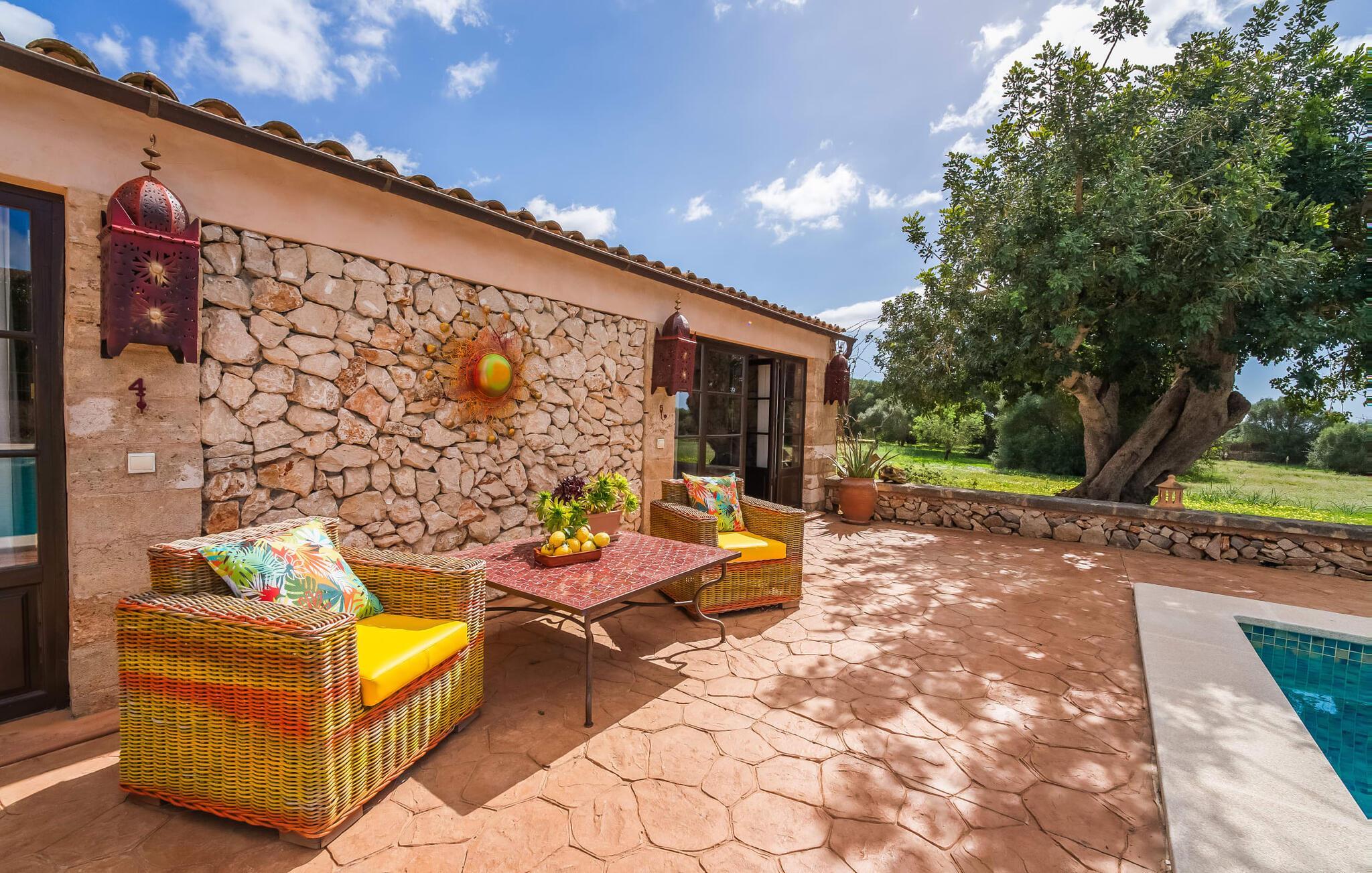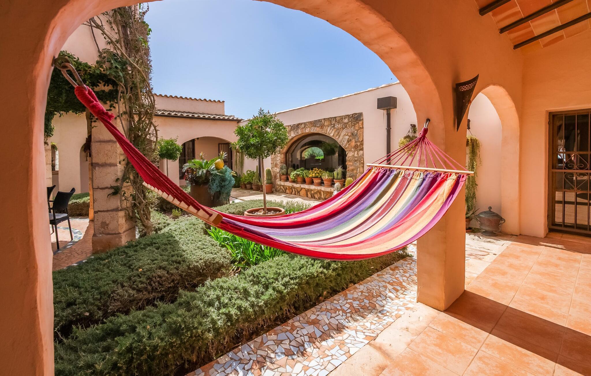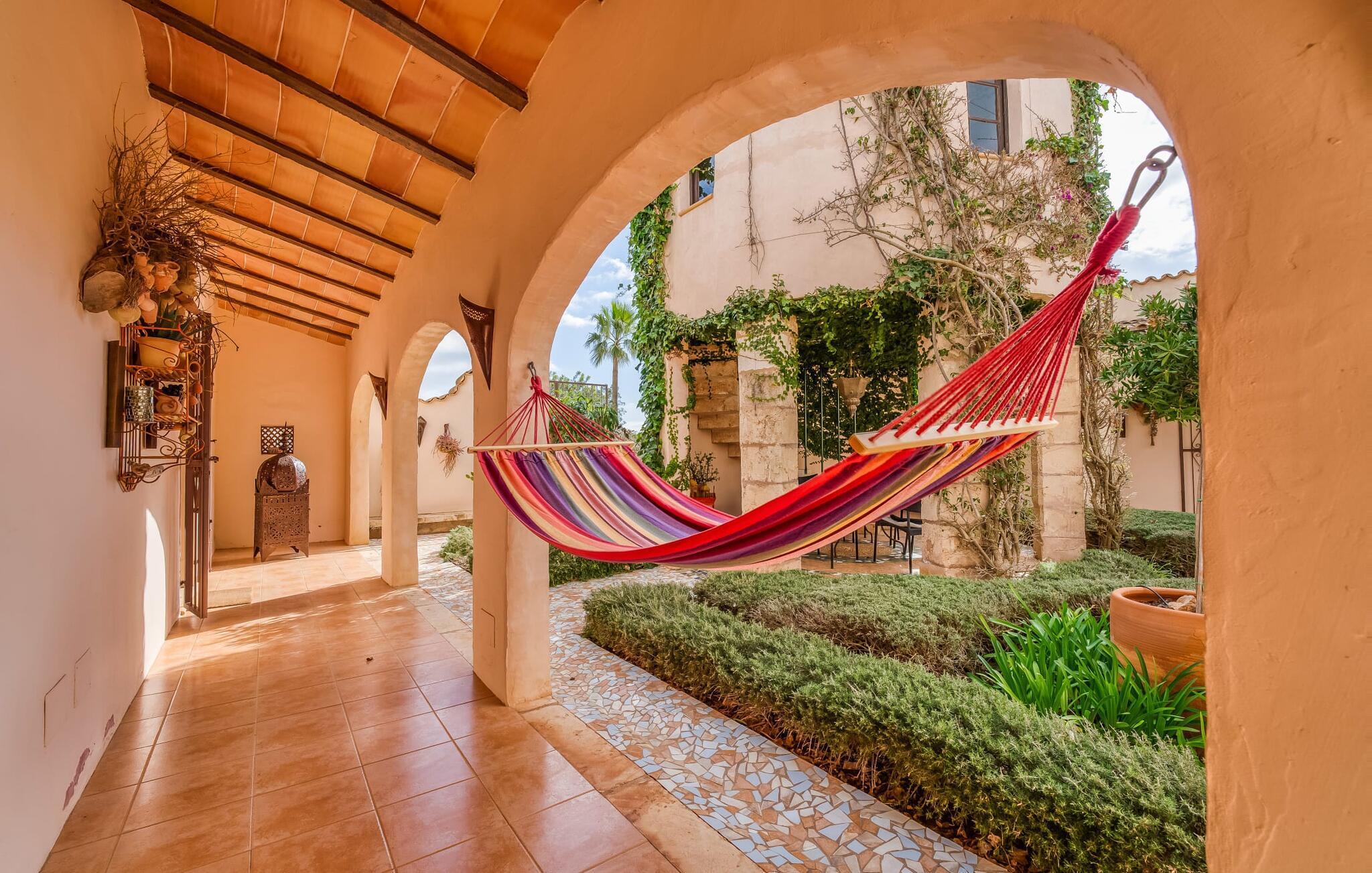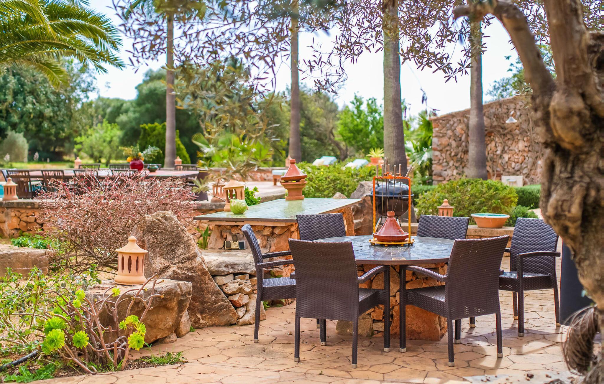 Wenn die wundervolle Villa „Son Sans“ ein Abbild des Landlebens im Süden Mallorcas ist, dann werden wohl selbst überzeugte Städter nicht mehr weg wollen. Das ebenerdige Natursteinhaus ist einfach zu schön: Es liegt auf einem riesigen Grundstück, bedeckt mit in den blauen Himmel ragenden Palmen, vielen typisch mediterranen Pflanzen und liebevoll gepflegten Kakteen, die auch rund um die großzügige Terrasse zu finden sind Bereiche – darunter eine kleine Dachterrasse auf einem kleinen Turm. Überall gibt es charmante Rückzugsorte, hier eine hübsche Sitzecke, dort einen kleinen Spazierweg – alles ist mit viel Liebe zum Detail arrangiert, von den Mosaiksteinen rund um das Blumenbeet bis zur einladenden Hängematte im Rundbogen. Ein weiteres Highlight ist zweifellos der große Pool, um den herum bequeme Sonnenliegen und schattenspendende Sonnenschirme wie ein langer Esstisch für gemütliche Abende unter freiem Himmel angeordnet sind.