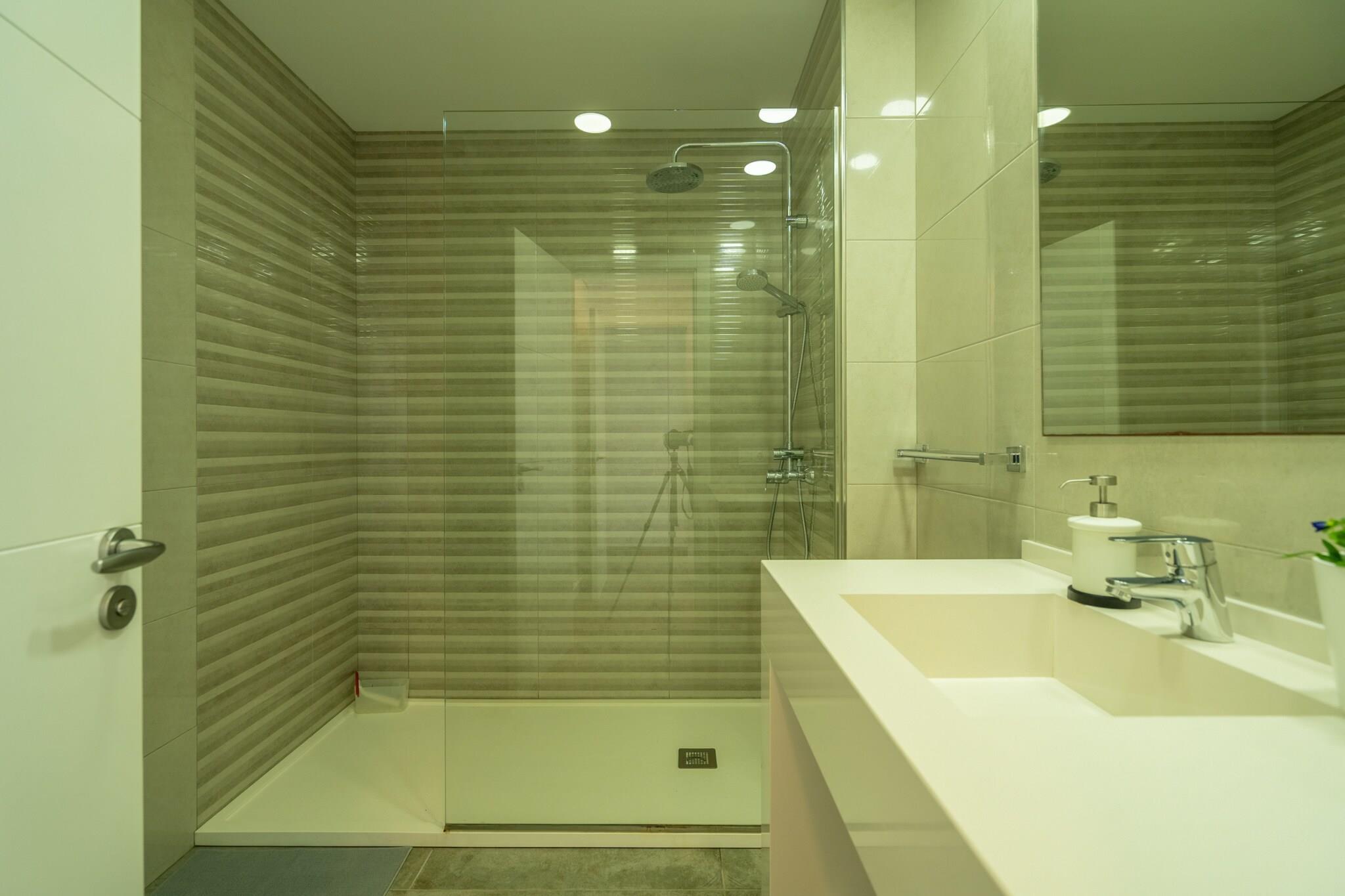 Ground floor: (Living room(double sofa bed, TV(satellite), dining table, seating area, DVD player, radio), open kitchen(electric kettle, toaster, coffee machine, oven, microwave, dishwasher, fridge-freezer, Juicer, dishes and cutlery), Internet access) On the 1st floor: (Bedroom with bathroom(double king size bed, shower), Bedroom with bathroom(single bed, single bed, shower), Bedroom with bathroom(single bed, single bed, shower), Bedroom with bathroom(double king size bed, shower), Bedroom with bathroom(double king size bed, shower), Bedroom with bathroom(single bed, single bed, shower), toilet(toilet)) fitness room, Garden Furniture , TV, TV, TV, TV, TV, TV, TV, TV, TV, tumble dryer, hot tub, shower(outside), solarium, washing machine, balcony, air conditioning, terrace, sun loungers, BBQ, parking, swimming pool(private), table tennis table, darts, iron, air to air heatpump, hairdryer, Alarm