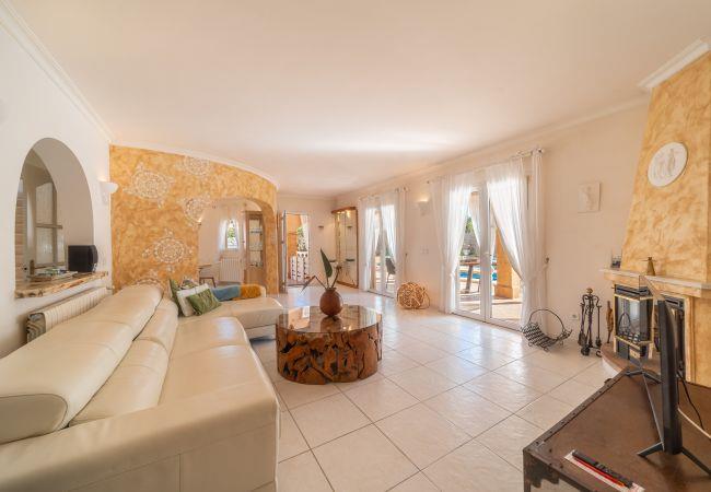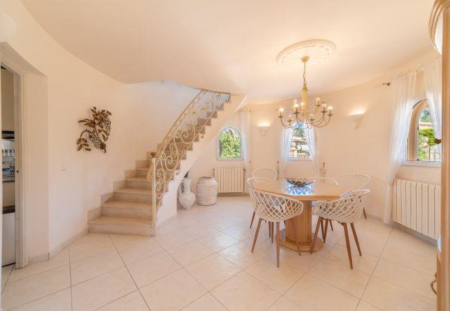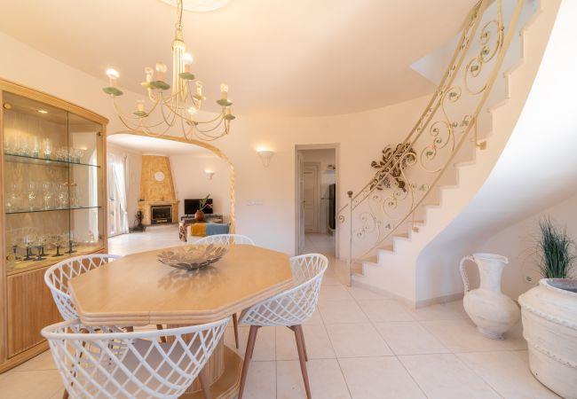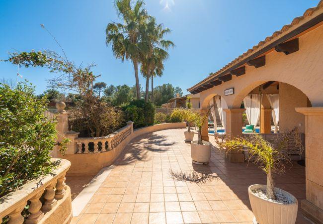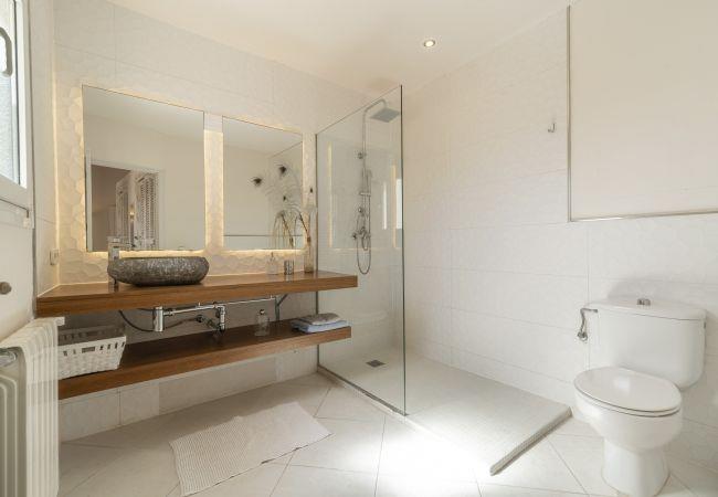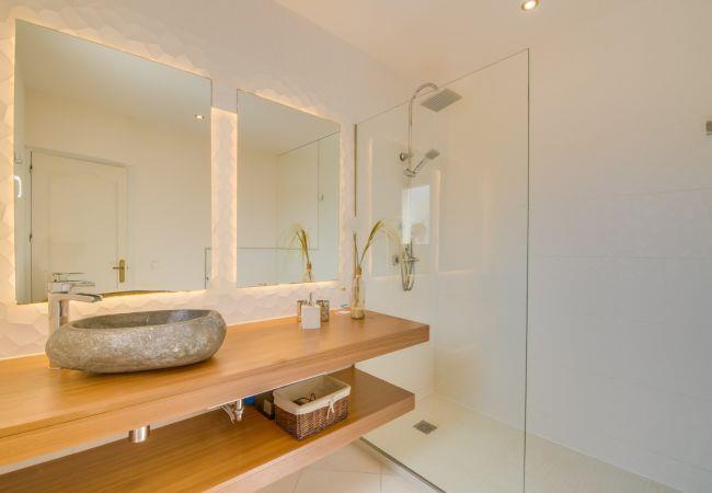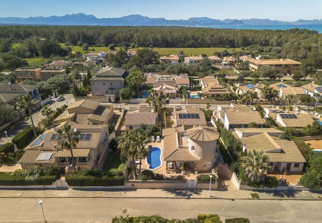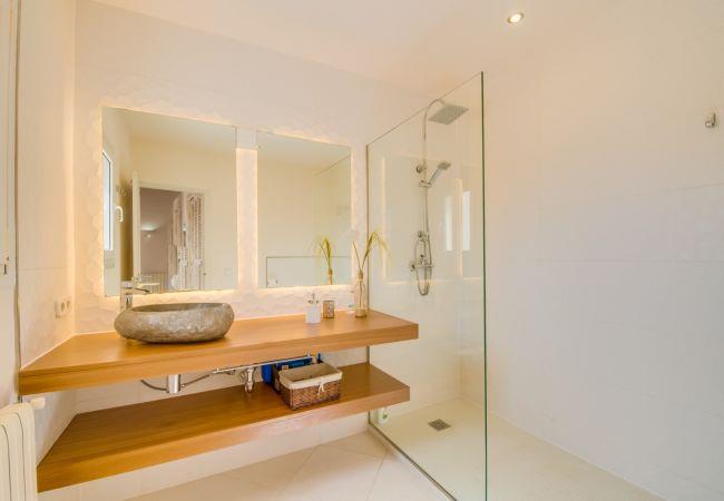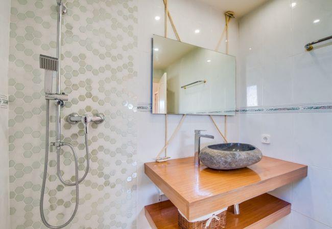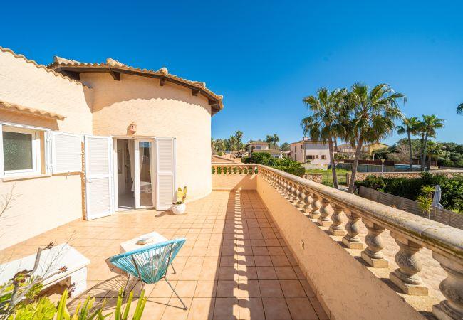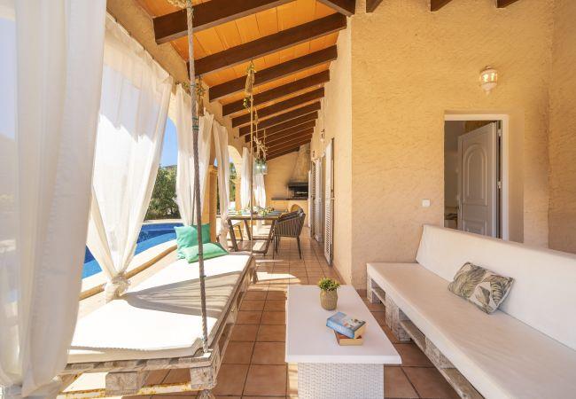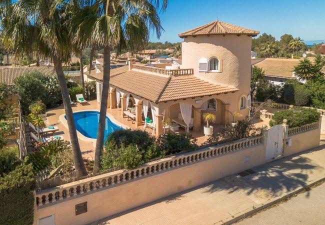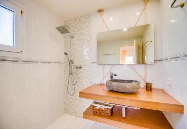 Son Serra, Pool and Chill Out (Casa Bel) is a wonderful Villa next to the beach of Son Serra de Marina, 3 large bright rooms with ensuite bathroom, bright and sunny house with swimming pool, BBQ area and exquisite Chill out.Son Serra, Pool and Chill Out (Casa Bel) is the place to enjoy a holiday with family, friends. It is perfect for travelers who want to enjoy the rest by the sea, who want to have the feeling of being on vacation.This house surprises us from the start. A stone tower rounded receives us, surrounded by garden and a wonderful pool with a circular that will captivate especially the little ones.Around the pool, the garden is taking different forms: in some places has an oriental look with exotic plants and zen aesthetics; Garden elsewhere remind us to where we are, the Mediterranean, with native plants.Facing the pool we found a wonderful porch chill out where the afternoons and evenings will be wonderful. Among fabrics that flutter in the breeze, there is a sofa area outside, a seesaw and a wide surrounded table chairs design "Phantom", where the most aesthetes will enjoy wonderful evenings under the moonlight, palm trees and the rustling of the breeze.The entrance to the house is very nice and welcoming from the first moment. A light and airy lounge welcomes us. There we found a sofa area, fireplace and all appliances to make our stay as pleasant, especially to discover that the whole room is looking at the pool, sun terrace and south. Along the hall we are open an adjacent room under an arch where we have a nice room, spacious, comfortable and bright. And from there to the kitchen, open to the dining and living room open to the bar. A fully equipped and very practical kitchen.From the living room we can access two ground floor rooms. The first we find is the double room "Gold", a space created charming with golden tones and organic elements. It has a double bed 150 x 190 cm. and a nice bathroom.A few meters further on we find the “Turquesa” double room. This is the largest room in the house and possibly the brightest too. It has been designed in shades of white and turquoise. It has a large 150 x 200 cm double bed and a very large en suite bathroom fully equipped with shower, bathtub, hairdryer, ... The third room is the most surprising since it is located at the top of the tower, as if it were a story. Up there we find a surprising space, circular with a Balinese bed of 150 x 200 cm. that will make us dream. This room also has its own bathroom en suite and a private terrace of 25m2 with privileged views, as well as hammocks and outdoor table and chairs. We are in a magical place that looks at the mountain and you can see at every breeze from the Son Serra de Marina beach, one of the most extraordinary in Mallorca and located just 400 meters from the house.Son Serra has air conditioning in one of the rooms, the living room does not have AA. Son Serra, Pool and Chill Out (Casa Bel) is the ideal place for your vacation. Quiet, next to the sea, designed with great care and style, it is the perfect space to rest, enjoy and feel the energy of the Mediterranean.