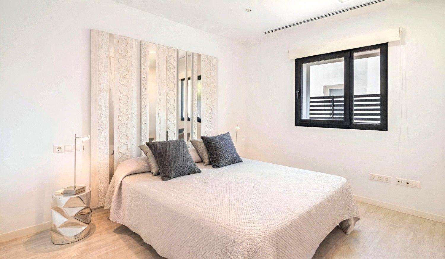 With 300 m² of living space spread over three floors, the house offers three elegant bedrooms, all with double beds and air conditioning, and a total of four bathrooms. Two of the rooms and two of the bathrooms are upstairs. One of the bedrooms upstairs is the suite with its own open bathroom and a huge light-filled glass front from which you have a breathtaking view of the sea.