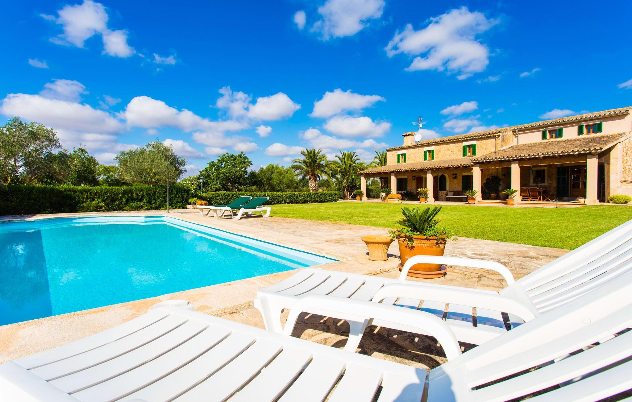 Träumen Sie schon immer von einem erholsamen Urlaub in ruhiger Umgebung, von ländlicher Idylle und guter Erreichbarkeit der typischen Inselstrände? Dann ist die Villa „Son Viquet“ genau das Richtige für Sie! Es erwartet Sie ein äußerst gemütliches, mit viel Liebe eingerichtetes Ambiente und eine angenehme Anbindung an verkehrsgünstig angebundene Bereiche. Das Privatgrundstück liegt in einer dünn besiedelten Villenregion und ist über eine gepflasterte Straße gut zu erreichen. Ein großer und gepflegter Garten bietet einen tollen Empfang und lädt Sie ein, die Umgebung zu erkunden. Viele Palmen und andere mediterrane Pflanzen schmücken die Räumlichkeiten und verbreiten ein bezauberndes Flair, in dem Sie sich gerne aufhalten. Eine Hängematte trägt zur einladenden Atmosphäre bei. Es gibt sogar ein Fußballtor für kleine und große Kicker. Für die nötige Erfrischung an warmen Sommertagen sorgt das 10-m-Becken, das bequem über eine halbrunde Treppe zu erreichen ist: Gehen Sie morgens schwimmen, ziehen Sie ein paar Bahnen und genießen Sie die Erfrischung, die sich im ganzen Körper ausbreitet! Vergessen Sie auf keinen Fall ein gutes Buch und genießen Sie stundenlang draußen oder unter der schönen Holzdecke ein Getränk in Reichweite! Eine große überdachte Terrasse befindet sich vor dem Haus und verfügt über einen Esstisch mit weiteren Sitzgelegenheiten: Dies ist der richtige Ort zum Frühstücken, wo Sie zusammensitzen und den Rest des Tages mit Blick auf den Garten und den blauen Himmel planen können. Aber auch abends lässt es sich hier schön sitzen und wenn man den Grill rechtzeitig anschmeißt, kann man zum Ausklang des Tages ein kulinarisches BBQ zelebrieren.