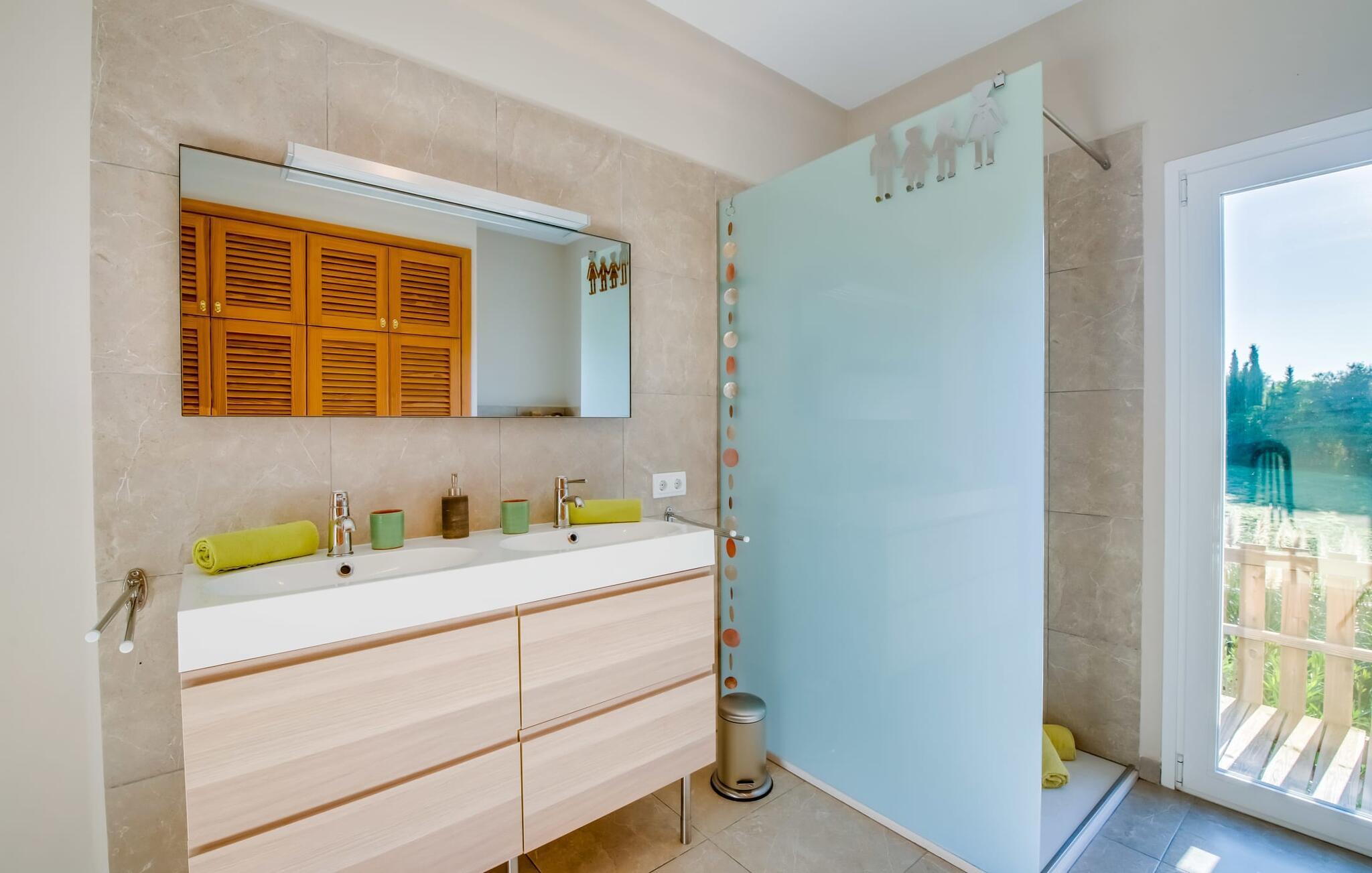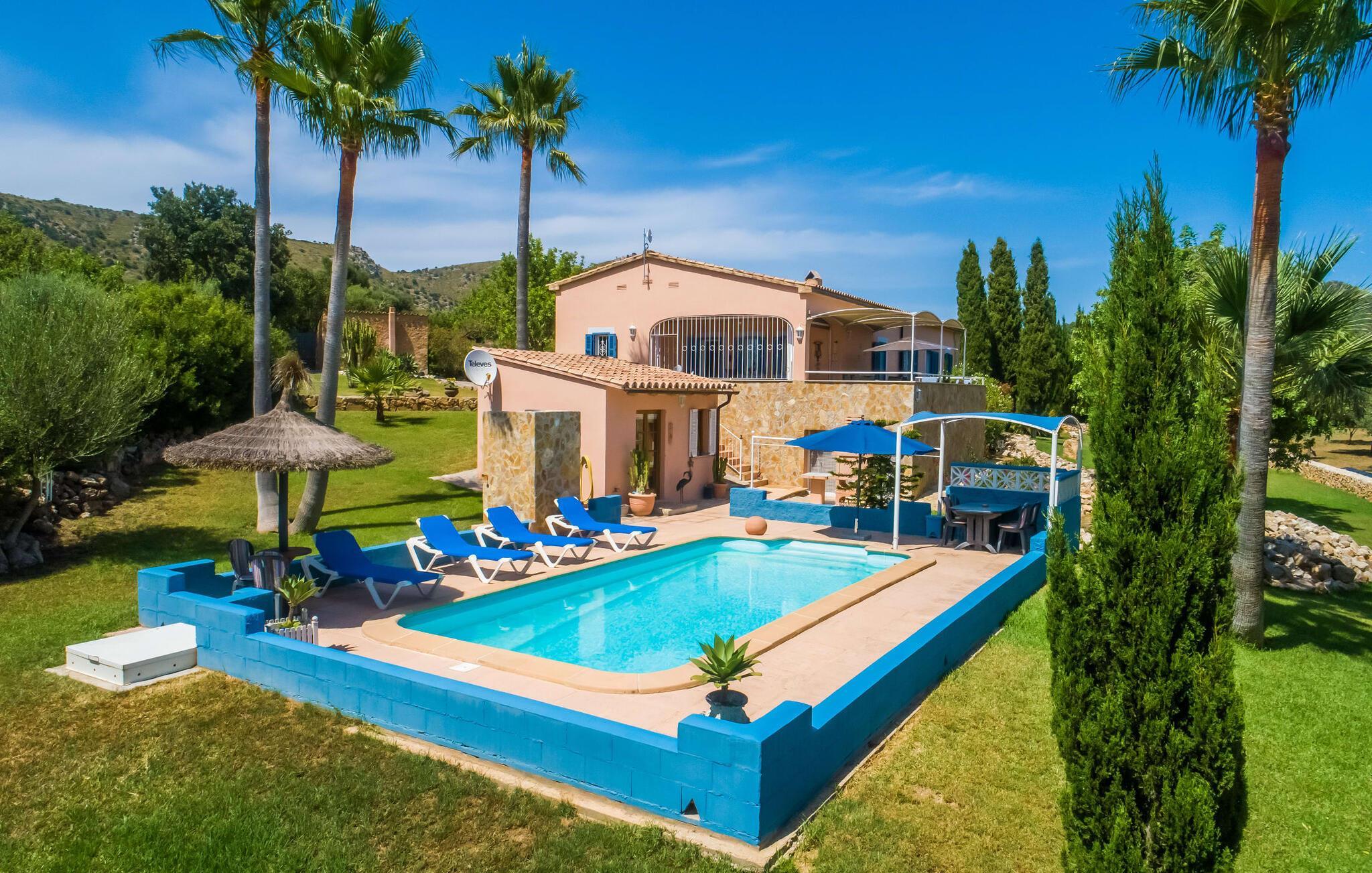 Im Inneren der Finca ist deutsche Gemütlichkeit ebenfalls nicht ganz zu verleugnen. Viel Licht scheint durch die Fenster und die hohen Bogentüren in den Wohnbereich. Auf der großen, bequemen Ledergarnitur kann man sich lang machen und beim Knistern des Kaminfeuers entspannen oder die Fernsehserie verfolgen, die man selbst im Urlaub nicht verpassen möchte. Die Bilder an den Wänden wie auch die Dekoration insgesamt zeugen vom persönlichen Geschmack der Besitzer; das Haus wurde aufwändig renoviert, ohne den privaten Touch zu verlieren. Für die gut ausgestattete offene Küche mit ihren funkelnden blauen Kacheln und Arbeitsplatten gibt es einen Stern extra: In solch inspirierender Umgebung kommt garantiert des Öfteren frischer Fisch auf den Tisch. Vom langen Flur gehen die Türen ab zu den Schlaf- und den Badezimmern: Hell, freundlich, funktional die einen, hochmodern und mit allem Komfort ausgestattet die anderen. Und innen allesamt: mit Infrarotheizungen ausgestattet, sodass es auch zur kühleren Jahreszeit wohlig-warm beim Duschen ist (ansonsten wird durch eine Luftwärmepumpe die Fußbodenheizung im Haus betrieben und sorgt neben Klimaanlage und Kamin für ganzjährig für perfekte Temperaturen). Das Bad en suite verfügt sogar über einen Zugang zur Terrasse: Werfen Sie nach dem Duschen den Bademantel über und atmen Sie tief die morgendliche Frische ein. "Son Vives" - Hier versteht man zu leben!