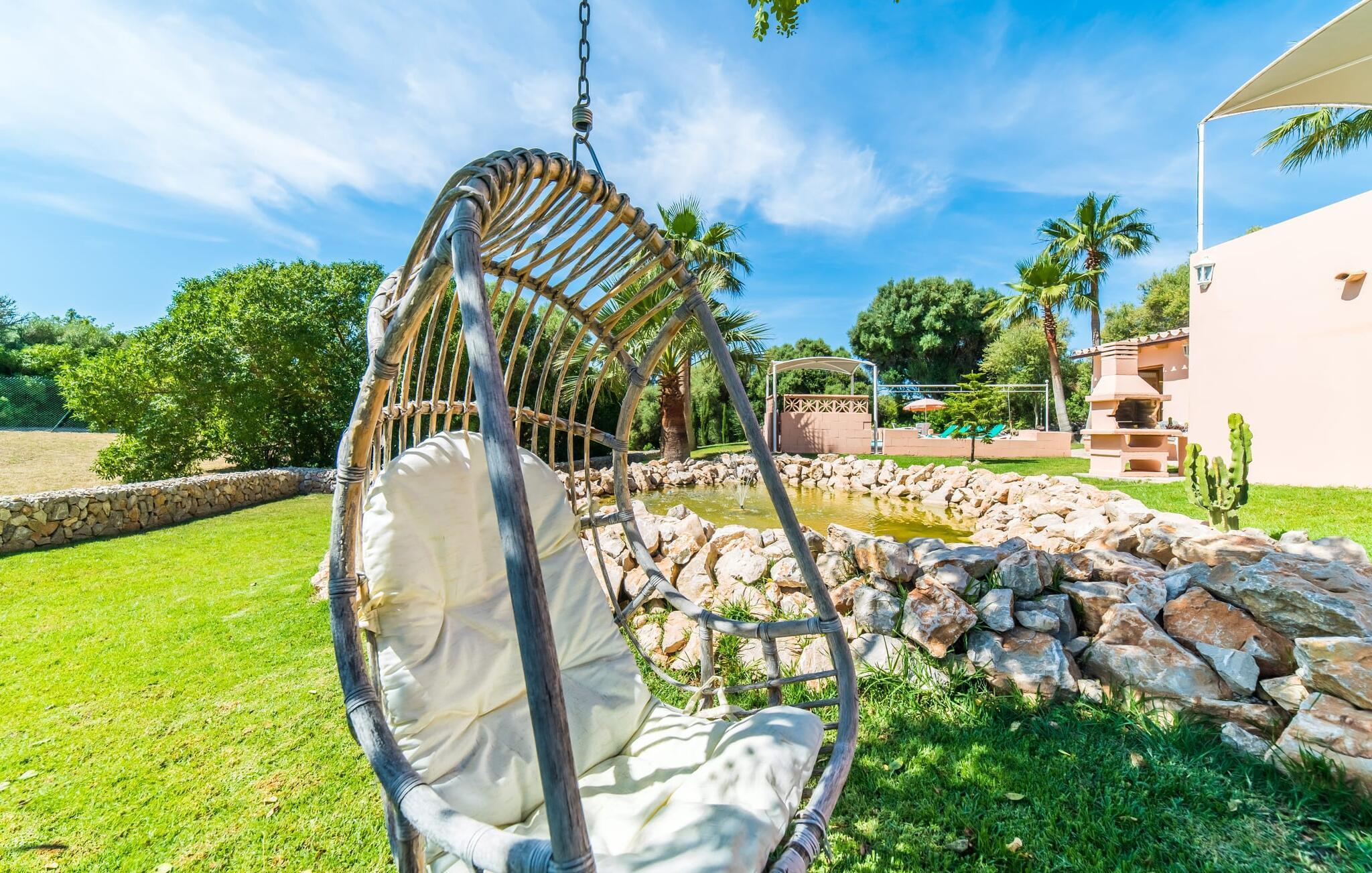 Sant Llorenç trägt aufgrund der von Distelsträuchern durchzogenen Landschaft den Beinamen „des Cardassar“ - bei den Disteln. Davon ist jedoch nichts zu merken, wenn man auf der schattigen Veranda von "Son Vives" sitzt und den Blick über den gepflegten Garten und den plätschernden Teich bis hin zu den Hügelkuppen in der Ferne schweifen lässt. Überall - ob am Haus oder am terrassenförmig angelegten Pool mit seinen Sonnenliegen - wurde an schattige Plätzchen gedacht, kleine Oasen mit Sonnenschutzhäubchen, wenn es draußen vor Hitze flirrt. Ideal auch, dass der Schwimmbereich mit Außendusche, Außenbad und Grill ein wenig für sich liegt, so dass Aktivität und Ruhebedürfnis einander nicht in die Quere kommen. In dem Außenbad befindet sich zudem ein kleiner Kühlschrank und Sie finden Entspannung in der Sauna (inklusive Schwallwasser und Kneippschlauch).