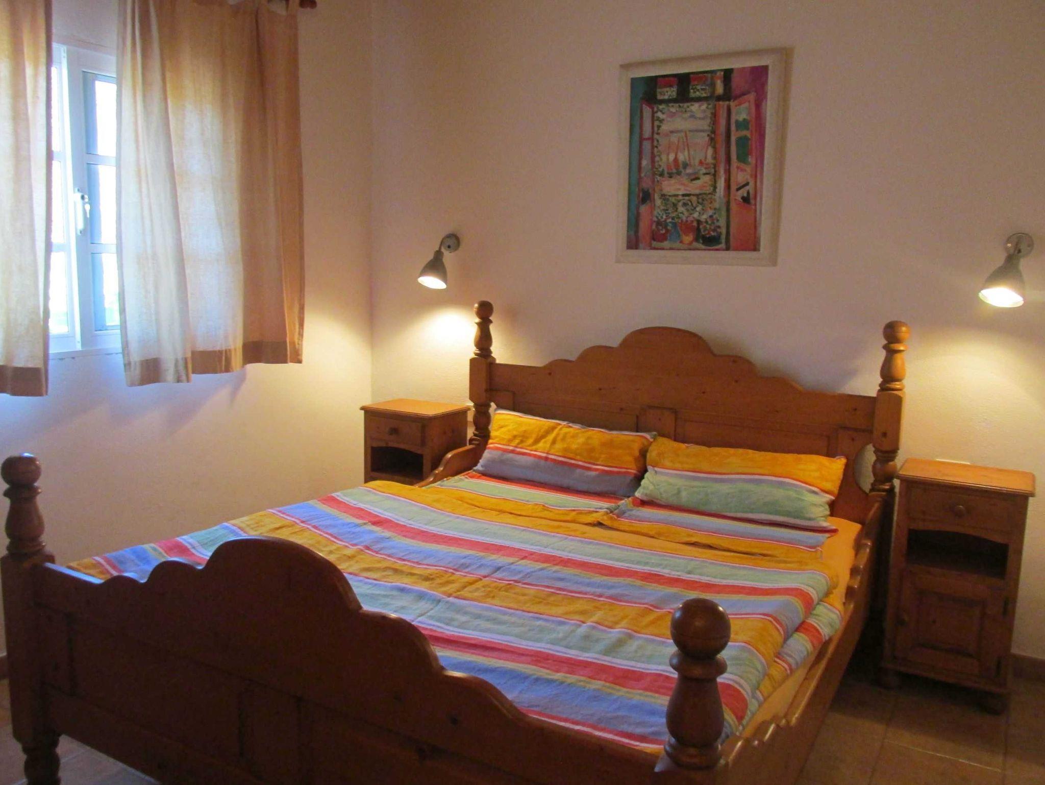 Das Schlafzimmer, zu dem es seitlich abgeht, verfügt ebenfalls über ein Massivholz-Doppelbett, Nachtische und großen Kleiderschrank sowie Fenster mit Meer-/Gartenblick und einer Tür zum Duschbad.