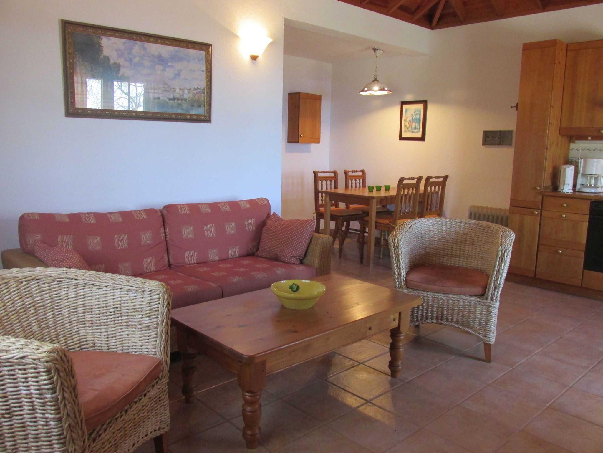 Haus A hat rechts den Wohnbereich mit Sofa und zwei schönen Korbflechtsesseln, einen Wohnzimmertisch, einen Tisch mit Flachbildfernseher und ein Regal mit Büchern sowie kleiner HiFi-Anlage. Linkerhand steht die Einbauküche, die bis auf Mikrowelle und Spülmaschine komplett ausgestattet ist. In einer schlauchförmigen Ausdehnung des Raumes steht separat der hübsche Essbreich mit großem Tisch und vier Stühlen. Am Kopfende geht die Tür zum Duschbad ab.