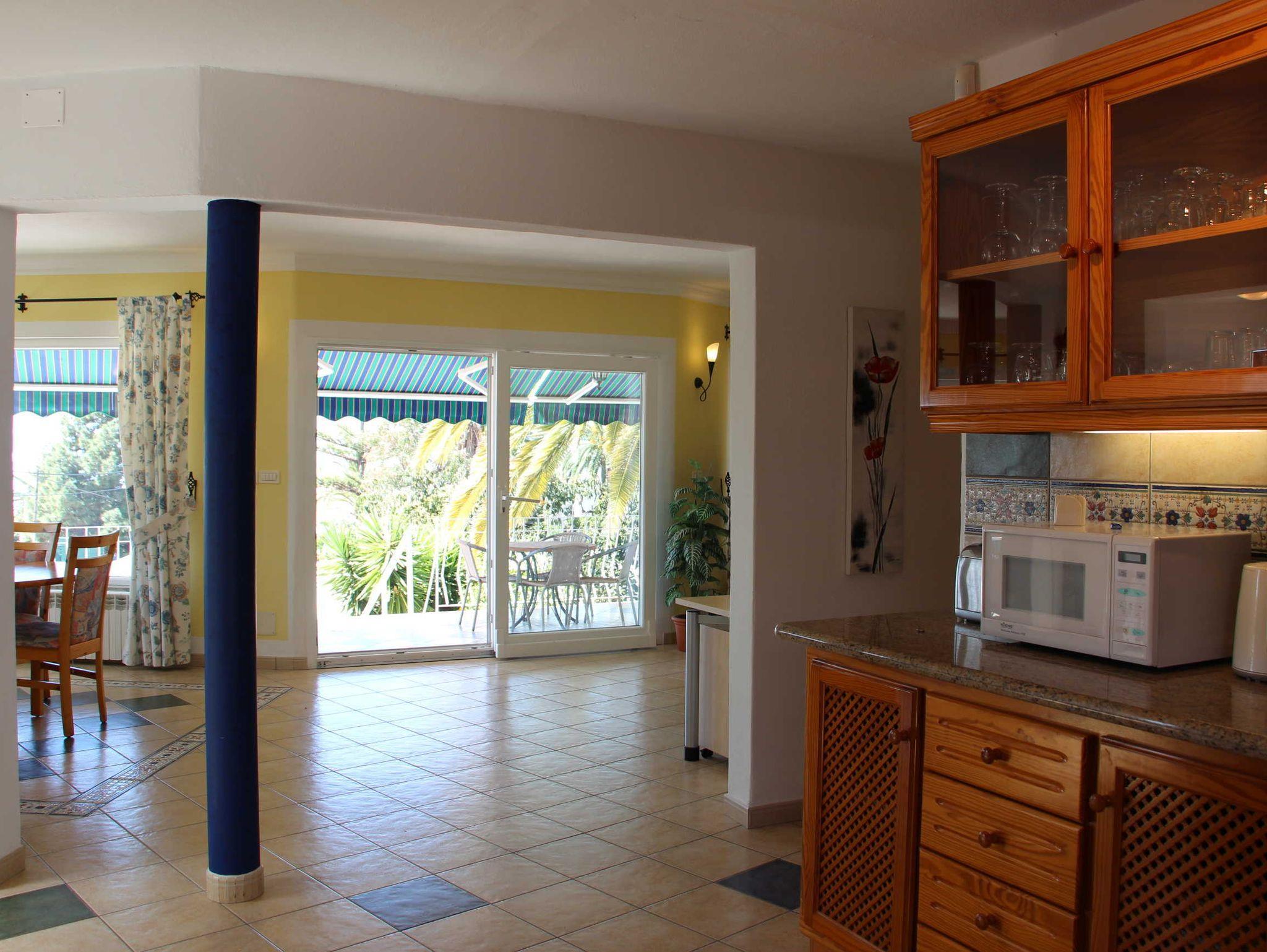 Durch einen breiten Türbogen blickt man in die halboffene Küche, die beidseitig mit Einbauschränken und hochwertigen Geräten bestückt ist. Ein Geschirrspüler ist selbstverständlich dabei. Auch von der Küche können Sie über eine Terrassentür ins Freie treten.