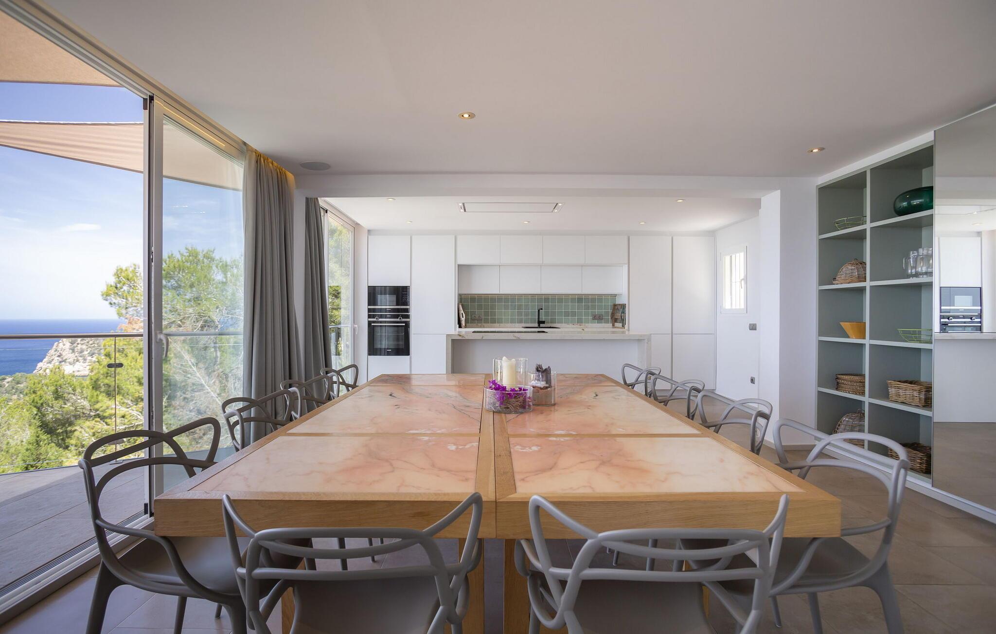 Diese atemberaubende, moderne Villa ist so konzipiert, dass sie sowohl Luxus als auch Komfort bietet, mit atemberaubendem Meerblick von fast jedem Zimmer aus. Das Erdgeschoss verfügt über einen offenen Grundriss mit einem geräumigen Wohnzimmer mit Kamin und Sonos-Stereoanlage, einem Essbereich für 12 Personen und einer voll ausgestatteten Küche – alles führt auf eine Terrasse mit Panoramablick auf das Meer.