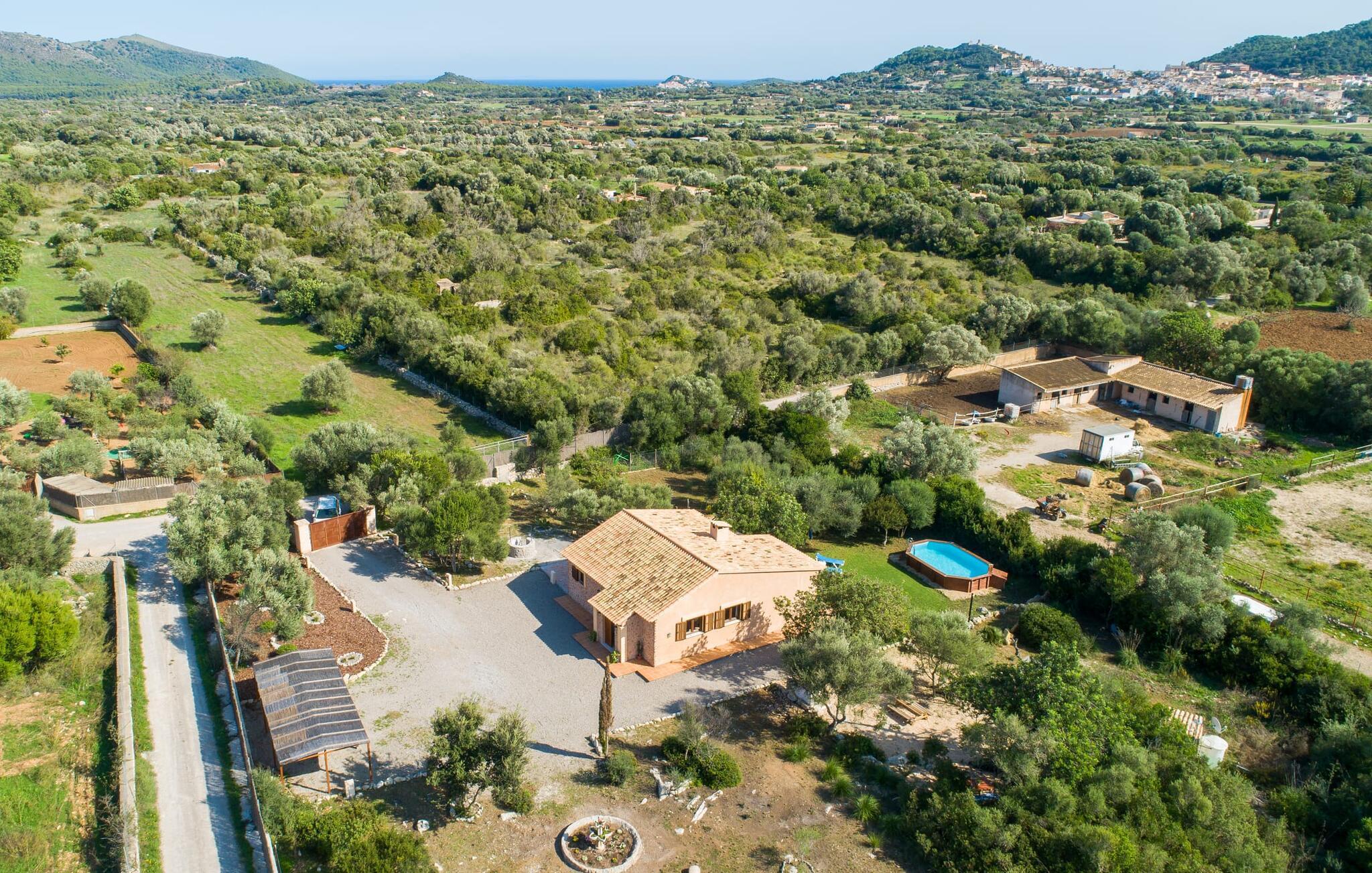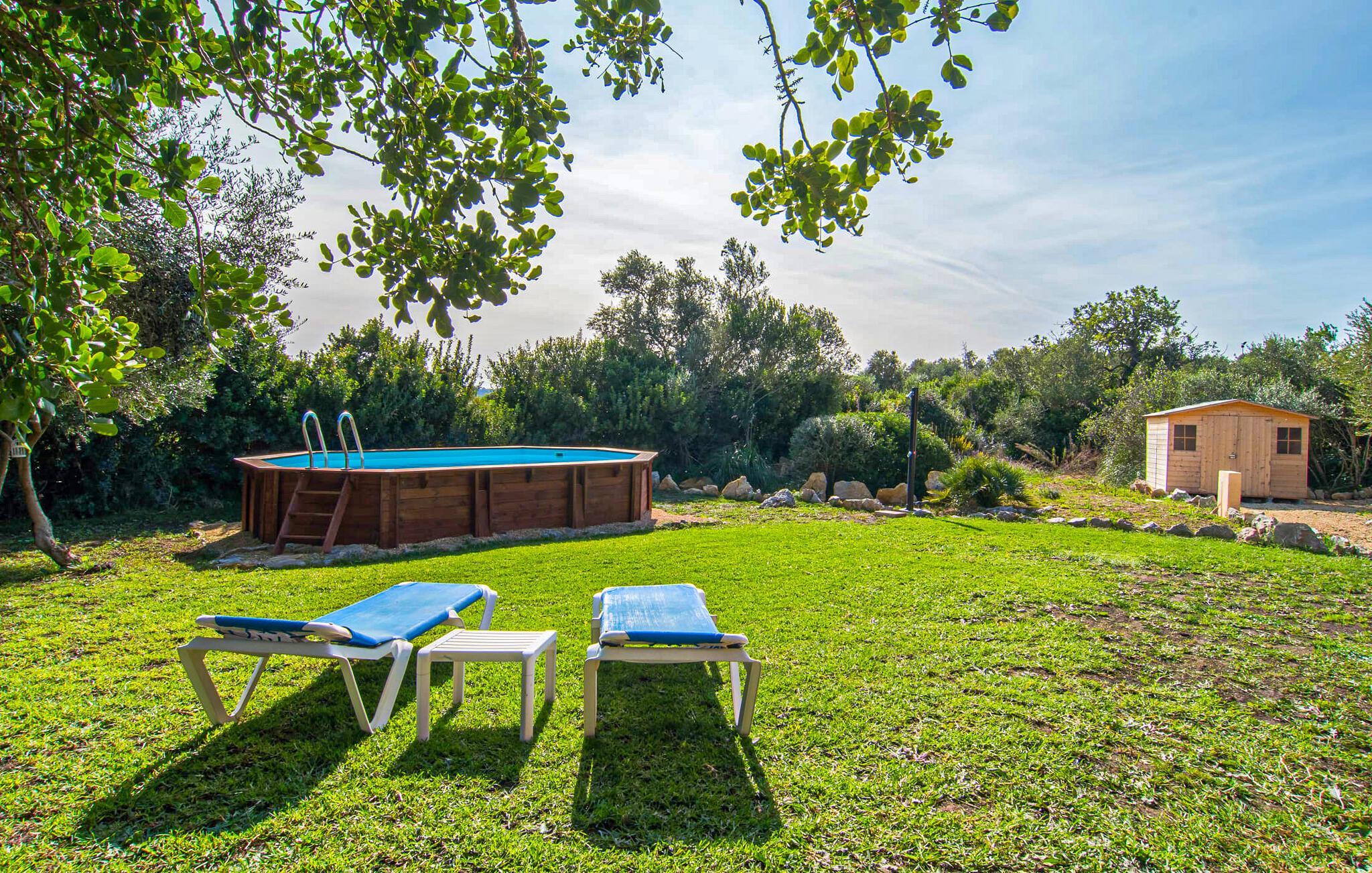 Die rustikale und dennoch moderne Finca verfügt über einen großzügigen oberirdischen Pool, der zum Abkühlen oder Entspannen einlädt. Genießen Sie ein Sonnenbad auf Liegestühlen, entspannen Sie in einem balinesischen Bett oder entspannen Sie in einer Hängematte. Der Außenbereich verfügt über einen mediterranen Garten, der Spielmöglichkeiten für kleine Kinder bietet, während ein gemauerter Grill und eine überdachte Terrasse das abendliche Beisammensein bereichern.
