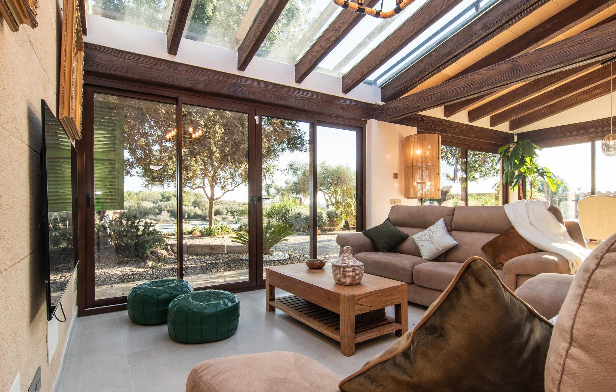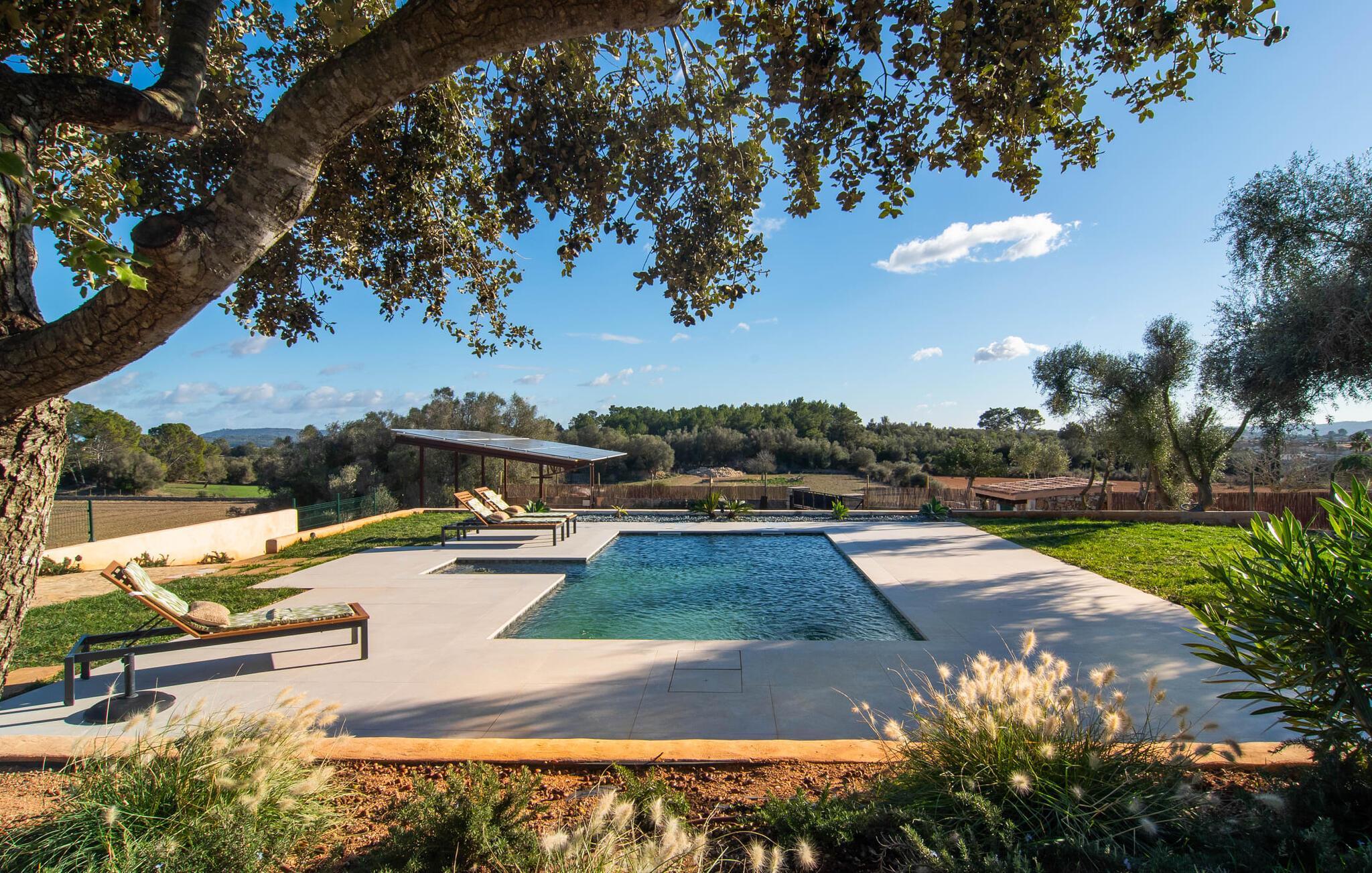 Der leicht terrassierte Bereich der Finca „Villa Xary“ bietet sehr gemütliche Ecken, um die Stunden im Freien zu genießen. Es gibt geräumige Bereiche mit bequemen Möbeln und einen Essbereich mit angenehm natürlichem Schatten durch die Bäume.