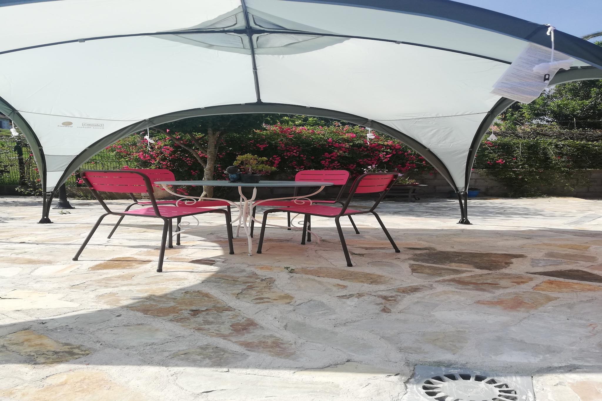 Ground floor: (Kitchenette(stove, combination microwave, fridge), Living/diningroom(double sofa bed(135 x 190 cm), TV, dining table), bedroom(double bed), bathroom(shower, washbasin)) TV, coffee machine, microwave, terrace, garden, garden furniture, sun loungers, BBQ, children's bed
