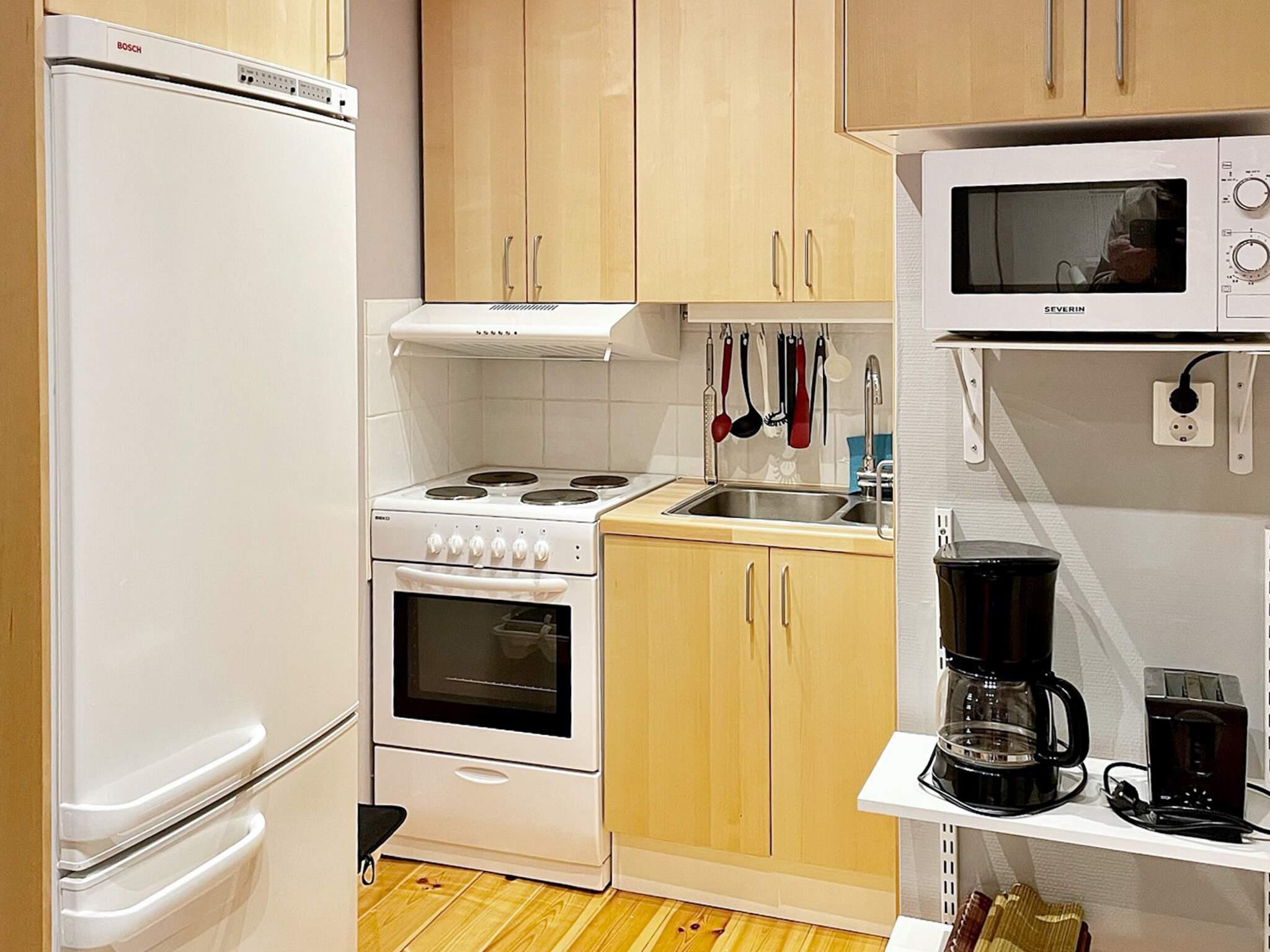Das Badezimmer besteht aus Dusche, WC und Waschbecken. Das Schlafzimmer hat zwei Etagenbetten mit insgesamt vier Kojen und ist offen mit dem Wohnzimmer verbunden. Die Küche ist etwas kleiner aber völlig ausreichend und hat alles was man sich wünscht. Draußen auf der Holzterrasse stehen Gartenmöbel und ein Holzkohlegrill für schöne Tage bereit.