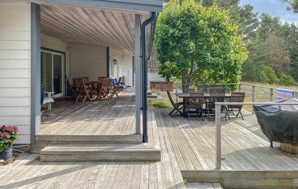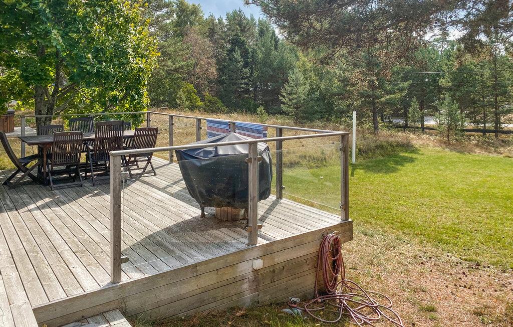 Treten Sie hinaus auf die große, teils überdachte Holzterrasse. Frühstücken Sie an der frischen Luft, grillen Sie mit der Familie oder Freunden und genießen Sie die Sonne auf den bequemen Liegestühlen. Der weitläufige Garten mit Bäumen und Wiesen bietet Platz zum Spielen und Entspannen in ruhiger Umgebung.