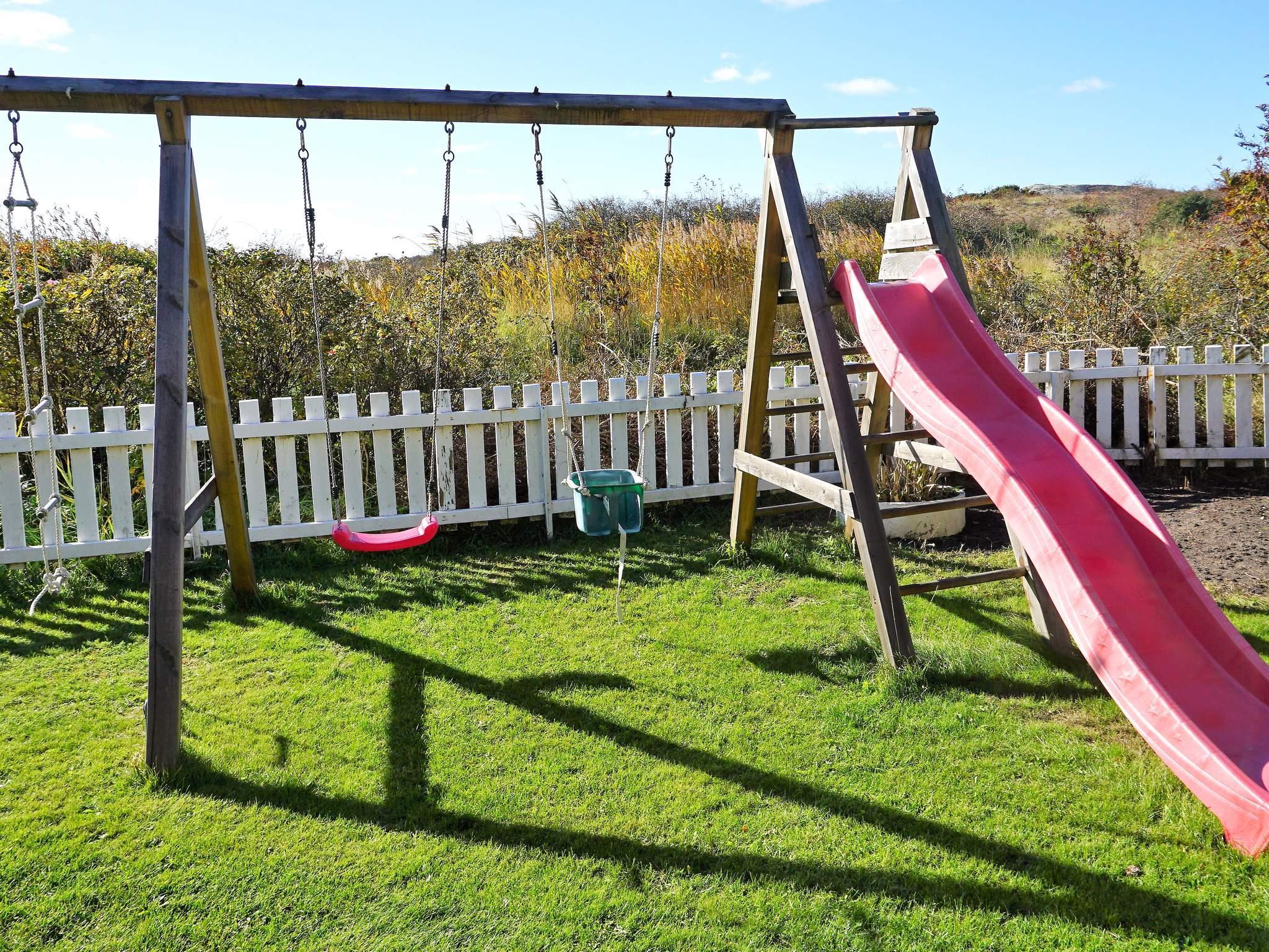 Für spielende Kinder stehen Schaukeln, Rutsche und Rasenfläche zur Verfügung. Die Kleinen lassen sich entspannt von der Holzterrasse des Hauses aus beaufsichtigen.