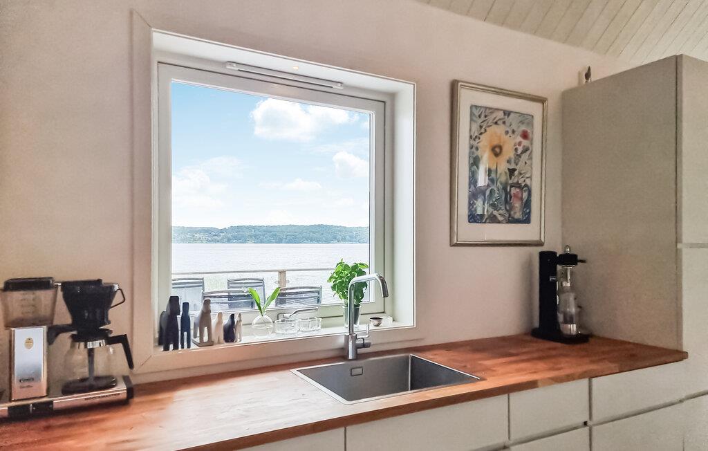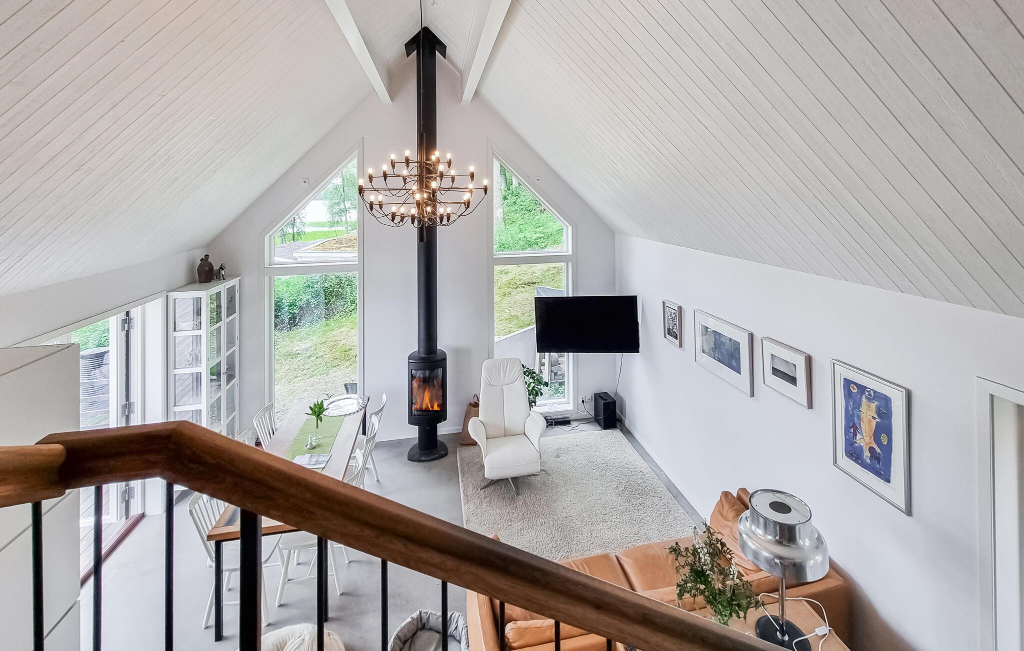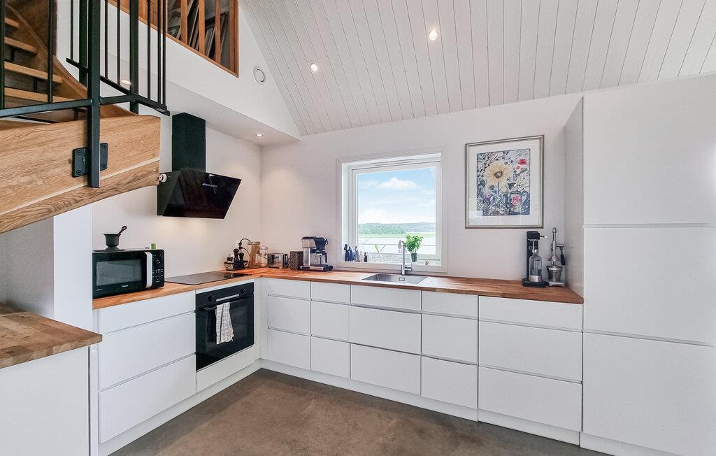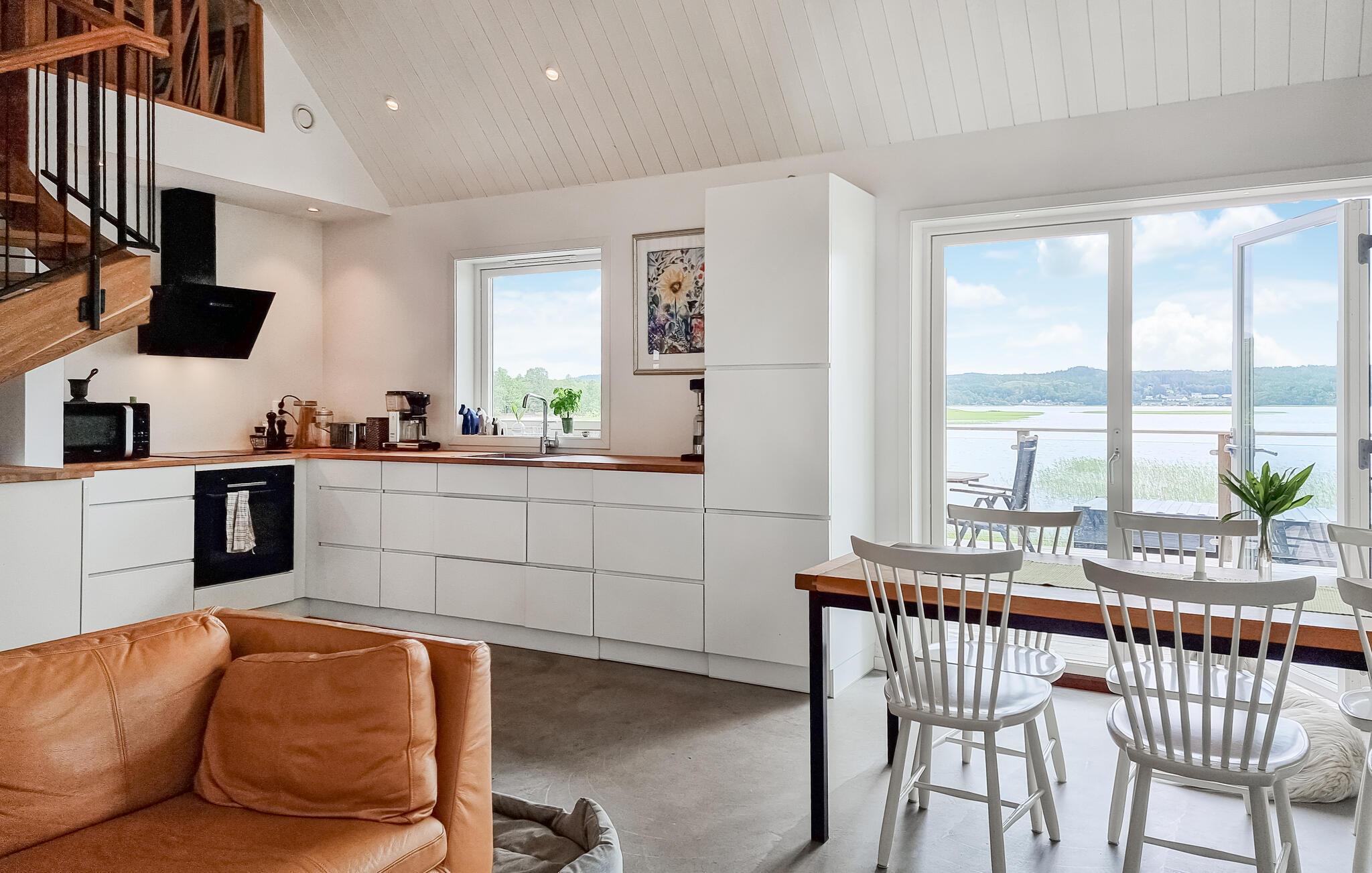 Genießen Sie die herrliche Aussicht auf den See, die Sie sowohl von der großzügigen Terrasse als auch aus dem Wohnbereich durch die großen Panoramafenster genießen können. Der helle, offen gestaltete Wohnraum mit Kamin schafft eine gemütliche Atmosphäre, ideal für entspannte Abende nach einem Tag voller Aktivitäten. Die moderne Küche ist gut ausgestattet und bietet Ihnen alles, was Sie für die Zubereitung köstlicher Mahlzeiten benötigen.