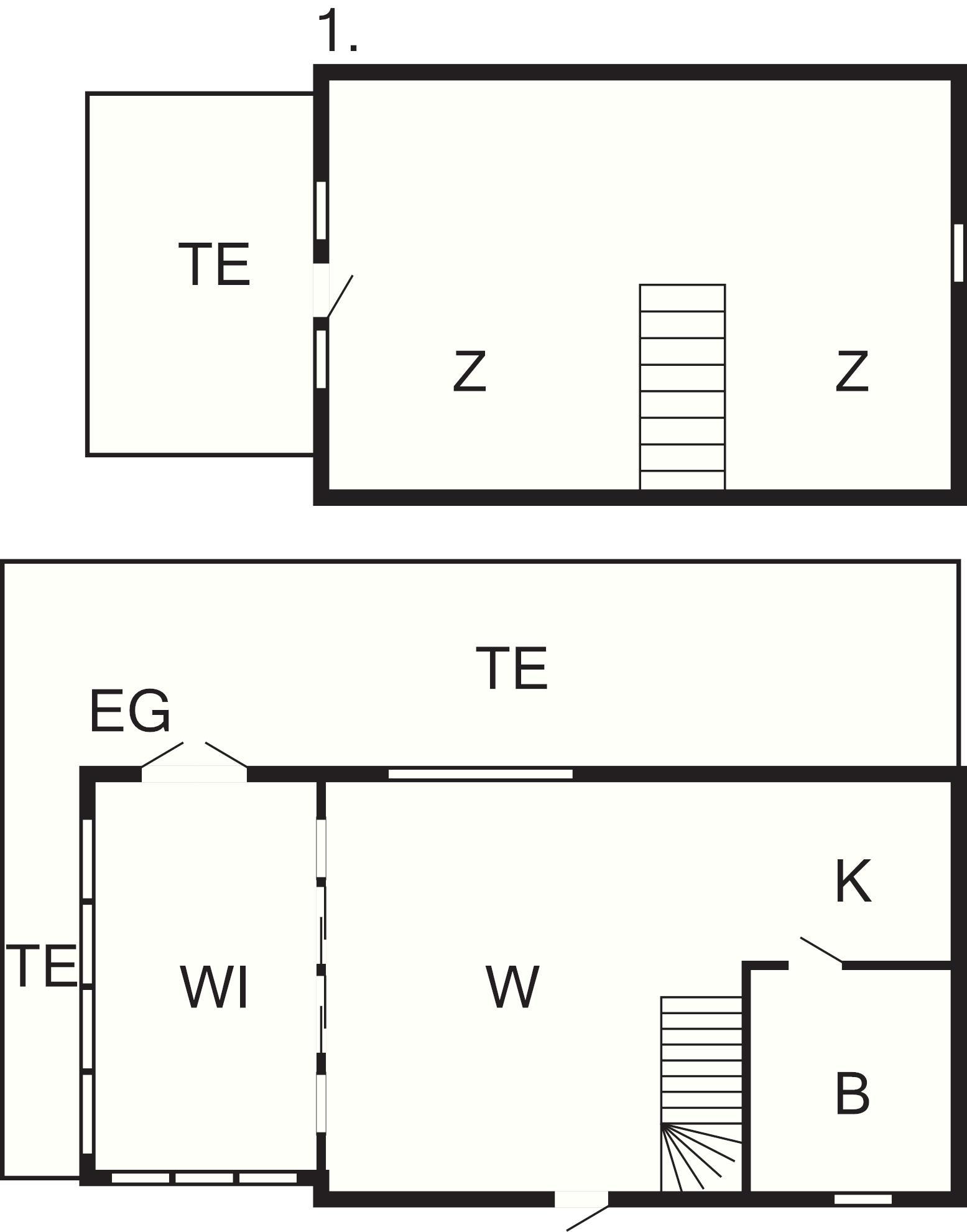 Off. Küche: Hochstuhl, E-Herd, Kühl-Gefrier-Kombi, Mikrow., Abzugsh., Kaffeem., Spülm.