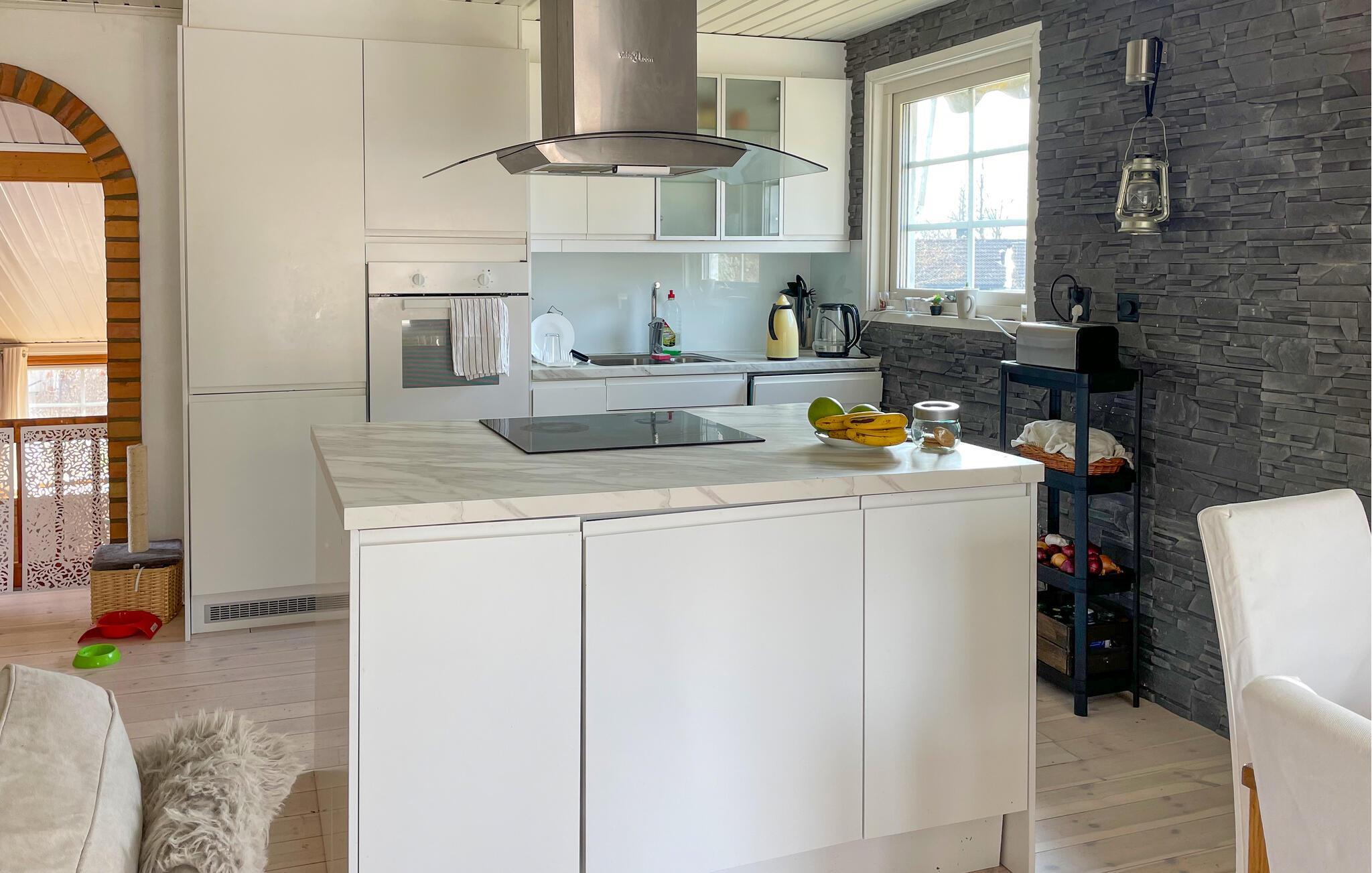 In Ihrem Ferienhaus, das nur einen kurzen Spaziergang vom idyllischen See Frisjön entfernt liegt, verbringen Sie entspannte Tage in der Natur. Genießen Sie die helle, freundliche Atmosphäre im großzügigen Wohnbereich mit gemütlichem Sofa, ideal für entspannte Abende vor dem Fernseher. Auch im Schaukelstuhl am Kaminofen lässt es sich gut relaxen. Kochen Sie in der offenen Küche mit Kochinsel Ihre Mahlzeiten und versammeln Sie sich anschließend am einladenden Esstisch, der Platz für die ganze Familie bietet. Große Fenster sorgen für viel Tageslicht und eröffnen einen schönen Blick auf die grüne Umgebung.