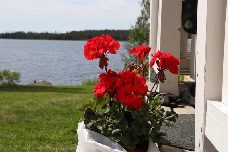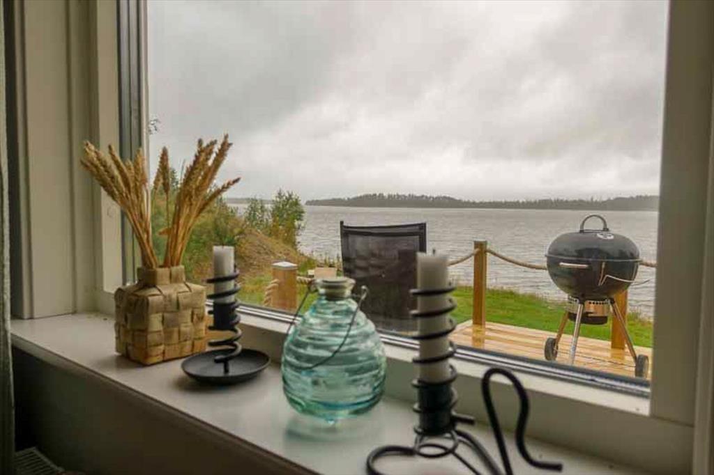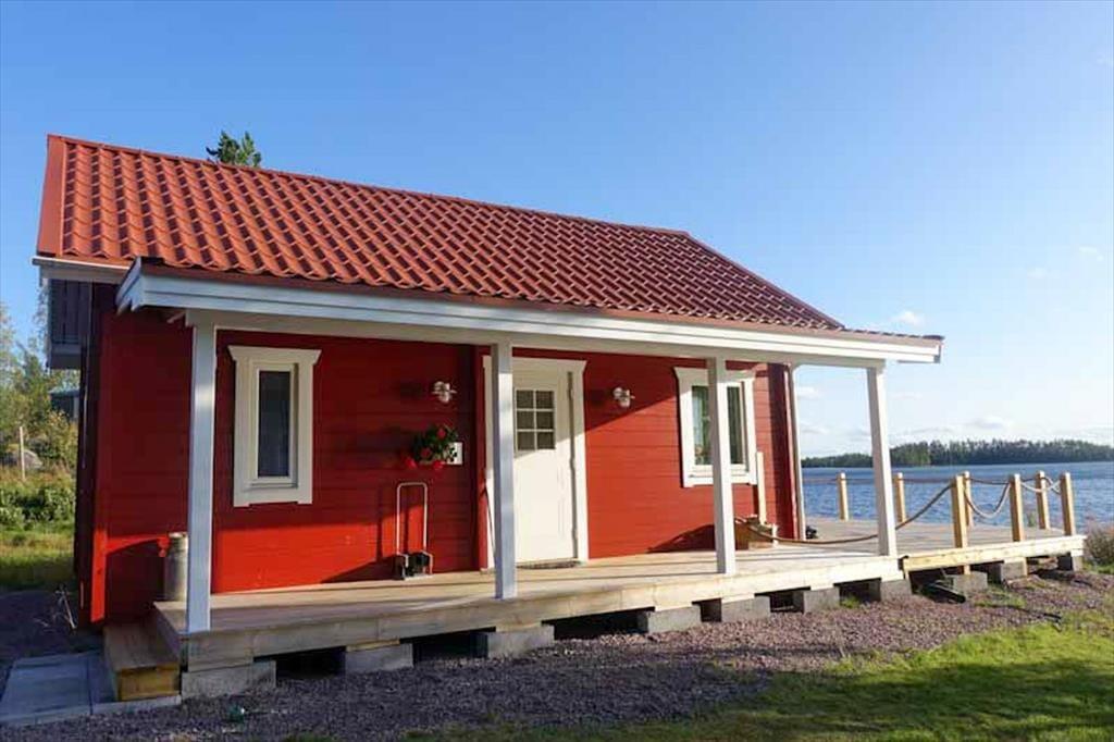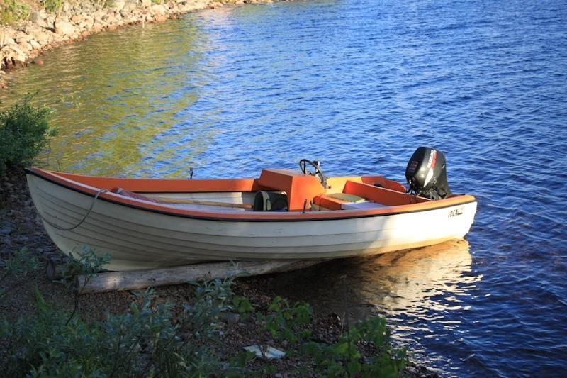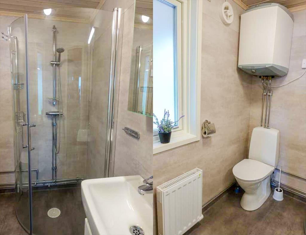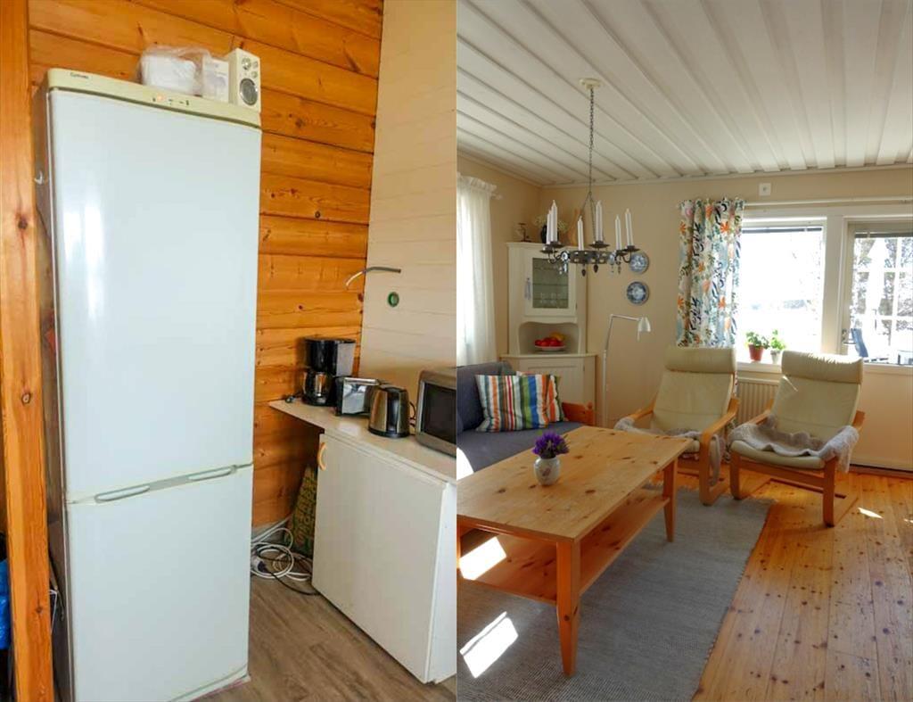 Ein attraktives Ferienhausensemble für zwei Paare, die gemeinsam, aber in getrennten Häusern, die Mitternachtssonne genießen wollen. Im oberen Teil des zum See hin leicht abfallenden Grundstücks befindet sich das Haupthaus mit einer auf der Seeseite vorgebauten großen Veranda, von der aus man einen herrlichen Blick über den See genießen kann. Mit einer Wohnfläche von etwa 46 m² bietet es Platz für drei Personen, für die zwei Schlafzimmer zur Verfügung stehen: eines mit Doppelbett, das andere mit einem Einzelbett möbliert. Eine in L-Form errichtete Küche mit Esstisch auf der gegenüberliegenden Seite am Fenster schließt mit einem schönen, alten Holzherd ab und geht über in einen gemütlichen Wohnbereich mit Sitzgruppe, Flat-TV, der über Chromecast auch deutsche Programme empfangen kann, sowie DVD- und Blue-ray-Player. Die Küche selbst ist mit Elektroherd mit Glaskeramikkochfeld und Backofen, Kühl-Gefrierkombination, Geschirrspüler, Mikrowelle und Kaffeemaschine ausgestattet. Außerdem gibt es ein Badezimmer mit Duschecke, WC, Handwaschbecken und Waschmaschine.