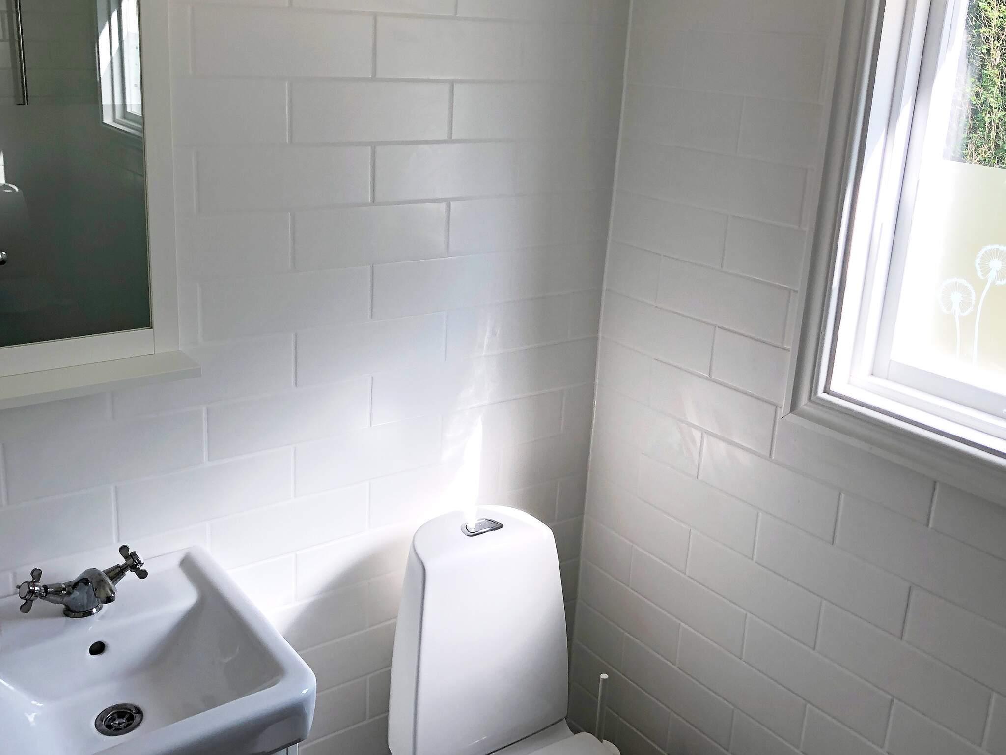 Ein zweiter Kachelofen befindet sich im Schlafzimmer im Erdgeschoss, mit zwei Einzelbetten und zwei Fenstern. Im Parterre gibt es zudem ein Badezimmer mit Fußbodenheizung und WC/Duschkabine sowie ein Fenster zur Rückseite des Hauses.